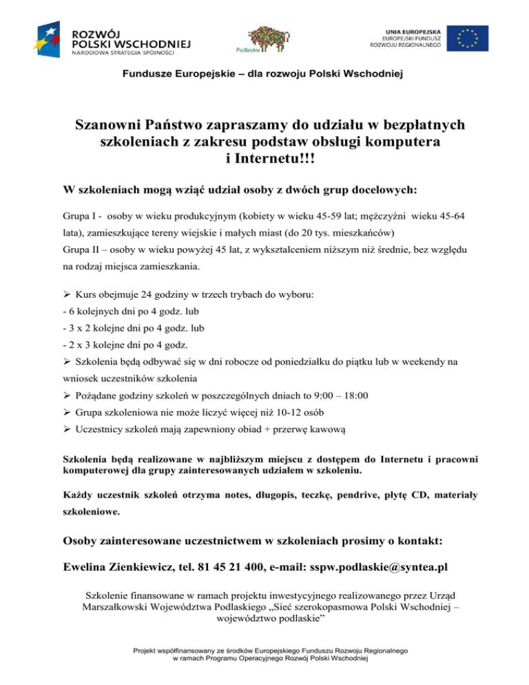 Fundusze Europejskie – dla rozwoju Polski Wschodniej Szanowni Państwo zapraszamy do udziału w bezpłatnych szkoleniach z zakresu podstaw obsługi komputera i Internetu!!! W szkoleniach mogą wziąć udział osoby z dwóch grup docelowych: Grupa I - osoby w wieku produkcyjnym (kobiety w wieku 45-59 lat; mężczyźni wieku 45-64 lata), zamieszkujące tereny wiejskie i małych miast (do 20 tys. mieszkańców) Grupa II – osoby w wieku powyżej 45 lat, z wyksztalceniem niższym niż średnie, bez względu na rodzaj miejsca zamieszkania. Kurs obejmuje 24 godziny w trzech trybach do wyboru: - 6 kolejnych dni po 4 godz. lub - 3 x 2 kolejne dni po 4 godz. lub - 2 x 3 kolejne dni po 4 godz. Szkolenia będą odbywać się w dni robocze od poniedziałku do piątku lub w weekendy na wniosek uczestników szkolenia Pożądane godziny szkoleń w poszczególnych dniach to 9:00 – 18:00 Grupa szkoleniowa nie może liczyć więcej niż 10-12 osób Uczestnicy szkoleń mają zapewniony obiad + przerwę kawową Szkolenia będą realizowane w najbliższym miejscu z dostępem do Internetu i pracowni komputerowej dla grupy zainteresowanych udziałem w szkoleniu. Każdy uczestnik szkoleń otrzyma notes, długopis, teczkę, pendrive, płytę CD, materiały szkoleniowe. Osoby zainteresowane uczestnictwem w szkoleniach prosimy o kontakt: Ewelina Zienkiewicz, tel. 81 45 21 400, e-mail: [email protected] Szkolenie finansowane w ramach projektu inwestycyjnego realizowanego przez Urząd Marszałkowski Województwa Podlaskiego „Sieć szerokopasmowa Polski Wschodniej – województwo podlaskie” Projekt współfinansowany ze środków Europejskiego Funduszu Rozwoju Regionalnego w ramach Programu Operacyjnego Rozwój Polski Wschodniej Fundusze Europejskie – dla rozwoju Polski Wschodniej Ankieta badania potrzeb szkoleniowych do Projektu Sieć Szerokopasmowa Polski Wschodniej – województwo podlaskie Dane osobowe Imię imiona Płeć Mężczyzna Data urodzenia Dane teleadresowe Województwo Ulica Nazwisko Kobieta Powiat/Gmina nr domu/ nr lokalu Kod pocztowy/ Poczta Miejscowość Miejski Obszar Telefon stacjonarny Adres e-mail Wykształcenie Wiejski Telefon komórkowy podstawowe gimnazjalne ponadgimnazjalne pomaturalne wyższe nie Osoba zatrudniona tak nie nie Osoba we wczesnym wieku emerytalnym tak nie Status na rynku pracy Osoba bezrobotna Inny tak tak Czy byłby Pan/Pani zainteresowany/a udziałem w szkoleniu, które zawierałoby poniżej przedstawione zagadnienia: Obsługa komputera i podstawowych programów (edytowanie tekstów, wydruk, zapisywanie ich na dysku i przesyłanie e-mailem); Obsługa portali społecznościowych (Facebook, Tweeter, Nasza Klasa) i komunikatorów typu gadu-gadu, Skype itp.; Zastosowanie Internetu (np. planowanie podróży za pomocą google maps, zakładanie skrzynek mailowych, obsługa programu Outlook, korzystanie z przeglądarek internetowych) Elektroniczne usługi i użytkowanie aplikacji wykorzystujących e-formularze (zakupy w sieci, obsługa kont bankowych, rejestracja wizyt w przychodniach), ZIP, ePUAP, rozkłady jazdy PKP/PKS; Tworzenie i prowadzenie bloga; tak nie Proszę wskazać najbardziej odpowiadający Panu/Pani tryb odbywania szkoleń? 6 jednodniowych spotkań (6 dni pracujących z rzędu) po 4h 3 dwudniowe spotkania (2 dni z rzędu, przerwa, 2 dni z rzędu, przerwa, 2 dni z rzędu) po 4h 2 trzydniowe spotkania (3 dni z rzędu, przerwa, 3 dni z rzędu) po 4h Projekt współfinansowany ze środków Europejskiego Funduszu Rozwoju Regionalnego w ramach Programu Operacyjnego Rozwój Polski Wschodniej Fundusze Europejskie – dla rozwoju Polski Wschodniej Proszę o wskazanie najbardziej odpowiadającego Panu/Pani miesiąca odbywania się szkoleń? …………………………………………………………………………………………………………………………….. Czy mają Państwo uwagi co do zaproponowanego trybu szkoleń? …………………………………………………………………………………………………………………………….. Ja niżej podpisany, deklaruję swój udział w Szkoleniu w ramach projektu „Sieć Szerokopasmowa Polski Wschodniej – województwo podlaskie”. Wyrażam zgodę na przetwarzanie moich danych osobowych dla celów rekrutacji, zgodnie z ustawą z dnia 29 sierpnia 1997 r. o ochronie danych osobowych (tj. Dz. U. Nr 101 z 2002 r., poz. 926 z późn. zm.). ………………………………………………… Miejscowość, data ……………………………………………… podpis Projekt współfinansowany ze środków Europejskiego Funduszu Rozwoju Regionalnego w ramach Programu Operacyjnego Rozwój Polski Wschodniej