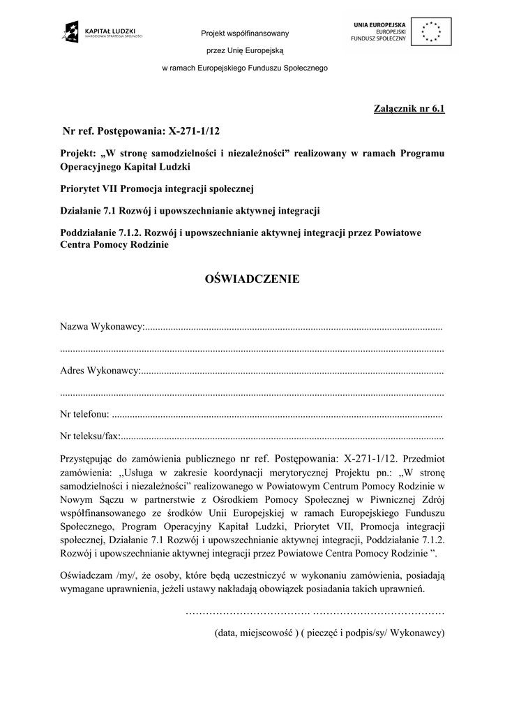 Projekt współfinansowany przez Unię Europejską w ramach Europejskiego Funduszu Społecznego Załącznik nr 6.1 Nr ref. Postępowania: X-271-1/12 Projekt: „W stronę samodzielności i niezależności” realizowany w ramach Programu Operacyjnego Kapitał Ludzki Priorytet VII Promocja integracji społecznej Działanie 7.1 Rozwój i upowszechnianie aktywnej integracji Poddziałanie 7.1.2. Rozwój i upowszechnianie aktywnej integracji przez Powiatowe Centra Pomocy Rodzinie OŚWIADCZENIE Nazwa Wykonawcy:..................................................................................................................... ....................................................................................................................................................... Adres Wykonawcy:....................................................................................................................... ....................................................................................................................................................... Nr telefonu: .................................................................................................................................. Nr teleksu/fax:............................................................................................................................... Przystępując do zamówienia publicznego nr ref. Postępowania: X-271-1/12. Przedmiot zamówienia: ,,Usługa w zakresie koordynacji merytorycznej Projektu pn.: „W stronę samodzielności i niezależności” realizowanego w Powiatowym Centrum Pomocy Rodzinie w Nowym Sączu w partnerstwie z Ośrodkiem Pomocy Społecznej w Piwnicznej Zdrój współfinansowanego ze środków Unii Europejskiej w ramach Europejskiego Funduszu Społecznego, Program Operacyjny Kapitał Ludzki, Priorytet VII, Promocja integracji społecznej, Działanie 7.1 Rozwój i upowszechnianie aktywnej integracji, Poddziałanie 7.1.2. Rozwój i upowszechnianie aktywnej integracji przez Powiatowe Centra Pomocy Rodzinie ”. Oświadczam /my/, że osoby, które będą uczestniczyć w wykonaniu zamówienia, posiadają wymagane uprawnienia, jeżeli ustawy nakładają obowiązek posiadania takich uprawnień. ………………………………. ………………………………… (data, miejscowość ) ( pieczęć i podpis/sy/ Wykonawcy) Projekt współfinansowany przez Unię Europejską w ramach Europejskiego Funduszu Społecznego Załącznik nr 6.2 /PROJEKT/WZÓR UMOWY/ UMOWA nr……………………………..12 Umowa zawarta w dniu …………………… r. w Nowym Sączu w ramach w ramach Projektu pn: ”W stronę samodzielności i niezależności” pomiędzy: Powiatowe Centrum Pomocy Rodzinie w Nowym Sączu, ul. Kilińskiego 72A, 33-300 Nowy Sącz , zwanym dalej „Zamawiającym” reprezentowanym przez - Dyrektora Powiatowego Centrum Pomocy Rodzinie w Nowym Sączu oraz – Głównego Księgowego a …………………………………………………………………………………, zwanym dalej „Wykonawcą ” Zamówienie publiczne –pn: Usługa w zakresie koordynacji merytorycznej Projektu pn.: „W stronę samodzielności i niezależności” realizowanego w Powiatowym Centrum Pomocy Rodzinie w Nowym Sączu w partnerstwie z Ośrodkiem Pomocy Społecznej w Piwnicznej Zdrój współfinansowanego ze środków Unii Europejskiej w ramach Europejskiego Funduszu Społecznego, Program Operacyjny Kapitał Ludzki, Priorytet VII, Promocja integracji społecznej, Działanie 7.1 Rozwój i upowszechnianie aktywnej integracji, Poddziałanie 7.1.2. Rozwój i upowszechnianie aktywnej integracji przez Powiatowe Centra Pomocy Rodzinie. Projekt współfinansowany przez Unię Europejską w ramach Europejskiego Funduszu Społecznego § 1. Przedmiot umowy 1. Przedmiotem niniejszej umowy jest pełnienie przez Wykonawcę na rzecz Zamawiającego, roli koordynatora merytorycznego Projektu pn: „W stronę samodzielności i niezależności” współfinansowanego przez Unię Europejską w ramach Europejskiego Funduszu Społecznego tj. 1. Sprawowanie nadzoru merytorycznego nad realizacją Projektu i w tym zakresie współpraca z pracownikami Zamawiającego: pracownikami socjalnymi, doradcami ds. osób niepełnosprawnych w zakresie zgodności wykonywanych działań z zakresem merytorycznym Projektu. 2. Zarządzanie planowanymi działaniami merytorycznymi Projektu – całościowa opieka merytoryczna nad Projektem. 3. Kontrola prawidłowej merytorycznej realizacji harmonogramu działań zgodnie z założeniami projektu. 4. Utrzymywanie bieżącego kontaktu w sprawach merytorycznych z WUP w Krakowie jako Instytucją Pośredniczącą. 5. Stały kontakt z Partnerem Projektu, jakim jest Ośrodek Pomocy Społecznej w Piwnicznej Zdrój. 6. Kontakt z organizacjami i instytucjami współpracującymi przy realizacji Projektu. 7. Informowanie Partnera o istotnych zmianach wynikających z wytycznych POKL, mających wpływ na realizację Projektu. 8. Nadzór nad procesem monitoringu i ewaluacji projektu. 9. Nadzór oraz współrealizacja promocji Projektu. 10. Nadzór merytoryczny w zakresie zgodności działań struktury zarządzania Projektem oraz realizacją Projektu z zapisami wniosku o dofinansowanie. 11. Nadzór merytoryczny nad stroną internetową Projektu. 12.Przygotowanie organizacyjne działań w ramach zadania 1 pn. „Aktywna integracja” we wniosku o dofinansowanie. 13.Przygotowanie ewentualnych wyjaśnień w trakcie kontroli związanych z realizacją Projektu. 14. Inne czynności przewidziane w zapisach wniosku o dofinansowanie oraz harmonogramie. Projekt współfinansowany przez Unię Europejską w ramach Europejskiego Funduszu Społecznego § 2. 1. Zadania objęte zakresem umowy będą powierzane osobiście. Wraz z powierzeniem zadań Zamawiający zobowiązuje się dostarczyć Wykonawcy informacje niezbędne do realizacji zakresu umowy. 2. Zadania powierzone Wykonawcy przez Zamawiającego, ok