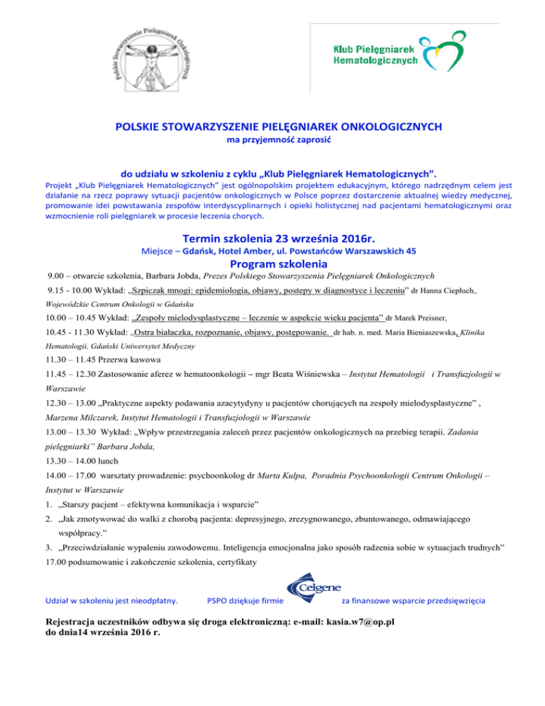 POLSKIE STOWARZYSZENIE PIELĘGNIAREK ONKOLOGICZNYCH ma przyjemność zaprosić do udziału w szkoleniu z cyklu „Klub Pielęgniarek Hematologicznych”. Projekt „Klub Pielęgniarek Hematologicznych” jest ogólnopolskim projektem edukacyjnym, którego nadrzędnym celem jest działanie na rzecz poprawy sytuacji pacjentów onkologicznych w Polsce poprzez dostarczenie aktualnej wiedzy medycznej, promowanie idei powstawania zespołów interdyscyplinarnych i opieki holistycznej nad pacjentami hematologicznymi oraz wzmocnienie roli pielęgniarek w procesie leczenia chorych. Termin szkolenia 23 września 2016r. Miejsce – Gdańsk, Hotel Amber, ul. Powstańców Warszawskich 45 Program szkolenia 9.00 – otwarcie szkolenia, Barbara Jobda, Prezes Polskiego Stowarzyszenia Pielęgniarek Onkologicznych 9.15 - 10.00 Wykład: „Szpiczak mnogi: epidemiologia, objawy, postepy w diagnostyce i leczeniu” dr Hanna Ciepłuch,, Wojewódzkie Centrum Onkologii w Gdańsku 10.00 – 10.45 Wykład: „Zespoły mielodysplastyczne – leczenie w aspekcie wieku pacjenta” dr Marek Preisner, 10.45 - 11.30 Wykład: „Ostra białaczka, rozpoznanie, objawy, postępowanie. dr hab. n. med. Maria Bieniaszewska, Klinika Hematologii, Gdański Uniwersytet Medyczny 11.30 – 11.45 Przerwa kawowa 11.45 – 12.30 Zastosowanie aferez w hematoonkologii – mgr Beata Wiśniewska – Instytut Hematologii i Transfuzjologii w Warszawie 12.30 – 13.00 „Praktyczne aspekty podawania azacytydyny u pacjentów chorujących na zespoły mielodysplastyczne” , Marzena Milczarek, Instytut Hematologii i Transfuzjologii w Warszawie 13.00 – 13.30 Wykład: „Wpływ przestrzegania zaleceń przez pacjentów onkologicznych na przebieg terapii. Zadania pielęgniarki” Barbara Jobda, 13.30 – 14.00 lunch 14.00 – 17.00 warsztaty prowadzenie: psychoonkolog dr Marta Kulpa, Poradnia Psychoonkologii Centrum Onkologii – Instytut w Warszawie 1. „Starszy pacjent – efektywna komunikacja i wsparcie” 2. „Jak zmotywować do walki z chorobą pacjenta: depresyjnego, zrezygnowanego, zbuntowanego, odmawiającego współpracy.” 3. „Przeciwdziałanie wypaleniu zawodowemu. Inteligencja emocjonalna jako sposób radzenia sobie w sytuacjach trudnych” 17.00 podsumowanie i zakończenie szkolenia, certyfikaty Udział w szkoleniu jest nieodpłatny. PSPO dziękuje firmie za finansowe wsparcie przedsięwzięcia Rejestracja uczestników odbywa się droga elektroniczną: e-mail: [email protected] do dnia14 września 2016 r.