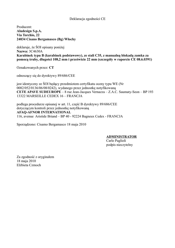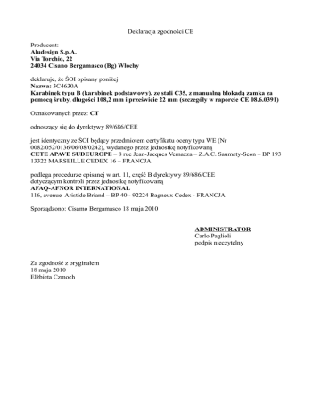 Deklaracja zgodności CE Producent: Aludesign S.p.A. Via Torchio, 22 24034 Cisano Bergamasco (Bg) Włochy deklaruje, że ŚOI opisany poniżej Nazwa: 3C4630A Karabinek typu B (karabinek podstawowy), ze stali C35, z manualną blokadą zamka za pomocą śruby, długości 108,2 mm i prześwicie 22 mm (szczegóły w raporcie CE 08.6.0391) Oznakowanych przez: CT odnoszący się do dyrektywy 89/686/CEE jest identyczny ze ŚOI będący przedmiotem certyfikatu oceny typu WE (Nr 0082/052/0136/06/08/0242), wydanego przez jednostkę notyfikowaną CETE APAVE SUDEUROPE – 8 rue Jean-Jacques Vernazza – Z.A.C. Saumaty-Seon – BP 193 13322 MARSEILLE CEDEX 16 – FRANCJA podlega procedurze opisanej w art. 11, część B dyrektywy 89/686/CEE dotyczącym kontroli przez jednostkę notyfikowaną AFAQ-AFNOR INTERNATIONAL 116, avenue Aristide Briand – BP 40 - 92224 Bagneux Cedex - FRANCJA Sporządzono: Cisamo Bergamasco 18 maja 2010 ADMINISTRATOR Carlo Paglioli podpis nieczytelny Za zgodność z oryginałem 18 maja 2010 Elżbieta Czmoch