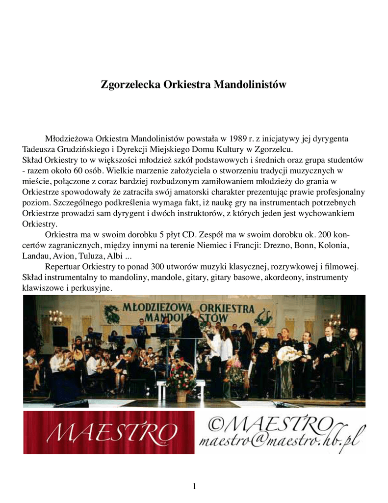 Zgorzelecka Orkiestra Mandolinistów Młodzieżowa Orkiestra Mandolinistów powstała w 1989 r. z inicjatywy jej dyrygenta Tadeusza Grudzińskiego i Dyrekcji Miejskiego Domu Kultury w Zgorzelcu. Skład Orkiestry to w większości młodzież szkół podstawowych i średnich oraz grupa studentów - razem około 60 osób. Wielkie marzenie założyciela o stworzeniu tradycji muzycznych w mieście, połączone z coraz bardziej rozbudzonym zamiłowaniem młodzieży do grania w Orkiestrze spowodowały że zatraciła swój amatorski charakter prezentując prawie profesjonalny poziom. Szczególnego podkreślenia wymaga fakt, iż naukę gry na instrumentach potrzebnych Orkiestrze prowadzi sam dyrygent i dwóch instruktorów, z których jeden jest wychowankiem Orkiestry. Orkiestra ma w swoim dorobku 5 płyt CD. Zespół ma w swoim dorobku ok. 200 koncertów zagranicznych, między innymi na terenie Niemiec i Francji: Drezno, Bonn, Kolonia, Landau, Avion, Tuluza, Albi ... Repertuar Orkiestry to ponad 300 utworów muzyki klasycznej, rozrywkowej i filmowej. Skład instrumentalny to mandoliny, mandole, gitary, gitary basowe, akordeony, instrumenty klawiszowe i perkusyjne. 1