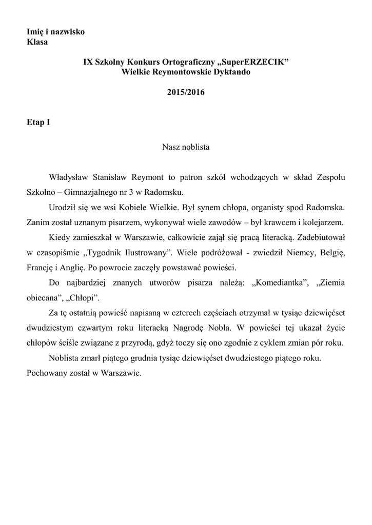 Imię i nazwisko Klasa IX Szkolny Konkurs Ortograficzny „SuperERZECIK” Wielkie Reymontowskie Dyktando 2015/2016 Etap I Nasz noblista Władysław Stanisław Reymont to patron szkół wchodzących w skład Zespołu Szkolno – Gimnazjalnego nr 3 w Radomsku. Urodził się we wsi Kobiele Wielkie. Był synem chłopa, organisty spod Radomska. Zanim został uznanym pisarzem, wykonywał wiele zawodów – był krawcem i kolejarzem. Kiedy zamieszkał w Warszawie, całkowicie zajął się pracą literacką. Zadebiutował w czasopiśmie „Tygodnik Ilustrowany”. Wiele podróżował - zwiedził Niemcy, Belgię, Francję i Anglię. Po powrocie zaczęły powstawać powieści. Do najbardziej znanych utworów pisarza należą: „Komediantka”, „Ziemia obiecana”, „Chłopi”. Za tę ostatnią powieść napisaną w czterech częściach otrzymał w tysiąc dziewięćset dwudziestym czwartym roku literacką Nagrodę Nobla. W powieści tej ukazał życie chłopów ściśle związane z przyrodą, gdyż toczy się ono zgodnie z cyklem zmian pór roku. Noblista zmarł piątego grudnia tysiąc dziewięćset dwudziestego piątego roku. Pochowany został w Warszawie. Imię i nazwisko Klasa IX Szkolny Konkurs Ortograficzny „SuperERZECIK” Wielkie Reymontowskie Dyktando 2015/2016 Etap II Radomszczański powieściopisarz Władysław Stanisław Reymont właściwie nazywał się Rejment. Miał zostać krawcem, lecz plany ojca nigdy nie doszły do skutku. Młody Władek interesował się teatrem i nawet przyłączył się do wędrownej trupy teatralnej. Pracował też na kolei, ale krótko. Od tysiąc osiemset dziewięćdziesiątego trzeciego roku tworzył w Warszawie. Powstawały wówczas szkice, nowele, opowiadania drukowane na łamach warszawskich czasopism. Reymont był wnikliwym obserwatorem życia społecznego, a doskonała pamięć do szczegółów umożliwiała mu wierne ich przedstawianie w powieściach. Jego twórczość jest bardzo różna. Bohaterami swoich utworów czynił chłopów, mieszczan, szlachciców, ale i robotników, fabrykantów oraz aktorów. W powieści pt. „Chłopi” przedstawił panoramę wsi polskiej z prastarymi tradycjami i obrzędami. Natomiast w utworze „Ziemia obiecana” pokazał Łódź z przełomu wieków. To fabryczne miasto uczynił głównym bohaterem powieści. Losy Polaka, Niemca i Żyda splatają się razem, aby zilustrować przemiany dokonujące się w przemyśle i ówczesnym społeczeństwie. Co roku, w grudniu obchodzimy w szkole Dni Patrona. Odwiedzamy wtedy pomnik powieściopisarza na skwerze przy ulicach: Narutowicza, Kościuszki i Mickiewicza. Składamy kwiaty i zapalamy znicze. Po prostu pamiętamy.