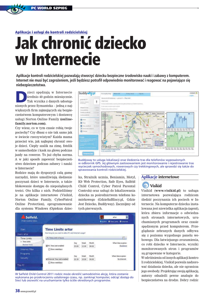 PC WORLD SZPIEG Aplikacje i usługi do kontroli rodzicielskiej Jak chronić dziecko w Internecie Aplikacje kontroli rodzicielskiej pozwalają stworzyć dziecku bezpieczne środowisko nauki i zabawy z komputerem. Internet nie musi być zagrożeniem, jeśli będziesz potrafił odpowiednio monitorować i reagować na pojawiające się niebezpieczeństwa. D zieci spędzają w Internecie średnio 40 godzin miesięcznie. Tak wynika z danych udostępnionych przez Symanteka – jedną z największych firm zajmujących się bezpieczeństwem komputerowym i dostawcę usługi Norton Online Family (onlinefamily.norton.com). Czy wiesz, co w tym czasie robią twoje pociechy? Czy dbasz o nie tak samo jak w świecie rzeczywistym? Każda mama przecież wie, jak najlepiej chronić swoje dzieci. Ciepły szalik na zimę, fotelik w samochodzie i kask na głowę podczas jazdy na rowerze. To już chyba norma. A w jaki sposób zapewnić bezpieczeństwo dzieciom podczas zabawy i nauki w Internecie? Rodzice mają do dyspozycji całą gamę narzędzi, które umożliwiają śledzenie poczynań dzieci w Internecie, a także blokowanie dostępu do niepożądanych treści. Oto kilka z nich. Podzieliliśmy je na aplikacje internetowe (Visikid, Norton Online Family, CyberPatrol Online Protection), oprogramowanie dla systemu Windows (Opiekun dziec- Buddyway to usługa lokalizacji oraz śledzenia tras dla telefonów wyposażonych w odbiornik GPS. Jej głównym zastosowaniem jest monitorowanie i rejestrowanie tras wycieczek samochodowych, rowerowych czy trekkingowych, ale sprawdzi się także do sprawowania kontroli rodzicielskiej. ka, Strażnik ucznia, Beniamin, Motyl, K9 Web Protection, Safe Eyes, Salfeld Child Control, Cyber Patrol Parental Controls) oraz usługi do lokalizowania dziecka za pośrednictwem telefonu komórkowego (GdzieSaBliscy.pl, Gdzie Jest Dziecko, Buddyway). Zacznijmy od tych pierwszych. W Salfeld Child Control 2011 rodzic może określić samodzielnie akcję, która zostanie wykonana po przekroczeniu ustalonego czasu, np. zamknąć komputer, odciąć dostęp do Sieci lub zezwolić na uruchamianie tylko ściśle określonych programów. 38 www.pcworld.pl Aplikacje internetowe Visikid Visikid (www.visikid.pl) to usługa internetowa pozwalająca rodzicom śledzić poczynania ich pociech w Internecie. Na komputerze dziecka instalowana jest niewielka aplikacja (agent), która zbiera informacje o odwiedzanych stronach internetowych, uruchamianych programach oraz czasie spędzonym przed komputerem. Przeglądanie zebranych danych odbywa się z poziomu wygodnego panelu webowego. Dla łatwiejszego zrozumienia, co robi dziecko w Internecie, wyniki monitorowanych stron i programów są grupowane w kategorie. W odróżnieniu od innych aplikacji kontroli rodzicielskiej, Visikid pozwala nadzorować działania dziecka, ale nie ogranicza jego swobody. Projektując swoją aplikację, autorzy odnaleźli pewne analogie do bezpieczeństwa na drodze. Dobry rodzic SZPIEDZY W SŁUŻBIE RODZICOM „najpierw będzie przechodził z dzieckiem przez jednię, trzymając je za rękę. Później pozwoli mu przejść samodzielnie, ale będzie patrzył, czy maluch na pewno stosuje się do wszystkich zasad”. W tym szaleństwie jest metoda. Zamiast zakazywać, nauczmy dzieci bezpiecznego korzystania z Internetu. Co ważne, do zebranych informacji mają dostęp rodzice i dziecko. Visikid pozwala więc wypracować listę dozwolonych zachowań i takich, które nigdy nie powinny mieć miejsca. Co tydzień otrzymasz na adres e-mail raport z podsumowaniem aktywności. Nowością w aplikacji Visikid jest możliwość ukrycia ikony agenta. Visikid dostępny jest w wersji bezpłatnej oraz Premium. Głównym ogranicze- „ „ Aplikacje do monitorowania poczynań dzieci w Internecie mają równie duże możliwości, co korporacyjne pakiety do śledzenia aktywności pracowników w firmach. niem bezpłatnej wersji jest historia aktywności dziecka tylko z bieżącego dnia. Jeśli zdecydujesz się zapłacić za usługę, dane te będą przechowywane przez 90 dni. Otrzymasz dodatkowo możliwość dostępu przez telefon komórkowy oraz wsparcie techniczne świadczone przez telefon. Pakiet ten kosztuje 49 zł rocznie lub 9 zł miesięcznie. Norton Online Family Norton Online Family (onlinefamily. norton.com) to druga z godnych uwagi aplikacji do monitorowania tego, co robią dzieci przed komputerem. Podobnie jak Visikid, NOF działa jako usługa internetowa, jednak różni się od swojego konkurenta zdecydowanie szerszym zakresem dostępnych funkcji. W Norton Online Family rodzice otrzymują narzędzia do blokowania witryn według określonych kategorii, takich jak przemoc, seks, alkohol. Mechanizm ten bazuje na klasyfikatorze Pierwsze kroki z Norton Online Family Aby zarejestrować się w usłudze, odwiedź stronę onlinefamily.norton.com. Kliknij odnośnik Zarejestruj teraz, wprowadź nazwę nowego konta i wybierz dla niego miniaturkę (tzw. awatar). Następnie stwórz profil dziecka, podając jego imię, płeć oraz datę urodzenia. Na podstawie wieku dziecka zostaną przypisane reguły domu. Na koniec kliknij odnośnik Zainstaluj program Norton Safety Minder. Na dysk komputera zostanie pobrany plik SafetyMinder.exe. Zainstaluj go w systemie. Wprowadź dane logowania do usługi i wskaż programowi, z którego konta Windows korzysta na tym komputerze dziecko. Na koniec wprowadź nazwę twojego komputera (jest to przydatne, jeżeli masz kilka komputerów w domu i chcesz uruchomić usługę na każdym z nich). Zaloguj się na stronie Norton Online Family. Dostępne tutaj opcje podzielono na dwie grupy: Operacje oraz Ustawienia. W pierwszej znajdziesz opcje śledzenia aktywności dziecka, w drugiej poszczególne opcje konfiguracyjne. Wybierz profil dziecka, a następnie w sekcji Ustawienia | Internet określ, w jaki sposób będziesz nadzorować aktywność dzieci. Do wyboru masz: Tylko monitoruj, Ostrzegaj, ale zezwalaj lub Zablokuj witrynę. Przydatn