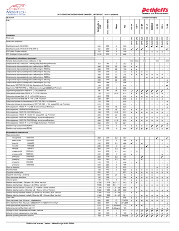 WYPOSAŻENIE DODATKOWE CAMPER „LIFESTYLE” 2010 – sprzedaż 520 BK 550 LK 545 DBM 550 SK 590 S 720 SK ALKO EM3 ALKO EN5 ALKO EN5 ALKO ET5 BPW DD5 - BPW EL3 - 470 V Kod - BPW EK3 Waga - 450 DB Cena netto w EUR Camper Liferstyle TYP Cena brutto w EUR* 06.05.10r. - ✔ ✔ ✔ ✔ Podwozie Producent podwozia BPW EH3 Podwozie - - - - Stabilizator jazdy AKS 3004 354 290 6 598 - - Stabilizator jazdy Winterhoff WS 3000 D 354 290 6 638 ✔ ✔ ✔ 737 604 3 748 - - 1 015 832 3 886 - - ATC (Alko Trailer control) IDC (Inteligent drive control) - - - - - ✔ - o o o o - - - - - - - Wyposażenie dodatkowe podwozia Seryjna dopuszczalna masa całkowita w kg - - - - 1300 1350 Zwiększenie dop. masy cał. 1350 kg (bez przeróbki podwozia) 107 88 4 393 o - - - - - - - Zwiększenie dopuszczalnej masy całkowitej do 1400 kg 388 318 22 359 o o - - - - - - Zwiększenie dopuszczalnej masy całkowitej do 1500 kg 388 318 22 136 o o - - - - - - Zwiększenie dopuszczalnej masy całkowitej do 1600 kg 388 318 22 322 o o o o - - - - Zwiększenie dopuszczalnej masy całkowitej do 1700 kg 388 318 22 278 o o o o o o o - Zwiększenie dopuszczalnej masy całkowitej do 1800 kg 388 318 25 279 - - - o o o o - Zwiększenie dopuszczalnej masy całkowitej do 2100 kg 388 318 22 395 - - - - - - - o Zwiększenie dopuszczalnej masy całkowitej do 2500 kg 908 744 22 496 - - - - - - - o Ogumienie 185/70 R 14 Li 88 dla dwuosiowych Premium 195 160 - 834 - - - - - - - ✔ Ogumienie 195/70 R 14C Li 102 dla dwuosiowych (2500 kg) Premium 277 227 4 858 - - - - - - - o Ogumienie poszerzone 185 R 14 C LI102Premium 98 80 36 830 ✔ ✔ ✔ ✔ ✔ ✔ ✔ - Ogumienie poszerzone 195 R 14 C LI106 Premium 138 113 45,5 832 o o o o o o o - Felga aluminiowa Rad 185 R 14C LI102 Premium 405 332 - 836 o o o o o o o - Felga aluminiowa Rad 195 R 14 C LI106 Premium 436 357 - 838 o o o o o o o - Felga aluminiowa do dwuosiowych 185/70 R 14 LI 88 Premium 712 584 - 840 - - - - - - - o Felga aluminiowa do dwuosiowych 195/70 R 14C LI102 (przy 2500 kg) Premium 815 668 - 859 - - - - - - - o Koło zapasowe 185/70 R 14 LI 88 do dwuosiowych Premium 159 130 18 835 - - - - - - - o Koło zapasowe 185R14CLI102 Premium 170 139 16 831 o o o o o o o - Koło zapasowe 195 R 14 C LI106 Premium 189 155 22,5 833 o o o o o o o - Koło zapasowe 195/70 R 14C LI 104 (przy 2500 kg) Premium 200 164 20 860 - - - - - - - o Koło zapasowe 185 R 14 C LI102 felga aluminiowa Premium 285 234 17 837 o o o o o o o - Koło zapasowe 195 R 14 C LI106 felga aluminiowa Premium 296 243 21,5 839 o o o o o o o - Koło zapasowe 195/70 R 14 LI102 felga aluminiowa Premium 296 243 17 861 - - - - - - - o Stabilne nogi podporowe (ALKO) 143 117 3 115 o o o o 3 494 ✔ ✔ ✔ 139 ✔ ✔ 170 ✔ ✔ Stabilne nogi podporowe (BPW) o o o ✔ 1500 1600 2000 o Wyposażenie zewnętrzne Klapy schowków: lewy przód 1000/405 292 239 2,2 397 - - - - - ✔ - ✔ lewy przód 1000/305 272 223 2 398 o o - - - - o - lewy tył 1000/405 292 239 2,2 468 ✔ - o - - - - - lewy tył 1000/305 272 223 2 401 - - - ✔ - - - o 1200/500 lewy tył 292 239 2,2 904 - - o - - - - - prawy przód 1000/405 292 239 2,2 402 - ✔ - - - - - - prawy przód 1000/305 272 223 2 403 o - - - - - o - prawy tył 1000/405 292 239 2,2 405 - - ✔ - - - ✔ - prawy tył 1200/500 293 240 2,2 893 - - o - - - - - prawy tył 700/305 210 172 2 426 - o - - - - - - prawy tył 1000/305 272 245 2 5 406 855 - - - - - - o o - 138 223 201 113 2 626 o o o o o o o o Wysokie światła tylne 204 167 623 o o o o o o o o Bagażnik dachowy z drabiną 665 545 27 183 o - o - o - - - Okno dachowe Mini Heki 132 108 - 786 o o o o o o o o o Okno w łazience Wysoki przód Osłona dyszla o 138 113 8 434 o o o o o o o Gładkie blachy białe ( Camper LS) „White Version” 1 358 1 113 8,5 – 11 443 o o - - - - - - Gładkie blachy białe ( Camper LS) „White Version” 1 568 1 285 8,5 – 11 443 - - o o o o o o Gładkie blachy srebrne ( Camper LS + Snow) „Silver Version” 1 358 1 113 11,5 – 16 659 o o - - - - - - Gładkie blachy srebrne ( Camper LS + Snow) „Silver Version” 1 568 1 285 11,5 – 17 659 - - o o o o o o Gładkie blachy niebieski metalik ( Camper LS + Snow) „Blue Version” 1 358 1 113 11,5 – 16 721 o o - - - - - - Gładkie blachy niebieski metalik ( Camper LS + Snow) „Blue Version” 1 568 1 285 11,5 – 17 721 - - o o o o o o Dach GFK 511 419 805 o o o o o o o o Okno dachowe Heki II Luxus z oświetleniem 850 697 13 274/381 o o o o o o o - Okno dachowe Heki II Luxus z oddzielnym oświetleniem owalnym 850 697 13 274/677 - - - - - - - o Izolacyjna pianka Styrofoam do 510 614 503 0,65kg/m² 179 o o o - - - - - Izolacyjna pianka Styrofoam od 510 819 671 0,65kg/m² 179 - - - o o o o o ✔ Uchwyt na koło zapasowe w schowku na butle 29 24 1 432 ✔ ✔ ✔ ✔ ✔ ✔ ✔ Uchwyt na koło zapasowe na zewnątrz 128 105 6 130 o o o o o o o o Boczne spoilery jedno/dwu-osiowe 159 130 6 109/376 ✔ ✔ ✔ ✔ ✔ ✔ ✔ ✔ Mobitech Caravan Center – aktualizacja 06.05.2010r. WYPOSAŻENIE DODATKOWE CAMPER „LIFESTYLE” 2010 – sprzedaż Camper Liferstyle Waga Kod 450 DB 470 V 520 BK 550 LK 545 DBM 550 SK 590 S 720 SK Cena brutto w EUR* TYP Cena netto w EUR 06.05.10r. Gaśnica 6 kg 101 83 8 843 o o o o o o o o Moskitiera drzwiowa 221 181 2,5 360 o o - o o o o o Większa łazienka 357 293 10 604 - - - - - - - o Kosz na bieliznę 61 50 2 866 - - - o - o - - Torba w toalecie 29 24 1 884 o o o o o o o o Instalacje wewnątrz Wyposażenie meble Tworzywo warstwowe, opcjonalnie 101 83 898 o o o o o o o o Łóżko piętrowe z 2 miejscami (2 okna) 317 260 442 - - - ✔ - ✔ - ✔ Łóżko piętrowe z 3 miejscami (1 okno pośrodku) 159 130 10 200 - - - o - o - - Łózka z podnoszonymi zagłówkami 71 58 1 871 - o - - - - - - Przebudowa łóżek z dwóch pojedynczych na podwójne 266 218 5 685 - o - - - - - - Przebudowa łóżka na siedzisko 368 302 591 - - - - o - - - Klapy szafek górnych opcjonalnie 173 142 864 o o - - - - - - Wyposażenie tekstylne - - 15 82