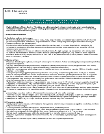 TECHNOLOGIA MONTAŻU WYKŁADZIN LG HAUSYS FLOORS CONTROL TILE Płytki LG Hausys Floors Control Tile różnią się od innych płytek winylowych tym, że w ich właściwości są skuteczne wyłącznie pod warunkiem ścisłego przestrzegania załączonej instrukcji montażu, co jest również warunkiem ważności Gwarancji LG. 1. Przygotowanie podłoża: A. Montaż na podłożu betonowym: - Podłoże musi być czyste, suche i wolne od kurzu, farby, oleju, tłuszczu, utwardzaczy powierzchniowych, środków do gruntowania porowatych powierzchni, rozpuszczalników, asfaltu, starego kleju oraz innych materiałów ubocznych. - Powierzchnia musi być gładka i płaska. Pęknięcia i wszelkie inne nierówności należy załatać i wypoziomować za pomocą dobrej jakości materiałów do wykańczania powierzchni. Wszelkie niepoprawione nierówności podłoża mogą przebijać przez posadzkę LG i być widoczne na jej powierzchni. - Nowe podłoża betonowe muszą być odpowiednio utwardzone. Na ogół wymaga się, aby podłoże takie schło przez co najmniej trzy miesiące od momentu wylania zaprawy (przy wilgotności poniżej 4,5%), chronione przed wpływem warunków atmosferycznych i przy temperaturze 25ºC. Na 15 dni przed montażem podłoże powinno zostać dosuszone przez dodatkowe ogrzewanie. 2. Montaż płytek: Prosimy o dokładne przeczytanie poniższych zaleceń przed montażem. Należy przestrzegać podanej wcześniej instrukcji przygotowania podłoża. - WAŻNE: należy stosować klej dostosowany do montażu płytek przewodzących. Przed przygotowaniem kleju należy dokładnie przeczytać instrukcje dotyczące prawidłowego przygotowania podłoża. - Płytki, klej i pomieszczenie należy utrzymywać w stałej temperaturze wynoszącej co najmniej 18ºC na 48 godzin przed , w trakcie i po montażu. - Każdej serii produkcyjnej płytek przypisany jest numer serii podany na etykiecie opakowania. Jeżeli jest to możliwe należy w danym pomieszczeniu lub na danym obszarze stosować materiał o tym samym numerze serii. W przypadku gdy jest to niemożliwe, zaleca się przeznaczenie produktów o innych numerach seryjnych do odrębnych obszarów. - Po wymieszaniu kleju należy go rozprowadzić na podłodze za pomocą kielni. Należy dokładnie przestrzegać czasu otwarcia i czasu działania podanego na opakowaniu. - Płytki należy kłaść niezwłocznie po rozprowadzeniu kleju (w ciągu około 15- 60 minut), w żadnym wypadku nie później niż godzinę po wymieszaniu. Aby uzyskać właściwą przewodność wymagane jest solidne przyleganie kleju do płytki. - Należy unikać zanieczyszczenia płytek (należy założyć czyste obuwie podczas instalacji). - Natychmiast po położeniu płytek należy przejechać po nich wzdłuż i wszerz 80- kilogramowym wałkiem wieloczłonowym. Czynności te należy powtórzyć po upływie godziny. Sprawdzić, czy nie pozostały wystające brzegi. Jeżeli tak- jeszcze raz przejechać po posadzce wałkiem. W miejscach trudnodostępnych użyć wałka ręcznego. - Jeżeli klej wypłynie wzdłuż brzegów lub na powierzchnię płytek, usunąć po zastygnięciu za pomocą szmatki lub gąbki - Należy unikać nagłych zmian temperatury od momentu utwardzenia kleju i przez co najmniej 48 godzin po montażu. - Należy unikać natężonego ruchu po posadzce przez co najmniej 48 godzin po montażu 2. Procedura montażu: - Należy najpierw zamontować paski miedziane dla uzyskania uziemnienia pomieszczenia (zgodnie z instrukcją montażu połączenia elektrycznego) - Zaznaczyć środek pomieszczenia poprzez narysowanie kredą prostopadłych linii. - Rozprowadzić klej przewodzący za pomocą kielni. Należy dokładnie przestrzegać czasu otwarcia i czasu działania. - Nie należy rozprowadzać zbyt dłużej ilości kleju na raz (właściwa powierzchnia to 4- 7 na montera) - Montaż płytek należy rozpocząć od środka pomieszczenia w kierunku ścian wewnętrznych (rys. 1) - Wszystkie płytki należy układać w tym samym kierunku. Na spodzie każdej płytki znajdują się strzałki określające ich kierunek. - Natychmiast po położeniu płytek należy przejechać po nich 80- kilogramowym wałkiem. 3. Instrukcja montażu połączenia elektrycznego: Montaż i schemat płytek miedzianych: Połączenie elektryczne do punktów uziemniających powinno być zawsze wykonywane przez uprawnionego elektryka) UKŁAD PODSTAWOWY :tylko 10 ~ 100 Ω Przypadek 1. Schemat dla pomieszczenia o powierzchni poniżej 50 m² Rys. 1: Powierzchnia < 50 m² Przypadek 2. Schemat dla pomieszczenia o powierzchni powyżej 50 m² (Typ A) Rys. 2: Powierzchnia > 50 m² Przypadek 3. Schemat dla pomieszczeń o powierzchni powyżej 50 m² (typ B) Rys. 3: Powierzchnia > 50 m² 4. EKSPLOATACJA - Zalecenia ogólne: Zabrudzenia z mocnej i nieporowatej powierzchni winylowych płytek przewodzących i rozpraszających można łatwo usunąć bez wpływu na ich właściwości przewodzące. Nie są wymagane jakiekolwiek działania punktowe lub specjalistyczne środki czyszczące do zachowania właściwości przewodzących. Tak jak w przypadku każdej posadzki, na jaśniejszych kolorach bardziej widać zabrudzenia, w związku z czym wymagają one częstszego i dokładniejszego czyszczenia. Niektóre silniejsze środki mogą oddziałowywać na powierzchnię, jednakże oddziaływanie to nie będzie znaczące, jeżeli rozlania będą niezwłocznie usuwane. Silne barwniki i jodoformowe środki bakteriobójcze mogą prowadzić w krótkim czasie do powstania plam na posadzkach winylowych. W związku z tym zaleca się usuwanie takich plam w najkrótszym czasie, oraz stosowanie ciemnych kolorów płytek w miejscach, w których używa się tego typu środków. Czynności związane z czyszczeniem można ograniczyć do minimum przestrzegając podanych niżej procedur utrzymania czystości. - Czyszczenie pomontażowe: Nie należy myć posadzki przez co najmniej 48 godzin po montażu, aby umożliwić całkowite zastygnięcie kle