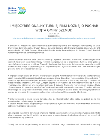 2017.03.02 I MIĘDZYREGIONALNY TURNIEJ PIŁKI NOŻNEJ O PUCHAR WÓJTA GMINY SZEMUD 2014.10.14 zobacz online: http://szemud.pl/artykuly/i-miedzyregionalny-turniej-pilki-noznej-o-puchar-wojta-gminy-szemud/ W dniach 6 i 7 września na boisku łebieńskiej Barki odbył się turniej piłki nożnej na który stawiły się takie drużyny jak: Bałtyk Koszalin, Dragon Bojano, Gwardia Koszalin, UKS Olimpia Bobolice, Widzew Łódź, UKS Jedynka Reda, UKS Orlik Darłowo, Akademia Piłkarska Mosty, Dragon Bojano III, Warena (Litwa), Football Academy Spytkowice, Laktoza Łyszkowice. Otwarcia turnieju dokonał Wójt Gminy Szemud p. Ryszard Kalkowski. W otwarciu uczestniczyło wiele ważnych lokalnych osobistości którzy również zaangażowali się w organizację turnieju oraz goście z zaprzyjaźnionych gmin m. in z Litwy, Słowacji i Spytkowic. Jak się okazało duże wrażenie na gościach zrobił pokaz sztucznych ogni przygotowany przez Wójta Gminy oraz ognisko z kiełbaskami. Czas umilała muzyka grana na żywo przez zespół ze Słowacji. W imprezie wzięło udział 14 drużyn. Trener Dragon Bojano Paweł Piper zdecydował się na wystawienie aż trzech zespołów które reprezentowały barwy naszego klubu. Zawodnicy reprezentujący „Dragon Bojano I” stanęli na wysokości zadania i jako gospodarze pokazali się z bardzo dobrej strony zajmując 3 miejsce. Ich młodsi koledzy z rocznika 2005 czyli „Dragon Bojano II” udowodnili, że mimo różnicy wieku są w stanie rywalizować ze starszymi przeciwnikami zajmując 6 pozycję. Najmłodsi reprezentanci naszego klubu „Dragon Bojano III” głównie z rocznika 2007 zaskoczyli wszystkich w sposób pozytywny. Z punktu widzenia piłkarskiego nie ustępowali umiejętnościami od kolegów którzy byli starsi o 3 lata, największym problemem okazała się przewaga fizyczna przeciwnika, mimo to trzeci zespół Dragona zajął 11 miejsce. W dniu 6 września w czasie trwania turnieju odbył się również festyn gdzie każdy kto pojawił się na nim pojawił znalazł coś ciekawego dla siebie. W sobotni wieczór każda z zaproszonych drużyn podczas wycieczki do Gdynia miała możliwość zwiedzania podwodnych okrętów wojennych. Całą imprezę zakończyła ceremonia wręczenia nagród na gminnych dożynkach w Szemudzie gdzie młodzi piłkarze poprzez możliwość wejścia na scenę oraz otrzymania owacji od zebranych mogli się poczuć jak prawdziwe gwiazdy piłkarskie. Turniej ten został zorganizowany na wysokim poziomie czego dowodem byłi zadowoleni uczestnicy www.szemud.pl | 1 2017.03.02 turnieju, którzy wyjeżdżając dziękowali za udział i nie mówili „Do widzenia” tylko „Do zobaczenia” i często dodawali jeszcze, że „najlepiej wcześniej niż dopiero za rok”. Serdecznie dziękujemy Wójtowi Gminy p. Ryszardowi Kalkowskiemu za zorganizowania tego turnieju oraz wszystkim, którzy w jakikolwiek sposób byli zaangażowani w tworzenie tego dzieła. Więcej informacji na http://uksbojano.futbolowo.pl UKS Dragon Bojano www.szemud.pl | 2