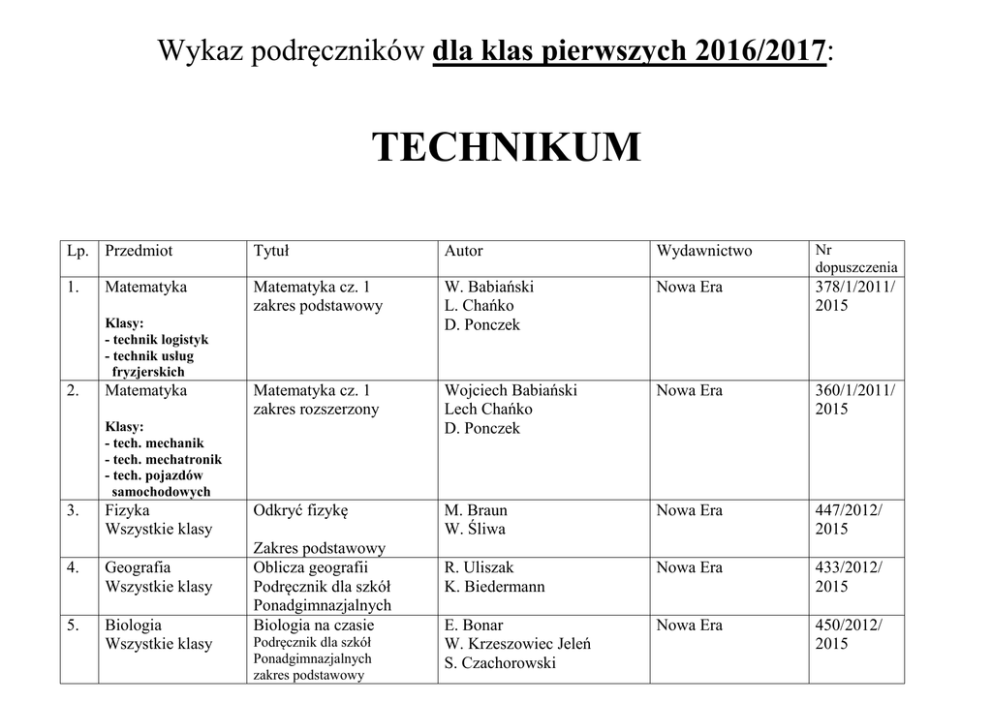 Wykaz podręczników klas 1 TECHNIKUM 2016-2017