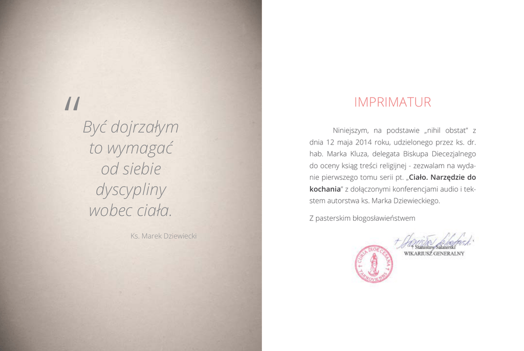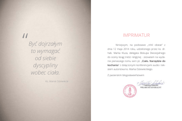 “ IMPRIMATUR Być dojrzałym to wymagać od siebie dyscypliny wobec ciała. Ks. Marek Dziewiecki Niniejszym, na podstawie „nihil obstat” z dnia 12 maja 2014 roku, udzielonego przez ks. dr. hab. Marka Kluza, delegata Biskupa Diecezjalnego do oceny ksiąg treści religijnej - zezwalam na wydanie pierwszego tomu serii pt. „Ciało. Narzędzie do kochania” z dołączonymi konferencjami audio i tekstem autorstwa ks. Marka Dziewieckiego. Z pasterskim błogosławieństwem sytuacji. Rzeczywistość czasem boleśnie weryfikuje nasze pragnienia i potwierdza, że samo pragnienie bycia szczęśliwym nie gwarantuje radości. Seria „Ja, Człowiek” - Wstęp Człowiek to ktoś, kto chce być szczęśliwy. Przynaj- nie o to, jaki jest sens mojego istnienia oraz w oparciu o ja- mniej w tej sprawie wszyscy ludzie zgadzają się z Bogiem. Nasze pragnienie szczęścia pochodzi od Stwórcy. Bóg, który nas kocha, wskazuje nam drogę błogosławieństwa i życia, a przestrzega przed drogą przekleństwa i śmierci. Jezus chce, żeby Jego radość w nas była i żeby nasza radość była Warunkiem osiągnięcia trwałego szczęścia jest rozu- mienie samego siebie, czyli znalezienie odpowiedzi na pytakie więzi, wartości i normy moralne jestem w stanie ów sens istnienia osiągnąć. Od szczęścia oddala się ten, kto stara się coraz lepiej rozumieć świat wokół siebie, lecz nie dba o to, by coraz lepiej rozumieć samego siebie. pełna (por. J 15, 11). podstawowych prawd o człowieku, które objawia nam Biblia. Pragnienie szczęścia jest w nas aż tak wielkie, że nie trzeba być nieszczęśliwym, aby być nieszczęśliwym. Wystarczy nie być szczęśliwym. Już sam brak radości sprawia, że nasze istnienie jawi nam się jako niezrozumiały i nieznośny ciężar, gdyż radość to jedyny normalny sposób istnienia człowieka. Właśnie dlatego człowiek nigdy nie przyzwyczai się do cierpienia. Cykl konferencji „Ja, Człowiek” to pomoc w odkry- waniu tajemnicy człowieka. Celem tego cyklu jest ukazanie Pierwsza z tych prawd to fakt, że każdy z nas jest bezcenny, gdyż kochany przez Boga – bezwarunkowo, cierpliwie, na zawsze. Pismo Święte upewnia nas o tym, że człowiek to nie tylko ktoś kochany, lecz to również ktoś zdolny do uczenia się miłości, bo podobny do Boga. To także ktoś, kto nie ma granic w rozwoju. Nikt z nas nie stanie się na tej ziemi aż tak Od dzieciństwa marzymy o szczęściu w dorosłym bardzo podobny do Boga w miłości, mądrości i wolności, by życiu, o wielkiej miłości, o spotkaniu osoby, która nas tak nie mógł stawać się jeszcze bardziej podobnym do Tego, pokocha, że przy niej będzie nam się chciało żyć w każdej który stworzył nas na swój obraz i podobieństwo. 4 5 Człowiek został stworzony z miłości i radości - do miłości i radości. Wszystko, czym Bóg nas obdarzył, ma nam ułatwiać przyjmowanie i okazywanie miłości. W konferencjach „Ja, Człowiek” przyjrzymy się tym sferom naszego człowieczeństwa, które są szczególnie ważne w szukaniu miłości i szczęścia, a zatem ciału, płciowości, seksualności, emocjom i zdolności komunikowania. Ks. Marek Dziewiecki 6 tom 1 Ciało Narzędzie do kochania Analizowanie tajemnicy człowieka rozpoczynamy od sfery cielesnej. Jest to pierwsza sfera, przez którą już we wczesnym dzieciństwie wchodzimy w kontakt z samym sobą. W znaczeniu biblijnym ciało to cały człowiek w jego konkretnej sytuacji tu i teraz. Roztropne kierowanie własnym ciałem – podobnie jak roztropne kierowanie seksualnością, myśleniem czy emocjami – nie jest czymś łatwym ani spontanicznym. Łatwo popaść w postawy skrajne, czyli podporządkować się ciału lub zaniedbywać ciało oraz jego słuszne potrzeby. Człowiek niedojrzały boi się własnego ciała. Podobnie jak Adam ukrywa się przed Bogiem: „Usłyszałem Twój głos w ogrodzie, przestraszyłem się, bo jestem nagi, i ukryłem się” (Rdz 3, 10). Dojrzałość polega na rozsądnej trosce o ciało i na dyscyplinie w sferze cielesnej. Człowiek dojrzały wie, że to nie ciało może wyrządzić mu krzywdę, lecz że to on może 9 wyrządzić krzywdę swemu ciału - do popełnienia samobójstwa włącznie. Błędem jest troszczenie się o ciało kosztem ducha, albo troska o rozwój duchowy kosztem ciała i jego podstawowych potrzeb. Ostatecznym sensem ciała jest widzialne wyrażanie miłości – poprzez fizyczną obecność, solidną pracowitość i czystą czułość. Pokochać siebie to pokochać siebie całego, czyli także pokochać własne ciało. Niewidzialny Bóg stał się widzialnym człowiekiem właśnie po to, by nauczyć nas komunikowania miłości za pomocą sfery cielesnej. Ciało jest widzialnym nośnikiem miłości. Dzięki ciału mogę komunikować miłość w taki sposób, że kochane osoby nie muszą już się domyślać, czy kocham lub wierzyć, że się o nie troszczę, gdyż to po prostu widzą. Kocha człowiek, a nie jego ciało, jednak miłość komunikowana za pośrednictwem ciała, staje się oczywista i w pełni ludzka. Ks. Marek Dziewiecki 10 Ćwiczenia 1 3 Dojrzałość polega na tym, żeby tym więcej wymagać dys- Twoje ciało ciągle coś mówi do Ciebie i ostrzega przed sy- cypliny w sferze cielesnej, im bardziej troszczę się o moje tuacjami stresowymi. W ciągu najbliższych dni wczuj się w ciało. Określ, w jaki konkretnie sposób przez najbliższy mie- swoje samopoczucie fizyczne w codziennych sytuacjach siąc zadbasz o lepszą kondycję fizyczną i w jakiej kwestii bę- życiowych oraz w kontaktach z ważnymi dla Ciebie oso- dziesz wymagał od siebie większej niż dotąd dyscypliny wo- bami. Postaraj się wyeliminować chociaż jedną sytuację, w bec własnego ciała. Np. postanów, że w ciągu najbliższego której czujesz wyraźny dyskomfort cielesny (np. bóle głowy, miesiąca zabierzesz się na poważnie za regularne ćwiczenia przyspieszony oddech, problemy z krążeniem