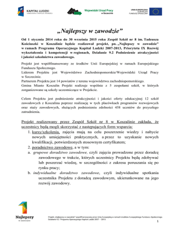 „Najlepszy w zawodzie” Od 1 stycznia 2014 roku do 30 września 2015 roku Zespół Szkół nr 8 im. Tadeusza Kościuszki w Koszalinie będzie realizował projekt, pn. „Najlepszy w zawodzie” w ramach Programu Operacyjnego Kapitał Ludzki 2007-2013, Priorytetu IX Rozwój wykształcenia i kompetencji w regionach, Działanie 9.2 Podniesienie atrakcyjności i jakości szkolnictwa zawodowego. Projekt jest współfinansowany ze środków Unii Europejskiej w ramach Europejskiego Funduszu Społecznego. Liderem Projektu jest Województwo Zachodniopomorskie/Wojewódzki Urząd Pracy w Szczecinie. Partnerem Projektu jest 14 powiatów z terenu województwa zachodniopomorskiego. Gmina Miasto Koszalin Projekt realizuje wspólnie z 5 zespołami szkół, w których zorganizowane są szkoły uczestniczące w Projekcie. Celem Projektu jest podniesienie atrakcyjności i jakości oferty edukacyjnej 12 szkół zawodowych z Koszalina poprzez realizację w tych placówkach programów rozwojowych oraz staży zawodowych, służących podniesieniu zdolności 458 uczniów do przyszłego zatrudnienia. Projekt realizowany przez Zespół Szkół nr 8 w Koszalinie zakłada, że uczestnicy będą mogli skorzystać z następujących form wsparcia: 1. kursy/szkolenia, zajęcia mają na celu poszerzenie wiedzy i nabycie nowych umiejętności praktycznych, a przez to uzyskanie nowych kwalifikacji, potwierdzonych stosownym certyfikatem; 2. poradnictwo zawodowe, a w tym: a. grupowe doradztwo zawodowe, czyli zajęcia prowadzone przez doradcę zawodowego w trakcie, których uczestnicy Projektu będą zdobywać lub poszerzać wiedzę, w szczególności z zakresu poruszania się po rynku pracy; b. indywidualne doradztwo zawodowe, czyli indywidualne spotkania uczestnika Projektu z doradcą zawodowym, ukierunkowane na jego rozwój zawodowy. 1 Kryteria rekrutacji na poszczególne formy wsparcia realizowane w ramach Projektu przez Zespół Szkół nr 8 Warsztaty z zakresu dekorowania wyrobów cukierniczych: • rekrutacją w roku szkolnym 2014/2015 objęci będą uczniowie Technikum Zawodowego nr 2 (zawód: technik technologii żywności – klasa II) i Zasadniczej Szkoły Zawodowej nr 2 (zawód: cukiernik – klasa II i III) – łącznie 10 uczniów; • termin wyjazdu: 16.11. - 21.11.2014r.; • Projekt przewiduje organizację 5-dniowych warsztatów, dla grupy 10 uczniów, pod opieką 2 nauczycieli z ZS8; • program warsztatów obejmuje szkolenie praktyczne w zakresie technik zdobienia wyrobów cukierniczych, m.in.: dekoracji z karmelu, czekolady, marcepana, techniki lustrzanego odbicia i dekoracji żelowych; • Projekt zakłada sfinansowanie uczestnikom warsztatów szkolenia oraz odzieży roboczej, a w przypadku warsztatów organizowanych poza miastem Koszalin, uczniowie będą mieli zapewniony transport, nocleg, a także wyżywienie, bilety komunikacji miejskiej i ubezpieczenie; • uczniowie zakwalifikowani do Projektu obowiązkowo odbędą 5 godzin spotkań indywidualnych z doradcą zawodowym w ZS8 w Koszalinie. Indywidualne doradztwo zawodowe: • wsparciem objęci zostaną wszyscy zainteresowani uczniowie według kolejności zgłoszeń. Grupowe doradztwo zawodowe: • wsparciem objęci zostaną uczniowie wszystkich klas kończących naukę w ZS8 w roku szkolnym 2014/15. Szczegółowe informacje, zasady rekrutacji, wymagane dokumenty rekrutacyjne oraz kryteria naboru omawiają odrębne dokumenty, dostępne na stronie internetowej szkoły www.zs8.koszalin.pl. Kontakt Szkolny Koordynator Projektu - mgr Dominika Majkowska Biuro Projektu znajduje się na parterze w pokoju nr 9. 2
