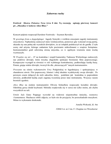 Zabawne ruchy Festiwal Musica Polonica Nova trwa 8 dni. Tą recenzją opisuję pierwszy koncert pt: „Mozaika w kolorze Alice Blue.” Koncert pięknie rozpoczął Dyrektor Festiwalu – Szymon Bywalec. W greetings from a doppelgänger Jagody Szmytki z wielkim emocjami zagrały instrumenty smyczkowe. Najbardziej zaskoczył mnie wiolonczelista, ponieważ gdy wykonał swoją partię, okazała się ona pełną tak wysokich dźwięków, że aż żołądek podskoczył mi do gardła. Z tyłu sceny stał artysta, którego zadaniem było pocieranie mikrofonami o wnętrze fortepianu. Instrumentaliści grali odwrotną stroną smyczka, co w ogólnym wrażeniu mnie trochę wystraszyło. W Przędzie się nić… IV na kontrabas i zespół kameralny Tadeusza Wieleckiego zaskoczyły nas piskliwe dźwięki, które troszkę złagodziło spokojne brzmienie fletu poprzecznego. Kompozytor wystąpił tu również w roli wybitnego kontrabasisty, podkreślając każdą frazę. Potem, grając niskie dźwięki, tworzył tło dla „skrzeczących” innych instrumentów. Pressante na ośmiu wykonawców Ewy Podgórskiej to łagodniejszy i spokojniejszy w charakterze utwór. Flet poprzeczny, klarnet i obój idealnie wydobywały swoje dźwięki. Po pewnym czasie dołączył do nich saksofon, który, podobnie jak kontrabas w poprzednim utworze, podkreślał każdą część zagraną wcześniej przez inne instrumenty. Wszyscy razem brzmieli zgodnie. Alice Blue na siedem instrumentów Olivera Schnellera rozpoczęły leciutkie dźwięki. Odrobinę grozy dodał keyboard. Melodia rozpływała się w sercu nie tylko moim, ale chyba wszystkich na sali. Utwór Salz Enno Poppego wywołał na widowni niepotrzebne śmiechy, rozmowy i komentarze. Słuchacze robili zdjęcia, co było nie do przyjęcia, bo przeszkadzało muzykom. Mimo to wykonanie doskonałe. Amelia Wołczek, kl. 4m /OSM I st. nr 2 im. F. Chopina we Wrocławiu/ Kłótliwa orkiestra Ta recenzja opisuje koncert pt: „Assello, Behemot i Korowiow w lesie Mokrzańskim”, jaki odbył się w przedostatnim dniu Festiwalu Musica Polonica Nova. W utworze „Sceny z Bułhakowa” Jerzego Kornowicza z głośników wydobywały się dźwięki podobne do odgłosów zwierząt i wiatru. Następnie zagrały instrumenty smyczkowe, przeszkodziło mi to, że skrzypkowi spadło włosie ze smyczka. Po pewnym czasie „huknęły” instrumenty dęte, które jakby chciały pokonać inne instrumenty. W tym samym momencie fortepian wykonywał spokojne partię. W Koncercie fletowym Pawła Mykietyna zagrało jeszcze więcej instrumentów. Świetnie zagrał wybitny flecista Łukasz Długosz. Zaczął solo i grał bardzo długo. Dopiero później wszyscy inni artyści dołączyli do jego partii. W zakończeniu każdy instrument miał solowe wystąpienie. W utworze Macieja Jabłońskiego *** każdy artysta chciał się popisać, a potem obydwoje fleciści (Łukasz Długosz i jego żona - Agnieszka Długosz). Mi podobało się dopiero zakończenie utworu. W „Lasach deszczowych” Grażyny Pstrokońskiej - Nawratil zagrał cały skład orkiestry symfonicznej. Ponadto wykorzystane inne przedmioty (np. folia aluminiowa, wałek kuchenny). W momentach, gdy wszyscy muzycy grali razem miałam skojarzenia z wybuchem wojny. Na szczęście dynamika uspokoiła się, mimo to wciąż byłam pod presją, że znowu „wybuchnie”. Wykonawcy otrzymali wielkie brawa, większość słuchaczy wstała z okrzykami: „Brawo, Brawo!!!” Amelka Wołczek, kl. 4m /OSM I st. nr 2 im. F. Chopina we Wrocławiu/