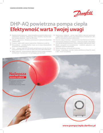 MAKING MODERN LIVING POSSIBLE DHP-AQ powietrzna pompa ciepła Efektywność warta Twojej uwagi • • • • • • Najniższe koszty ogrzewania - dzięki kompleksowej kontroli efektywności: modulowany wentylator, elektroniczny zawór rozprężny, regulacja prędkości pompy obiegowej – nawet do 50% taniej Komfort - ogrzewanie i chłodzenie pomieszczeń w zależności od potrzeb użytkowników Trwałość – jeden wybór systemu ogrzewania i chłodzenia na wiele lat Niezawodność – produkty Danfoss znane są ze swojej niezawodności, sprawności i bezawaryjności Ciśśś… – pompa ciepła DHP-AQ została zaprojektowana tak, aby mieć najniższy poziom głośności na rynku (w trybie cichej pracy tylko 58 decybeli) Włącz i zapomnij – prosta instalacja, dzięki komunikacji między modułami zewnętrznym i wewnętrznym, nie wymagająca prac ziemnych • • • • • • Nieprzeciętna wydajność – pompa ciepła Danfoss zapewnia ogrzewanie i ciepłą wodę użytkową nawet przy temperaturze na zewnątrz do -20oC (SPF 4,4; automatyczny proces odszraniania) Dowolne miejsce inwestycji – uniezależnienie się od dostawców mediów Dostosowanie potrzeb do możliwości – nawet przy bardzo małej działce i bez specjalnego pomieszczenia można oszczędzać dzięki pompie ciepła Idealne rozwiązanie do termodernizacji - możliwość połączenia z już istniejącym systemem grzewczym Zdalny monitoring i sterowanie pracą pompy Ekologia - eksploatując swój dom możesz zredukować emisję CO2 nawet o 40% - chroń naszą planetę Najlepsza Sezonowa wydajność DHP-AQ jest rozwiązaniem o najlepszej sezonowej wydajności na rynku powietrznych pomp ciepła. www.pompyciepla.danfoss.pl A - Zasobnik c.w.u. B - Podgrzewacz pomocniczy C - Pompa obiegowa D - Zawór 3-drogowy przełączający c.o./c.w.u. Pompa ciepła DHP-A AQ Powiietrzna t pompa ciiepłła, wykkonana w tech hnollogiiii bezpośśred dniego i odparowani d ia, montow mon towana ana jest jest w d dowo owolny lnym m miej miejscu scu obok obok bud budynk ynku. u. Wbu Wbudow dowany any,, modu modulow lowany any wentyl wen tylato atorr wymu wymusza sza przep przepływ ływ powie powietrz trzaa zewn zewnętr ętrzne znego go, z któ któreg rego o odzy odzyski skiwan wane e cieciepło ł przekazywan k e jestt d do wnętrza t b dynku. bud k Taki T kie cie i pło ł jjestt darmowe, odn d awiialne l i niew niewycz yczerp erpaln alne. e. Lat Latem em pom pompa pa cie ciepła pła od odbie biera ra nad nadmia miarr ciep ciepła ła z budy budynku nku i usu usuwa wa je na zew zewnąt nątrz rz. moduł MINI 600 mm moduł MAXI DHP-AQ 625 mm moduł MIDI 1557 mm m 4m 1845 ± 10 mm 20 380 mm 69 0m m 25 5m m m 420 m m 596 m 57 0m 6 mm 66 16 11 m Ciepło odzys y kiwane jest poprzez bezpośrednie odparowanie czynnika chłodniD czego w wymienniku, przez który przepływa pły wa pow powiet ietrze rze ze zewnę wnętrz trzne ne, co po pozwa zwala la C na uzyskanie wysokiej efektywności praA cy pom pompy py DHP DHP-AQ AQ.. W ka każde żdejj p pomp ompie ie popo wietrznej prawidłowe odszranianie poB wierzchni tego wymiennika warunkuje efektywny odzysk ciepła. W DHP-AQ stan powierzchni wymiennika jest na bieżąco monitorowany przez sterownik, a odszranianie włączane jest automatycznie, jeślili rze jeś rzeczy czywiś wiście cie jest jest pot potrze rzebne bne. Ciep Ciepło ło używane do tego procesu jest wcześniej p ierane z pow pob p ietrza zewnę ętrzneg go i gromadzone, a więc jest darmowe. Pozwala to na dalsze zmniejszanie zużycia energii elektrycznej i uzyskiwanie najefektywniejszego odzysku ciepła. Konstrukcj k ja pompy cie i pła ł DHP DHP-AQ AQ umożli żliwiia elastyczn l ą konfi figuracjję installacjiji z poszczegól ólnych h elementów, w zależnosci od wymagań. Ciepła woda użytkowa powinna być przygotowywana w dedy dedykow kowany anym m pomp pompom om cie ciepła pła za zasob sobnik niku u, wyk wykona onanym nym w uni unikal kalnej nej te techn chnolo ologii gii TW TWSS. Szc Szczyt zytowe owe zapotrzebowanie na ciepło, pojawiające się okresowo, może być pokrywane poprzez elektryczny pod podgrz grzewa ewacz cz pom pomocn ocnicz iczyy llub ub ist istnie niejąc jącyy kkoci ocioł. oł. Wy Wymag magany any pr przep zepływ ływ cz czynn ynnika ika gr grzew zewcze czego go na potrzeby c.o. lub c.w.u. wywoływany jest poprzez pompę obiegową o regulowanej prędkości obrotowej (technologia OPTI). Czynnik grzewczy kierowany jest do odpowiednich obiegów za pomocą zaworu przełączającego. Pompa DHP-AQ może także przygotowywać wodę lodową na potrzeby chłodzenia pomieszczeń. Zastosowanie w konstrukcji pompy ciepła elektronicznego zaworu rozprę roz prężne żnego go zap zapewn ewnia ia ela elasty stysty styczn czność ość pracy pracy i utr utrzym zymani anie e wyso wysokie kiejj efek efektyw tywnoś ności ci w zmie zmienia niając jących ych się warunkach różnych trybów pracy. DHP-AQ Wielkość: Wydajność nominalma Moc grzewcza Wskaźnik efektywności cieplnej 1) COP Wskaźn Wsk aźnik ik efe efekty ktywno ywności ści ci ciepl eplnej p nejj 2) COP Temper Tem peratu atury ry min./maks /maks.. - powi powietr etrze ze zew zewnęt nętrzn rzne e °C C - czynnik y grzewczyy 3) g °C Zasilanie elektryczne Trójfazowe (wybrane modele także 230 V) V Moc znamionowa sprężarki kW Moc rob bocza spręża ż rki ki - grzanie i kW Moc oc ro oboc boczaa spr sp ęża ę arki - chł c odz od eni e e kW Poziom g głośności 4) Tryyb zwyk y łyy dB(A) Tryb cichy dB(A) Ciężar Pompa ciepła kg Moduł Mod uł MIN MINII kg Moduł Mod uł MID MIDII kg Moduł MAXI kg 1) 2) 3) A7/W35 wg g EN 255 A7/W35 wg EN 14511 6 9 11 13 16 18 6,2 8.6 10.8 12.2 15.3 17.9 4.1 40 4.0 -20 20~+4 +45°C 5C 60 4.6 44 4.4 -20 20~+4 +45°C 5C 60 4.6 43 4.3 -20 20~+4 +45°C 5C 60 4.3 43 4.3 -20 20~+4 +45°C 5C 60 4.4 42 4.2 -20 20~+4 +45°C 5C 60 4.0 39 3.9 -20 20~+4 +45°C 5C 60 400 V 3-N 2.2 15 1.5 1.9 .9 61 58 125 18 21 1