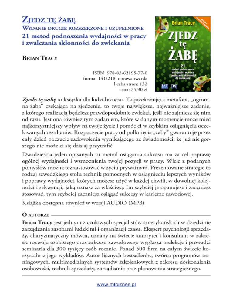 Zjedz tę żabę Wydanie drugie rozszerzone i uzupełnione 21 metod podnoszenia wydajności w pracy i zwalczania skłonności do zwlekania Brian Tracy ISBN: 978-83-62195-77-0 format 141/218, oprawa twarda liczba stron: 132 cena: 24,90 zł Zjedz tę żabę to książka dla ludzi biznesu. Ta przekonująca metafora, „ogromna żaba” czekająca na zjedzenie, to twoje największe, najważniejsze zadanie, z którego realizacją będziesz prawdopodobnie zwlekał, jeśli nie zajmiesz się nim od razu. Jest ona również tym zadaniem, które w danym momencie może mieć najkorzystniejszy wpływ na twoje życie i pomóc ci w szybkim osiągnięciu oczekiwanych rezultatów. Rozpoczęcie pracy od połknięcia „żaby” gwarantuje przez cały dzień poczucie zadowolenia wynikającego ze świadomości, że już nic gorszego nie może ci się dzisiaj przytrafić. Dwadzieścia jeden opisanych tu metod osiągania sukcesu ma za cel poprawę ogólnej wydajności i wzmocnienia twojej pozycji w pracy. Wiele z podanych pomysłów można też zastosować w życiu prywatnym. Prezentowane strategie to rodzaj szwedzkiego stołu technik pomocnych w osiągnięciu lepszych wyników i poprawy wydajności, których możesz użyć w każdej chwili, w dowolnej kolejności i sekwencji, jaką uznasz za właściwą. Im szybciej je opanujesz i zaczniesz stosować, tym szybciej zaczniesz osiągać sukcesy w karierze zawodowej. Książka dostępna również w wersji AUDIO (MP3) O autorze Brian Tracy jest jednym z czołowych specjalistów amerykańskich w dziedzinie zarządzania zasobami ludzkimi i organizacji czasu. Ekspert psychologii sprzedaży, charyzmatyczny mówca, uznany na świecie autorytet i konsultant w zakresie rozwoju osobistego oraz sukcesu zawodowego wygłasza prelekcje i prowadzi seminaria dla 300 tysięcy osób rocznie. Ponad 500 firm na całym świecie korzystało z jego wykładów. Autor licznych bestsellerów, twórca programów treningowych, multimedialnych systemów szkoleniowych z zakresu doskonalenia osobowości, technik sprzedaży, zarządzania oraz planowania strategicznego. www.mtbiznes.pl Zjedz tę żabę Spis treści Przedmowa . . . . . . . . . . . . . . . . . . . . . . . . . . . . . . . . . . . . . . . . . . . . . . . 9 Wprowadzenie: zjedz tę żabę . . . . . . . . . . . . . . . . . . . . . . . . . . . 15 1. Nakryj do stołu . . . . . . . . . . . . . . . . . . . . . . . . . . . . . . . . . . . . . 23 2. Planuj każdy dzień z wyprzedzeniem . . . . . . . . . . . . . . 29 3. Stosuj zasadę 80/20 gdzie się da . . . . . . . . . . . . . . . . . . . . 35 4. Zastanów się nad konsekwencjami . . . . . . . . . . . . . . . . . 39 5. Zwlekanie kontrolowane . . . . . . . . . . . . . . . . . . . . . . . . . . . . 47 6. Nieustannie stosuj metodę ABCDE . . . . . . . . . . . . . . . . 51 7. Koncentruj się na zagadnieniach kluczowych . . . . . . 55 8. Prawo trzech zadań . . . . . . . . . . . . . . . . . . . . . . . . . . . . . . . . . 61 9. Dobrze się przygotuj, zanim rozpoczniesz . . . . . . . . . . 69 10. Krok po kroku, czyli od beczki do beczki . . . . . . . . . . 73 11. Podwyższaj swoje kwalifikacje . . . . . . . . . . . . . . . . . . . . . . 77 12. Okaż swoje szczególne zdolności . . . . . . . . . . . . . . . . . . . 81 13. Rozpoznaj swoje główne ograniczenia . . . . . . . . . . . . . . 85 14. Zmobilizuj się . . . . . . . . . . . . . . . . . . . . . . . . . . . . . . . . . . . . . . . 91 15. Maksymalne wykorzystanie energii . . . . . . . . . . . . . . . . . 95 16. Zmuś się do działania . . . . . . . . . . . . . . . . . . . . . . . . . . . . . . 101 www.mtbiznes.pl Zjedz tę żabę 8 Zjedz t¤ Śab¤! 17. Nie daj się uzależnić technice . . . . . . . . . . . . . . . . . . . . . 105 18. Plasterki salami i ser szwajcarski . . . . . . . . . . . . . . . . . . . 113 19. Strategia wydzielania czasu . . . . . . . . . . . . . . . . . . . . . . . . 117 20. Stan wyższej konieczności . . . . . . . . . . . . . . . . . . . . . . . . . 121 21. Każde zadanie traktuj indywidualnie . . . . . . . . . . . . . . 125 Podsumowanie: plan działania . . . . . . . . . . . . . . . . . . . . . . . . . 129 www.mtbiznes.pl Zjedz tę żabę ROZDZIAŁ 1 Nakryj do stołu Wygrywa tylko ten, kto ma jasno określony cel i nieodparte pragnienie, aby go osiągnąć1. NAPOLEON HILL Zanim określisz swoją żabę i przygotujesz się do jej połknięcia, musisz uściślić, co chcesz osiągnąć w każdej dziedzinie swojego życia. Jasność w tej kwestii to bezwzględny warunek produktywności. To, że niektórzy potrafią wykonać większą ilość pracy w krótszym czasie, wynika przede wszystkim z uświadomienia sobie jasności celów i zamiarów oraz z konsekwencji w ich realizacji. Im bardziej sprecyzowane jest nasze pojęcie o tym, co chcemy osiągnąć, tym łatwiej potrafimy pokonać mentalny bezwład, wybrać sobie tę żabkę i kontynuować wykonywanie zadań zgodnie z planem. Główną przyczyną odkładania spraw na później i braku motywacji jest mgliste, nieuporządkowane wyobrażenie o tym, co, w jakiej kolejności i dlaczego chcemy osiągnąć. Takiego stanu należy unikać za wszelką cenę, wytrwale dążąc do jak największej przejrzystości na każdym polu działania. Wszystkie tłumaczenia cytatów, tytułów itp. pochodzą od tłumacza, o ile nie podano inaczej (przyp. tłumacza). 1 www.mtbiznes.pl Zjedz tę żabę 24 Zjedz t¤ Śab¤! Oto doskona¨a recepta na sukces: myĻl z o¨ówkiem w r¤ku. Zaledwie 3 procent dorosłych jasno określa i zapisuje swoje cele. Osoby te osiągają pięć, a nawet dziesięć razy więcej niż ludzie o tym samym lub lepszym wykształceniu i zdolnościach, którzy jednak z niewiadomych względów nigdy nie zadali sobie trudu, aby precyzyjnie określić, czego pragną. Istnieje skuteczny przepis na wyznaczanie i osiąganie celów. Składa się z siedmiu etapów, a zaliczenie któregokolwiek z nich może zwiększyć twoją wydajność co najmniej dwukrotnie. Zarobki wi
