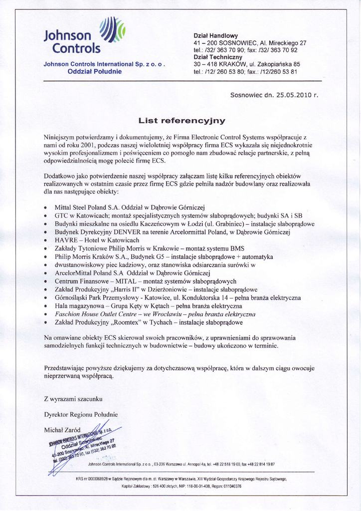 ł)I(, Johnson Controls Johnson Controlslnternational Sp, z o. o . oddział Południe DziałHandIowy 41 - 200SOSNOWIEC,Al. Mireckiego 27 tel.:/32l363 70 90;fax:l32l 363 70 92 DziałTechniczny 30 - 418 KRAKoW. u|.zakooiańska85 tel..hzl 260 53 80;fax.:1121260 53 81 r. Sosnowiec dn.25.05.2010 List referencyjny żeFirma ElectronicControlSystemswspĘracuje z Niniejszympotwierdzamyi dokumentujemy, nami od roku 2001,podczasnaszejwieloletniejwspółpracyfirma ECS wykazałasię niejednokrotnie wysokimprofesjonalizmem i poświęceniem co pomogłonamzbudowaćrelacjepartnerskie, z pełną poleció mogę firmęECS. odpowiedzialnością DodatkowojakopotwierdzenienaszejwspóĘracyzałączamlistękilku referencyjnych obiektów realizowanychw ostatnimczasie przez firmę ECS gdzie pełniłanadzór budowlanyoraz rea|izowała dla nasnastępujące obiekĘ: o o . o o o . o o r o . o o . Mittal SteelPolandS'A. oddziałw DąbrowieGómiczej GTC w Katowicach;montażspecjalistycznych systemówsłaboprądowych; budynkiSA i SB _ Budynki mieszkalnena osiedluKaczeńcowymw Łodzi (ul. Grabiniec) instalacjesłaboprądowe BudynekDyrekcyjnyDENVER na terenieArcelormittalPoland,w DąbrowieGómiczej HAVRE - Hotel w Katowicach ZakładyTyloniowe Philip Monis w Krakowie _ montażsystemuBMS + automatyka Philip Monis Kraków S'A.' BudynekG5 _ instalacjesłaboprądowe piec kadziowy'oraz stanowiskaodsiarczaniasurówki w dwustanowiskowy ArcelorMittalPolandS.A oddziałw DąbrowieGómiczej CentrumFinansowe_ MITAL . montażsystemów słaboprądowych ZakładProdukcyjny,,Hanis II'' w Dzierżoniowie_ instalacjesłaboprądowe Górnośląski Park Przemysłowy- Katowice,ul. Konduktorska14_ pełnabranżaelektryczna Hala magazynowa_ Grupa Kęty w Kętach _ pełnabtanżae|ektryczna Faschion House outlet Centre _we Wrocławiu_ pełnabranżaeleklryczna ZakładProdukcyjny ,,Roomtex''w Tychach _ instalacjesłaboprądowe Na omawianeobieĘ ECS skierowałswoichpracowników,z uprawnieniamido sprawowania samodzielnych funkcjitechlicmych w budownictwie_ budowyukończonow terminie. powyższedziękujemyza dotychczasową Przedstawiając wspóĘracę,która w dalszymciąguowocuje nieprzerwanąwspóĘracą Z wyrazami szacunku Dvrektor Repionu Południe Michał Zaród Johnson Conlrols Intemetionalsp. r o o., 0!236Warszawa ul.Annopol4a, tel.+482251819OO, fax+48228141987 KRsnr0000068928.ł sądzieRejonowym d|€ m'sl' Warszewy wWa6zawie, X|||Wydział Gospodarczy Krajoweoo Rejestru sądoweoo' Xapi|al zakładowy |526400zło|ych' N|P]11&0G014m,Reoon| 0l 1040376