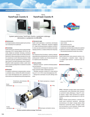 JEDNORUROWE SYSTEMY WENTYLACJI Seria Seria TwinFresh Comfo S TwinFresh Comfo R System jednorurowy TwinFresh F h Comfo Comfo z systemem zdalnego sterowania o wydajnoŋci do 54 m3/h. Zastosowanie Do energooszczĕdnej wentylacji pojedynczych pomieszczeĸ mieszkalnych lub uŧytkowych. Konstrukcja System jednorurowy zbudowany jest na bazie kanaã teleskopowego z PCV o zakresie dãugoŋci 120-470 mm. Wewnćtrz znajduje siĕ wentylator rewersyjny, ceramiczny, akumulacyjny wymiennik ciepãa oraz dwa Àltry powietrza. Zakoĸczony kratkć wentylacyjnć wewnĕtrznć oraz wylotem zewnĕtrznym ze stali malowanej proszkowo. Kratka wewnĕtrzna moŧe byþ wyposaŧona w automatycznć ŧaluzjĕ (model R) lub pãaski dekoracyjny panel (model S). Wszystkie modele wyposaŧone zostaãy w system sterowania za pomocć przeãćczników na obudowie oraz pilota zdalnej obsãugi. Filtr Dwa wbudowane Àltry G3 (wlotowy i wylotowy) zabezpieczajć ukãad przez przedostawaniem siĕ do pomieszczenia zanieczyszczeĸ i insektów, oraz chronić wewnĕrzne czĕŋci urzćdzenia przed zabrudzeniem. posiada tryb automatycznego przeãćczania prĕdkoŋci w zaleŧnoŋci od poziomu wilgotnoŋci w pomieszczeniu Nie powoduje powstawania skroplin pary wodnej. Zasada dziaãania System jednorurowy moŧe pracowaþ zarówno w trybie rewersyjnym z odzyskiem ciepãa i wilgoci jak i w zwykãym trybie nawiewno - wywiewnym (jako nawietrzak) Schemat dziaãania +200 ǹ + CYKL I 70s. IEW -70 ǹ YW Cechy produktu Efektywna nawiewno - wywiewna wentylacja pojedynczych pomieszczeĸ Zaawansowany technologicznie ceramiczny, akumulacyjny wymiennik ciepãa o efektywnoŋci do 91% Wentylator rewersyjny z silnikiem EC o niskim poborze mocy (od 1,4 do 7,3 W) w wersji niskonapiĕciowej (12V) Zintegrowana automatyka oraz pilot zdalnego sterowania Cicha praca (22-29 dBA~3 m) âatwy montaŧ Filtry powietrza klasy G3 Przeznaczony do pracy cićgãej W Wentylator W urzćdzeniu zastosowano energooszczĕdny, rewersyjny wentylator osiowy z silnikiem EC (elektro-komutatorowy) w wersji niskonapiĕciowej (12V), wyposaŧony w ãoŧyska kulkowe oraz zabezpieczenie przed przegrzaniem. Wymiennik ciepãa System zostaã wyposaŧony w ceramiczny, akumulacyjny wymiennik ciepãa o efektywnoŋci rekuperacji siĕgajćcej 91%. Dziĕki komórkowej strukturze materiaãu w wymienniku tworzy siĕ duŧa powierzchnia kontaktowa dla przepãywajćcego powietrza, co zwiĕksza efektywnoŋþ rekuperacji. +20 + 0ǹ +170 ǹ -70 ǹ W Wylot zewnĕtrzny z okapem NA CYKL II Kanaã teleskopowy +170 ǹ EW I Ceramiczny, akumulacyjny wymiennik ciepãa 7 s. 0 -100 ǹ Filtry -100 ǹ Kratka wewnĕtrzna Rewersyjny wentylator osiowy Budowa systemu jednorurowego TwinFresh 184 WWW.VENTS-GROUP.PL CYKL I. Wentylator wycićga ciepãe zuŧyte powietrze z pomieszczenia, które przechodzi przez ceramiczny wymiennik ciepãa odbierajćcy z niego 91% energii cieplnej i wilgoci. Kiedy wymiennik siĕ nagrzeje, urzćdzenie przeãćcza siĕ automatycznie na tryb nawiewny. CYKL II. Ŋwieŧe czyste powietrze z zewnćtrz przechodzi przez ceramiczny wymiennik absorbujćc skumulowanć w nim wilgoþ i energiĕ cieplnć. Kiedy temperatura wymiennika spada, wentylator przeãćcza siĕ ponownie na tryb wywiewny. Zmiana cyklu operacyjnego ma miejsce co 70 sekund. WWW.VENTS-GROUP.PL Funkcje sterowania: Wbudowany przeãćcznik Funkcjonowanie systemu moŧna kontrolowaþ za pomocć trójpozycyjnego przeãćcznika, umieszczonego na obudowie, umoŧliwiajćcego ustawienie pracy urzćdzenia w dogodnym trybie. Przeãćcznik pozwala na wãćczenie/wyãćczenie systemu, wybór wydajnoŋci wentylacji (ŋredniej lub maksymalnej) oraz trybu wentylacji (pasywnej, nawiewnej, rewersyjnej z odzyskiem ciepãa oraz wywiewnej). Ŋrednia wydajnoŋþ Pasywny nawiew Wyãćczony Wysoka wydajnoŋþ Wentylacja rewersyjna z odzyskiem ciepãa Tryb wywiewny Wybór poziomu wydajnoŋci Tryb nawiewny Tryb nawiewu pasywnego Tryb rewersyjny z odzyskiem ciepãa Tryb wywiewny Wybór poziomu wilgotnoŋci TWIN FRESH COMFO poziom wilgotnoŋci w pomieszczeniu. Urzćdzenie posiada wbudowany czujnik wilgoci oparty na trzech punktach pomiaru (kiedy wilgotnoŋþ siĕga 45, 55 oraz 65%). Odpowiednikiem punktów pomiarowych sć trzy przyciski na pilocie. Po naciŋniĕciu wybranego przycisku, system bĕdzie pracowaã z takć wydajnoŋcić (zmiejszonć lub zwiĕkszonć) aby powietrze wewnćtrz osićgnĕão wymagany procent wilgotnoŋci. Tryb nocny Przeãćcznik On/Off JEDNORUROWE SYSTEMY WENTYLACJI Pilot Dodatkowo urzćdzenie zostaão wyposaŧone w funkcje zdalnego sterowania. Za pomocć pilota moŧna wãćczyþ/wyãćczyþ system, przeãćczaþ miĕdzy wydajnoŋciami (minimalnć, ŋrednić i maksymalnć) i trybami wentylacji (pasywnej, nawiewnej, rewersyjnej z odzyskiem ciepãa oraz wywiewnej). Istnieje równieŧ moŧliwoŋþ aktywowania trybu nocnego (cicha praca z minimalnć wydajnoŋcić w trybie rewersyjnym z odzyskiem ciepãa). Za pomocć pilota moŧna równieŧ regulowaþ Przykãady montaŧu: Instalacja w ŋcianie frontowej o gruboŋci 250-470 mm Instalacja w ŋcianie frontowej o gruboŋci 120-470 mm WWW.VENTS-GROUP.PL Montaŧ kćtowy z zastosowaniem kanaãu wentylacyjnego i kolanka 90° 185 JEDNORUROWE SYSTEMY WENTYLACJI Charakterystyki techniczne: TwinFresh Comfo RA1-25 Tryby pracy 1 2 3 TwinFresh Comfo RA -35 TwinFresh Comfo RA 1-35 1 Moc (W) 3 1 2 3,5 3,95 5,32 3,93 4,39 5,10 3,8 3,96 5,61 0,023 0,026 0,036 0,023 0,026 0,032 0,024 0,026 0,039 7 15 24 10 20 30 14 28 54 1190 1330 2420 745 1075 1670 610 800 1450 Poziom haãasu (dB (A) ~1 m) 31 35 43 27 32 38 22 29 32 Poziom haãasu (dB (A) ~3 m) 22 25 33 18 23 28 13 20 23 Wydajnoŋþ (m3/h) Poziom obrotów (min-1) Tãumienie zewnĕtrznego haãasu (dB(A)) 16 Efektywnoŋþ rekuperacji,%, 85 % 18 90 % 90 % Ceramiczny Rodzaj rekuperatora Przekrój kanaãu (mm) 17 od -20 do + 50 Max, temperatura powietrza (°C) Ø100 Ø125 Ø150 IP 24 Klasa bezpieczeĸstwa TwinFresh Comfo SA-35 TwinFresh Comfo SA1-35 Tryby pracy 1 2 3 1~100-2