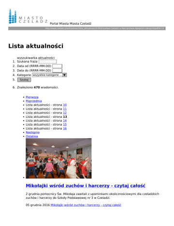 Portal Miasta Miasta Czeladź http://www.czeladz.pl/aktualnosci/lista_aktualnosci/X-Mistrzostwa-Czeladzi-w-Narciarstwie-Alpejskim-zako/printpdf/st:13 Lista aktualności wyszukiwarka aktualności 1. Szukana fraza 2. Data od (RRRR-MM-DD) 3. Data do (RRRR-MM-DD) 4. Kategorie wszystkie kategorie ... ▼ 5. Szukaj 6. Znaleziono 470 wiadomości. Pierwsza Poprzednia Lista aktualności - strona 10 Lista aktualności - strona 11 Lista aktualności - strona 12 Lista aktualności - strona 13 Lista aktualności - strona 14 Lista aktualności - strona 15 Lista aktualności - strona 16 Następna Ostatnia Mikołajki wśród zuchów i harcerzy - czytaj całość 2 grudnia pomocnicy Św. Mikołaja zawitali z upominkami okolicznościowymi dla czeladzkich zuchów i harcerzy do Szkoły Podstawowej nr 3 w Czeladzi. 05 grudnia 2016 Mikołajki wśród zuchów i harcerzy - czytaj całość Świętego Mikołaja spotkasz na Rynku - czytaj całość 6 grudnia od godz. 15.00 do 19.00 na czeladzkim Rynku będzie czekał na dzieci Święty Mikołaj. 02 grudnia 2016 Świętego Mikołaja spotkasz na Rynku - czytaj całość Ziołowe ABC - czytaj całość 1 grudnia (czwartek) o godz. 17.00 zapraszamy na kolejne spotkanie z Adamem Opoką w ramach cyklu Ziołowe ABC. 29 listopada 2016 Ziołowe ABC - czytaj całość Czeladzkie Forum Przedsiębiorczości - czytaj całość 25 listopada 2016 roku w salach konferencyjnych hotelu „Szafran”, z inicjatywy władz miasta, odbyło się pierwsze w historii Czeladzkie Forum Przedsiębiorczości. 28 listopada 2016 Czeladzkie Forum Przedsiębiorczości - czytaj całość Barbórka na placu Viannay'a odwołana - czytaj całość Informujemy, że w związku z tragedią w kopalni "Rudna" w Polkowicach, odwołujemy wszystkie imprezy związane z organizacją Barbórki w Czeladzi. 28 listopada 2016 Barbórka na placu Viannay'a odwołana - czytaj całość Czas na Twój głos - czytaj całość Już w poniedziałek, 28 listopada rusza głosowanie. Każdy mieszkaniec będzie mógł wybrać jeden z ośmiu projektów. 26 listopada 2016 Czas na Twój głos - czytaj całość Rodzinny Turniej Family Cup w Badmintonie - czytaj całość 19 listopada odbył się pierwszy rodzinny turniej z cyklu Family Cup w badmintonie. Organizatorem imprezy był Miejski Ośrodek Sportu i Rekreacji oraz Stowarzyszenie Forum Czeladzian. 23 listopada 2016 Rodzinny Turniej Family Cup w Badmintonie - czytaj całość Czeladzka Akademia Rodzica - czytaj całość Na program składać będą się wspólne działania organizacji i instytucji miejskich. Pod szyldem Akademii realizowana będzie atrakcyjna i bogata oferta dla rodziców i ich dzieci. 22 listopada 2016 Czeladzka Akademia Rodzica - czytaj całość II Turniej Grand Prix Czeladzi w Badmintonie - czytaj całość Miejski Szkolny Związek Sportowy zaprasza mieszkańców na: II Turniej Grand Prix Czeladzi w Badmintonie 22 listopada 2016 II Turniej Grand Prix Czeladzi w Badmintonie - czytaj całość Przełajowy Bieg i Nordnic Walking "Barbórka 2016" czytaj całość Zapraszamy na kolejną edycję Przegłajowego Biegu i Nordic Walking "Barbórka 2016", który odbędzie się 03.12.2016 r, o godzinie 10:00 przy Hali MOSiR Czeladź, ul.Sportowa 2. Trasą zawodów będą tereny wokół obiektów MOSiR i Parku "Grabek". 22 listopada 2016 Przełajowy Bieg i Nordnic Walking "Barbórka 2016" - czytaj całość Pierwsza Poprzednia Lista aktualności - strona 10 Lista aktualności - strona 11 Lista aktualności - strona 12 Lista aktualności - strona 13 Lista aktualności - strona 14 Lista aktualności - strona 15 Lista aktualności - strona 16 Następna Ostatnia