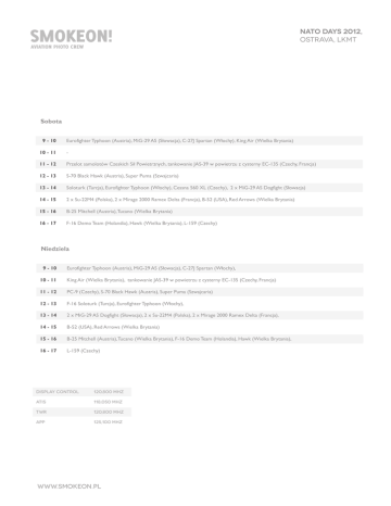 NATO Days 2012, Ostrava, LKMT Sobota 9 - 10 Eurofighter Typhoon (Austria), MiG-29 AS (Słowacja), C-27J Spartan (Włochy), King Air (Wielka Brytania) 10 - 11 - 11 - 12 Przelot samolotów Czeskich Sił Powietrznych, tankowanie JAS-39 w powietrzu z cysterny EC-135 (Czechy, Francja) 12 - 13 S-70 Black Hawk (Austria), Super Puma (Szwajcaria) 13 - 14 Soloturk (Turcja), Eurofighter Typhoon (Włochy), Cessna 560 XL (Czechy), 2 x MiG-29 AS Dogfight (Słowacja) 14 - 15 2 x Su-22M4 (Polska), 2 x Mirage 2000 Ramex Delta (Francja), B-52 (USA), Red Arrows (Wielka Brytania) 15 - 16 B-25 Mitchell (Austria), Tucano (Wielka Brytania) 16 - 17 F-16 Demo Team (Holandia), Hawk (Wielka Brytania), L-159 (Czechy) Niedziela 9 - 10 Eurofighter Typhoon (Austria), MiG-29 AS (Słowacja), C-27J Spartan (Włochy), 10 - 11 King Air (Wielka Brytania), tankowanie JAS-39 w powietrzu z cysterny EC-135 (Czechy, Francja) 11 - 12 PC-9 (Czechy), S-70 Black Hawk (Austria), Super Puma (Szwajcaria) 12 - 13 F-16 Soloturk (Turcja), Eurofighter Typhoon (Włochy), 13 - 14 2 x MiG-29 AS Dogfight (Słowacja), 2 x Su-22M4 (Polska), 2 x Mirage 2000 Ramex Delta (Francja), 14 - 15 B-52 (USA), Red Arrows (Wielka Brytania) 15 - 16 B-25 Mitchell (Austria), Tucano (Wielka Brytania), F-16 Demo Team (Holandia), Hawk (Wielka Brytania), 16 - 17 L-159 (Czechy) Display Control 120,800 MHz ATIS 118,050 MHz TWR 120,800 MHz APP 125,100 MHz WWW.smokeon.pl