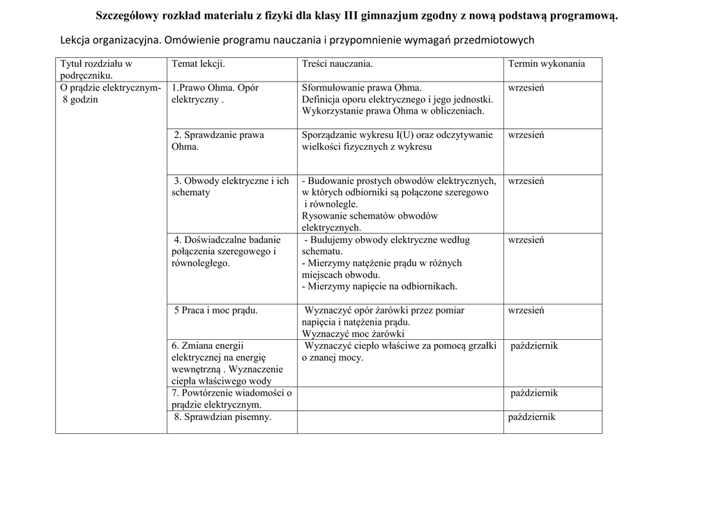 Szczegółowy rozkład materiału z fizyki dla klasy III gimnazjum