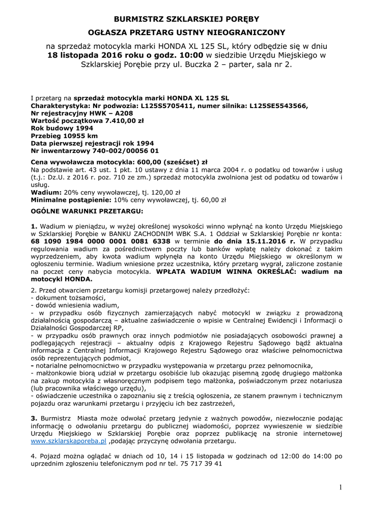 BURMISTRZ SZKLARSKIEJ PORĘBY OGŁASZA PRZETARG USTNY NIEOGRANICZONY na sprzedaż motocykla marki HONDA XL 125 SL, który odbędzie się w dniu 18 listopada 2016 roku o godz. 10:00 w siedzibie Urzędu Miejskiego w Szklarskiej Porębie przy ul. Buczka 2 – parter, sala nr 2. I przetarg na sprzedaż motocykla marki HONDA XL 125 SL Charakterystyka: Nr podwozia: L125S5705411, numer silnika: L125SE5543566, Nr rejestracyjny HWK – A208 Wartość początkowa 7.410,00 zł Rok budowy 1994 Przebieg 10955 km Data pierwszej rejestracji rok 1994 Nr inwentarzowy 740-002/00056 01 Cena wywoławcza motocykla: 600,00 (sześćset) zł Na podstawie art. 43 ust. 1 pkt. 10 ustawy z dnia 11 marca 2004 r. o podatku od towarów i usług (t.j.: Dz.U. z 2016 r. poz. 710 ze zm.) sprzedaż motocykla zwolniona jest od podatku od towarów i usług. Wadium: 20% ceny wywoławczej, tj. 120,00 zł Minimalne postąpienie: 10% ceny wywoławczej, tj. 60,00 zł OGÓLNE WARUNKI PRZETARGU: 1. Wadium w pieniądzu, w wyżej określonej wysokości winno wpłynąć na konto Urzędu Miejskiego w Szklarskiej Porębie w BANKU ZACHODNIM WBK S.A. 1 Oddział w Szklarskiej Porębie nr konta: 68 1090 1984 0000 0001 0081 6338 w terminie do dnia 15.11.2016 r. W przypadku regulowania wadium za pośrednictwem poczty lub banków wpłatę należy dokonać z takim wyprzedzeniem, aby kwota wadium wpłynęła na konto Urzędu Miejskiego w określonym w ogłoszeniu terminie. Wadium wniesione przez uczestnika, który przetarg wygrał, zaliczone zostanie na poczet ceny nabycia motocykla. WPŁATA WADIUM WINNA OKREŚLAĆ: wadium na motocykl HONDA. 2. Przed otwarciem przetargu komisji przetargowej należy przedłożyć: - dokument tożsamości, - dowód wniesienia wadium, - w przypadku osób fizycznych zamierzających nabyć motocykl w związku z prowadzoną działalnością gospodarczą – aktualne zaświadczenie o wpisie w Centralnej Ewidencji i Informacji o Działalności Gospodarczej RP, - w przypadku osób prawnych oraz innych podmiotów nie posiadających osobowości prawnej a podlegających rejestracji – aktualny odpis z Krajowego Rejestru Sądowego bądź aktualna informacja z Centralnej Informacji Krajowego Rejestru Sądowego oraz właściwe pełnomocnictwa osób reprezentujących podmiot, - notarialne pełnomocnictwo w przypadku występowania w przetargu przez pełnomocnika, - małżonkowie biorą udział w przetargu osobiście lub okazując pisemną zgodę drugiego małżonka na zakup motocykla z własnoręcznym podpisem tego małżonka, poświadczonym przez notariusza (lub pracownika właściwego urzędu), - oświadczenie uczestnika o zapoznaniu się z treścią ogłoszenia, ze stanem prawnym i technicznym pojazdu oraz warunkami przetargu i przyjęciu ich bez zastrzeżeń, 3. Burmistrz Miasta może odwołać przetarg jedynie z ważnych powodów, niezwłocznie podając informację o odwołaniu przetargu do publicznej wiadomości, poprzez wywieszenie w siedzibie Urzędu Miejskiego w Szklarskiej Porębie oraz poprzez publikację na stronie internetowej www.szklarskaporeba.pl ,podając przyczynę odwołania przetargu. 4. Pojazd można oglądać w dniach od 10, 14 i 15 listopada w godzinach od 12:00 do 14:00 po uprzednim zgłoszeniu telefonicznym pod nr tel. 75 717 39 41 1 5. Przetarg jest ważny bez względu na liczbę uczestników przetargu, jeżeli przynajmniej jeden uczestnik zaoferował co najmniej jedno postąpienie powyżej ceny wywoławczej. Szczegółowych informacji udziela Komendant Straży Miejskiej, w Siedzibie Straży Miejskiej (75) 717 39 41. Ogłoszenie o przetargu zamieszcza się na stronie internetowej pod adresem: www.szklarskaporeba.pl; na tablicy ogłoszeń w Urzędzie Miejskim Szklarska Poręba, 03 listopad 2016 r. 2