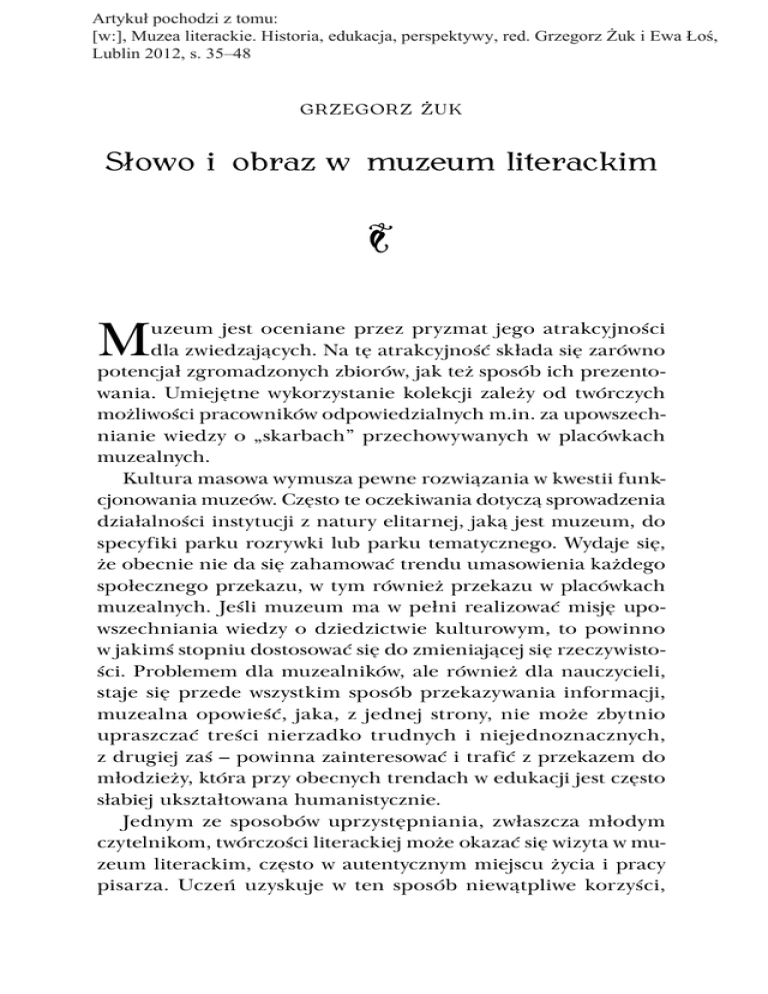 Artykuł pochodzi z tomu: [w:], Muzea literackie. Historia, edukacja, perspektywy, red. Grzegorz Żuk i Ewa Łoś, Lublin 2012, s. 35–48 GRZEGORZ ŻUK Słowo i obraz w muzeum literackim • M uzeum jest oceniane przez pryzmat jego atrakcyjności dla zwiedzających. Na tę atrakcyjność składa się zarówno potencjał zgromadzonych zbiorów, jak też sposób ich prezentowania. Umiejętne wykorzystanie kolekcji zależy od twórczych możliwości pracowników odpowiedzialnych m.in. za upowszechnianie wiedzy o „skarbach” przechowywanych w placówkach muzealnych. Kultura masowa wymusza pewne rozwiązania w kwestii funkcjonowania muzeów. Często te oczekiwania dotyczą sprowadzenia działalności instytucji z natury elitarnej, jaką jest muzeum, do specyfiki parku rozrywki lub parku tematycznego. Wydaje się, że obecnie nie da się zahamować trendu umasowienia każdego społecznego przekazu, w tym również przekazu w placówkach muzealnych. Jeśli muzeum ma w pełni realizować misję upowszechniania wiedzy o dziedzictwie kulturowym, to powinno w jakimś stopniu dostosować się do zmieniającej się rzeczywistości. Problemem dla muzealników, ale również dla nauczycieli, staje się przede wszystkim sposób przekazywania informacji, muzealna opowieść, jaka, z jednej strony, nie może zbytnio upraszczać treści nierzadko trudnych i niejednoznacznych, z drugiej zaś – powinna zainteresować i trafić z przekazem do młodzieży, która przy obecnych trendach w edukacji jest często słabiej ukształtowana humanistycznie. Jednym ze sposobów uprzystępniania, zwłaszcza młodym czytelnikom, twórczości literackiej może okazać się wizyta w muzeum literackim, często w autentycznym miejscu życia i pracy pisarza. Uczeń uzyskuje w ten sposób niewątpliwe korzyści, 36 • Grzegorz Żuk poznaje dom twórcy, a dzięki temu wyobrażenie o atmosferze pracy, aurze towarzyszącej artyście w działaniach twórczych. „Muzeum – jak pisze Maria Różańska-Półturzycka – poprzez ukazywanie pomieszczeń, w jakich żyli i tworzyli pisarze, pozwala umiejscowić te luźne obrazy i treści, powiązać je z konkretnymi sprzętami, przedmiotami i narzędziami pracy pisarza, może więc wypełnić lukę, która powstaje między słowem a pojęciem i wyobrażeniem”1. Muzeum literackie staje się naturalnym pomocnikiem nauczyciela w edukacji literackiej, przemawiając słowem, ale też eksponatem: piórem, maszyną do pisania, zdjęciem czy portretem twórcy, codziennym jego otoczeniem. Powstała w ten sposób niepowtarzalna aura ma szansę twórczo oddziaływać na wyobraźnię ucznia, poszerzać i utrwalać wiedzę. Co prawda, nie zawsze muzeum jest utworzone w autentycznym miejscu, ale nawet obecność w nim przedmiotów bliskich pisarzowi, rękopisów jego dzieł, możliwość wysłuchania jego głosu, obejrzenie filmu, daje namiastkę poznania klimatu, w jakim żył i pracował. Przywilej wizyty we wnętrzu, w jakim tworzył pisarz, dany jest m.in. w Chacie Stefana Żeromskiego w Nałęczowie czy w Muzeum im. Anny i Jerzego Iwaszkiewiczów w Stawisku. Każdy jednak oryginalny przedmiot związany z twórcą pozwala na dotknięcie przeszłości, na wytworzenie emocjonalnej bliskości z osobą pisarza, niezależnie od miejsca, w którym jest eksponowany. Pewne standardy postępowania przy tworzeniu ekspozycji literackich w Polsce wyznaczyła literacka metoda ekspozycji, jaka pojawiła się w Polsce, a konkretnie w Muzeum Literatury im. Adama Mickiewicza w Warszawie już w połowie ubiegłego wieku. Inspirację dla muzealników stanowiła konieczność zorganizowania wystawy w miejscu, z którym nie był związany żaden pisarz. Nie próbowano więc odtworzyć gabinetu Mickiewicza „jak za życia pisarza”, ale stworzono ekspozycję wykorzystującą elementy plastyczne, a nawet teatralne. Jak pisze Elżbieta Szymańska, „powstał odrębny, artystyczny język ekspozycji literackiej, która 1 M. Różańska-Półturzycka, Muzea literackie w nauczaniu języka polskiego, [w:] Muzea i nauczanie, red. A. Kunysz i Z. J. Mikołajtis, Przemyśl 1975, s. 71. Słowo i obraz w muzeum literackim 37 jest nie tyle pokazywana, ile inscenizowana przez autora scenariusza, plastyka i realizatorów. Dzięki wykorzystaniu w oprawie plastycznej światła, dźwięku, kostiumów, rekwizytów, manekinów, wielkich powiększeń fotograficznych, eksponaty muzealne są wpisywane w przestrzeń tak zorganizowaną, aby poza wiedzą o pisarzu i jego epoce przekazać nastrój, symbole, metafory, bogactwo znaczeń i problemów zawartych w jego dziełach”2. U podstaw tej literackiej metody wystawienniczej leżą dwie główne zasady: 1. Utwór literacki jest traktowany jako dzieło sztuki, 2. Wystawa powinna odwoływać się do emocji zwiedzających. Z pewnością dzięki takiemu zabiegowi muzeum zyskało szerszą publiczność, ponieważ obecne w polskich muzeach literackich tablice z kalendarium życia i twórczości pisarza, gabloty z rękopisami, książkami, w małym stopniu przyciągają uwagę zwiedzających. W roku 2007, z okazji 150. rocznicy urodzin Konrada Korzeniowskiego – Josepha Conrada w Muzeum Literatury im. Adama Mickiewicza w Warszawie przygotowano wystawę pt. Joseph Conrad. Między lądem a morzem. 1859–1924. Autorką scenariusza wystawy była Elżbieta Szymańska, konsultantem naukowym prof. Zdzisław Najder, autorem projektu plastycznego Adam Orlewicz. Tytuł ekspozycji zapożyczono ze zbioru opowiadań Conrada Twix land and sea z roku 1912 i zgodnie z koncepcją autorów wystawa „[o]twiera przestrzeń »między lądem a morzem«, gdzie pomieścić się mogą marzenia, uczucia, wybory moralne, wspomnienia, a nade wszystko sztuka”3. Nieprzypadkowo chyba na początku pojawiło się marzenie, od cytatu z powieści Lord Jim zaczyna się bowiem opis wystawy: „Iść za marzeniem i znowu iść za marzeniem – i tak zawsze – usque ad finem…” 2 3 E. Szymańska, Funkcja edukacyjno-wy