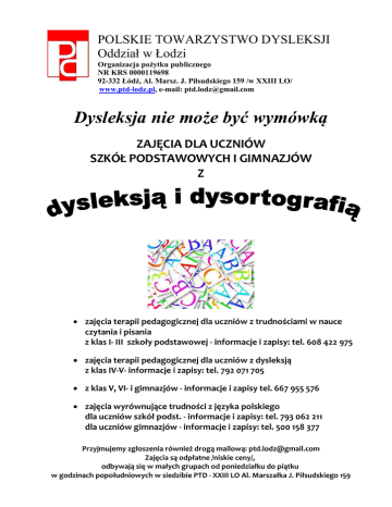 POLSKIE TOWARZYSTWO DYSLEKSJI Oddział w Łodzi Organizacja pożytku publicznego NR KRS 0000119698 92-332 Łódź, Al. Marsz. J. Piłsudskiego 159 /w XXIII LO/ www.ptd-lodz.pl, e-mail: [email protected] Dysleksja nie może być wymówką ZAJĘCIA DLA UCZNIÓW SZKÓŁ PODSTAWOWYCH I GIMNAZJÓW Z zajęcia terapii pedagogicznej dla uczniów z trudnościami w nauce czytania i pisania z klas I- III szkoły podstawowej - informacje i zapisy: tel. 608 422 975 zajęcia terapii pedagogicznej dla uczniów z dysleksją z klas IV-V- informacje i zapisy: tel. 792 071 705 z klas V, VI- i gimnazjów - informacje i zapisy tel. 667 955 576 zajęcia wyrównujące trudności z języka polskiego dla uczniów szkół podst. - informacje i zapisy: tel. 793 062 211 dla uczniów gimnazjów - informacje i zapisy: tel. 500 158 377 Przyjmujemy zgłoszenia również drogą mailową: [email protected] Zajęcia są odpłatne /niskie ceny/, odbywają się w małych grupach od poniedziałku do piątku w godzinach popołudniowych w siedzibie PTD - XXIII LO Al. Marszałka J. Piłsudskiego 159