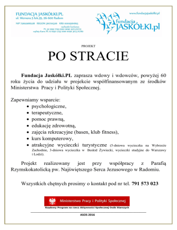 PROJEKT PO STRACIE Fundacja Jaskółki.PL zaprasza wdowy i wdowców, powyżej 60 roku życia do udziału w projekcie współfinansowanym ze środków Ministerstwa Pracy i Polityki Społecznej. Zapewniamy wsparcie: psychologiczne, terapeutyczne, pomoc prawną, edukację zdrowotną, zajęcia rekreacyjne (basen, klub fitness), kurs komputerowy, atrakcyjne wycieczki turystyczne (5-dniowa wycieczka na Wybrzeże Zachodnie, 3-dniowa wycieczka w Beskid Żywiecki, wycieczki studyjne do Warszawy i Łodzi). Projekt realizowany jest przy współpracy z Parafią Rzymskokatolicką pw. Najświętszego Serca Jezusowego w Radomiu. Wszystkich chętnych prosimy o kontakt pod nr tel. 791 573 023 _______________________________________________________________________ ASOS 2016 Stracie najbliższej osoby towarzyszy samotność, która karmiona przekonaniem, że nie istnieje nikt, kto jest w stanie zrozumieć indywidualne cierpienie, pogłębia się i prowadzi do zerwania więzi rodzinnych, sąsiedzkich, towarzyskich, zaś w wymiarze indywidualnym, do chorób, a czasami nieodwracalnych schorzeń. Wychodząc naprzeciw temu problemowi, postanowiliśmy zaangażować KLUB PO STRACIE, który zminimalizuje skutki indywidualnych nieszczęść i otoczyć opieką osoby dotknięte tragedią w okresie przeżywanej traumy. Program klubu wsparty jest doświadczeniem ekspertów z wielu dziedzin: psychologa, terapeuty, specjalisty ds. zdrowego stylu życia, informatyka i prawnika. Zajęcia z psychologiem i terapeutą mają na celu pomoc osobom, których dotknęła strata w jej przeżywaniu i nabraniu sił do dalszego funkcjonowania. Zaplanowano szereg wykładów i zajęć praktycznych z doświadczoną pielęgniarką – fizjoterapeutą dla uświadomienia podopiecznym Fundacji potrzeby podejmowania działań mających na celu zachowanie zdrowia w jak najlepszym stanie oraz zaproponowania rozwiązań, które pozwolą osiągnąć ten cel. Uczestnicy projektu, będą mogli również wziąć udział w szkoleniach z zakresu posługiwania się komputerem, a w szczególności korzystania z portali społecznościowych. Ponadto zapewniono możliwość kontaktu z adwokatem, który pomoże w rozwiązaniu problemów z różnych dziedzin prawa, w tym prawa spadkowego, które związane są ze śmiercią osoby. KLUB PO STRACIE, funkcjonuje we współpracy z Parafią Rzymskokatolicką p.w. Najświętszego Serca Jezusowego przy ul. Kościelnej 1 w Radomiu, gdzie organizowana jest większość zajęć. Zajęcia w Klubie odbywają się dwa razy w tygodniu, zgodnie z ustalonym harmonogramem. W ramach projektu zorganizowanych zostanie szereg imprez o charakterze integracyjnym z elementami turystyki, krajoznawstwa oraz kultury, podczas których klubowicze obok rozładowania napięć i stresu, poznają się bliżej, a przy okazji nabędą nowe kompetencje. Uczestnicy mogą skorzystać z oferty rekreacyjnej, (basen, kluby fitness), a także wziąć udział w atrakcyjnych wycieczkach plenerowych: 5dniowej na Wybrzeże Zachodnie, 3-dniowej w Beskid Żywiecki oraz wycieczkach studyjnych do Warszawy i Łodzi. Mamy nadzieję, że realizując zaplanowane zadania sprawimy, iż zły czas stanie się przeszłością, a przed uczestnikami otworzą się nowe perspektywy aktywności. Realizacja zaplanowanych zadań pomocowych sprawi, że czas żałoby przeżywany w atmosferze zrozumienia i w towarzystwie osób podobnie doświadczonych przez los przywróci wiarę zarówno w człowieka, jak i instytucje publiczne, a także otworzy nowe perspektywy życia. Pomysłodawcą projektu jest adw. Dariusz Adamczyk, który spotykając się na co dzień z ludzkimi trudnościami, zwrócił uwagę na salę problemu, jakim jest samotność po stracie najbliższej sercu osoby współmałżonka. Wieloletnie doświadczenie pozwoliło na określenie rodzaju potrzeb zgłaszanych przez wdowy i wdowców, co umożliwiło zaangażowanie specjalistów z wybranych dziedzin. _______________________________________________________________________ ASOS 2016 Głównym partnerem działań jest Parafia Rzymskokatolicka p.w. Najświętszego Serca Jezusowego w Radomiu. Projekt dofinansowano ze środków Ministerstwa Pracy i Polityki Społecznej w ramach Rządowego Programu na rzecz Aktywności Społecznej Osób Starszych ASOS 2016. Serdecznie zapraszamy do współpracy zarówno osoby, które doświadczyły straty, a w chwili obecnej chcą pomóc innym przetrwać te trudne chwile jak i osoby potrzebujące wsparcia. Projekt jest kierowany do osób, które ukończyły 60 rok życia i w nieodległym czasie utraciły współmałżonka. Harmonogram zajęć KLUBU PO STRACIE oraz Regulamin udziału w projekcie został opublikowany na stronie internetowej Fundacji Jaskółki.PL www.fundacja-jaskolki.pl. Informacje dotyczące projektu PO STRACIE można również uzyskać w Punktach Informacyjnych: 1. Potworów, ul. Łódzka 4a, 26-414 Potworów; 2. Białobrzegi, ul. Kościelna 22, 26-800 Białobrzegi; 3. Marianowice 4, 26-652 Zakrzew; 4. Fundacja Jaskółki.Pl, ul. Wernera 5 lok 35, 26-600 Radom. Wszystkie osoby zainteresowane uczestnictwem w projekcie prosimy o kontakt pod nr tel.791 573 023. Mapa dojazdu do domu parafialnego Parafią Rzymskokatolicką p.w. Najświętszego Serca Jezusowego przy ul. Kościelnej 1 w Radomiu. _______________________________________________________________________ ASOS 2016 Mapy dojazdu do siedziby Fundacji Jaskółki.PL. Punkt A – dworzec PKP, ul. Władysława Prażmowskiego - Beliny 2, 26-605, Radom; Punkt B – Fundacja Jaskółki PL., ul. Wernera 5 lok. 35, 26-600 Radom 1. _______________________________________________________________________ ASOS 2016 2. _______________________________________________________________________ ASOS 2016