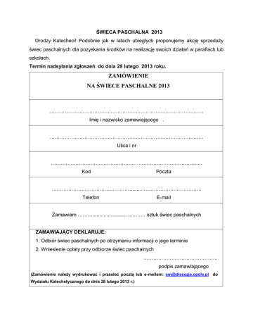 ŚWIECA PASCHALNA 2013 Drodzy Katecheci! Podobnie jak w latach ubiegłych proponujemy akcję sprzedaży świec paschalnych dla pozyskania środków na realizację swoich działań w parafiach lub szkołach. Termin nadsyłania zgłoszeń: do dnia 28 lutego 2013 roku. ZAMÓWIENIE NA ŚWIECE PASCHALNE 2013 ………………………………………………………………………………… Imię i nazwisko zamawiającego . ………………………………………………………………………………… Ulica i nr ……………………………………………………………………………..… Kod Poczta …………………………………………........……………………………… Telefon E-mail Zamawiam ………........................………… sztuk świec paschalnych ZAMAWIAJĄCY DEKLARUJE: 1. Odbiór świec paschalnych po otrzymaniu informacji o jego terminie 2. Wniesienie opłaty przy odbiorze świec paschalnych ……………………………………… podpis zamawiającego (Zamówienie należy wydrukować i przesłać pocztą lub e-meilem: [email protected] do Wydziału Katechetycznego do dnia 28 lutego 2013 r.)