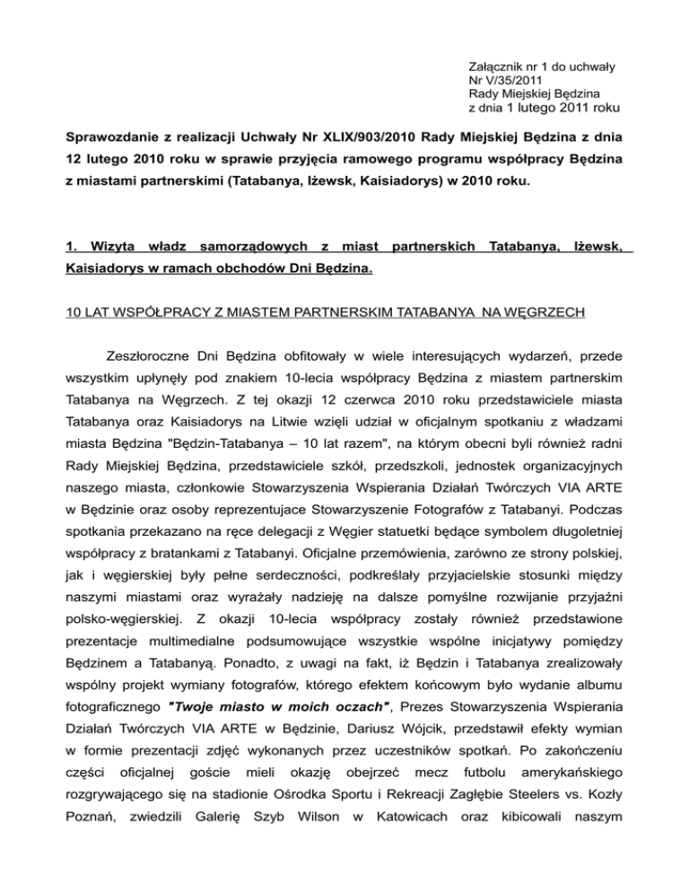 Załącznik nr 1 do uchwały Nr V/35/2011 Rady Miejskiej Będzina z dnia 1 lutego 2011 roku Sprawozdanie z realizacji Uchwały Nr XLIX/903/2010 Rady Miejskiej Będzina z dnia 12 lutego 2010 roku w sprawie przyjęcia ramowego programu współpracy Będzina z miastami partnerskimi (Tatabanya, Iżewsk, Kaisiadorys) w 2010 roku. 1. Wizyta władz samorządowych z miast partnerskich Tatabanya, Iżewsk, Kaisiadorys w ramach obchodów Dni Będzina. 10 LAT WSPÓŁPRACY Z MIASTEM PARTNERSKIM TATABANYA NA WĘGRZECH Zeszłoroczne Dni Będzina obfitowały w wiele interesujących wydarzeń, przede wszystkim upłynęły pod znakiem 10-lecia współpracy Będzina z miastem partnerskim Tatabanya na Węgrzech. Z tej okazji 12 czerwca 2010 roku przedstawiciele miasta Tatabanya oraz Kaisiadorys na Litwie wzięli udział w oficjalnym spotkaniu z władzami miasta Będzina "Będzin-Tatabanya – 10 lat razem", na którym obecni byli również radni Rady Miejskiej Będzina, przedstawiciele szkół, przedszkoli, jednostek organizacyjnych naszego miasta, członkowie Stowarzyszenia Wspierania Działań Twórczych VIA ARTE w Będzinie oraz osoby reprezentujace Stowarzyszenie Fotografów z Tatabanyi. Podczas spotkania przekazano na ręce delegacji z Węgier statuetki będące symbolem długoletniej współpracy z bratankami z Tatabanyi. Oficjalne przemówienia, zarówno ze strony polskiej, jak i węgierskiej były pełne serdeczności, podkreślały przyjacielskie stosunki między naszymi miastami oraz wyrażały nadzieję na dalsze pomyślne rozwijanie przyjaźni polsko-węgierskiej. Z okazji 10-lecia współpracy zostały również przedstawione prezentacje multimedialne podsumowujące wszystkie wspólne inicjatywy pomiędzy Będzinem a Tatabanyą. Ponadto, z uwagi na fakt, iż Będzin i Tatabanya zrealizowały wspólny projekt wymiany fotografów, którego efektem końcowym było wydanie albumu fotograficznego "Twoje miasto w moich oczach", Prezes Stowarzyszenia Wspierania Działań Twórczych VIA ARTE w Będzinie, Dariusz Wójcik, przedstawił efekty wymian w formie prezentacji zdjęć wykonanych przez uczestników spotkań. Po zakończeniu części oficjalnej goście mieli okazję obejrzeć mecz futbolu amerykańskiego rozgrywającego się na stadionie Ośrodka Sportu i Rekreacji Zagłębie Steelers vs. Kozły Poznań, zwiedzili Galerię Szyb Wilson w Katowicach oraz kibicowali naszym samorządowcom w meczu ARTYŚCI POLSCY kontra REPREZENTACJA BĘDZINA. Wieczorem delegacje udały się na koncerty odbywające się przy zamku. Kolejnego dnia zwiedzili malowniczą Jurę Krakowsko-Częstochowską. Równolegle, od 10 do 13 czerwca 2010 roku w ramach wyżej wymienionego projektu wymiany fotografów w Będzinie przebywali węgierscy przedstawiciele Stowarzyszenia Fotografów z Tatabanyi. Podczas wizyty fotografowali Teatr Dzieci Zagłębia, kirkut i tereny parku na Wzgórzu Zamkowym w Będzinie, wzięli również udział w wernisażu i wystawie Andrzeja Kopki w Miejskiej i Powiatowej Bibliotece Publicznej zorganizowanej z okazji jubileuszu 20-lecia działalności artystycznej. W programie było również zwiedzanie osiedla Giszowiec w Katowicach, Pałacu Schöna wraz z przyległym parkiem w Sosnowcu oraz Mirowa i Bobolic. Fotografowie wzięli udział w spotkaniu "Będzin-Tatabanya – 10 lat razem", a następnie udali się do centrum miasta, aby udokumentować imprezy odbywające się w ramach Dni Będzina. Po południu udali się do Galerii Szyb Wilson w Katowicach, by obejrzeć fotografie Marka Stańczyka z cyklu Cementownia "Grodziec" oraz pokaz pracy videoart "Made in Silesia. Przemysłowy Krajobraz". 2. Wystawa litewskiego fotografa w Będzinie. W okresie wakacyjnym (lipiec-sierpień) Biuro Współpracy z Zagranicą zorganizowało wystawę litewskiego fotografa Ricardasa Grigasa z miasta partnerskiego Kaisiadorys. Tematyka zdjęć przedstawiała drogę Litwy do niepodległości od 1987 roku. 3. Oficjalne wizyty władz samorządowych miasta Będzina w Tatabanyi, Iżewsku oraz w Kaisiadorys. • Partnerska wizyta w Tatabanyi (Węgry) W dniach 3-6 września 2010 roku delegacja z Będzina przebywała w Tatabanyi na Węgrzech w związku z corocznymi obchodami Dni Miasta Tatabanya oraz jubileuszem 10-lecia partnerskiej współpracy pomiędzy naszymi miastami. Trzeba wyraźnie podkreślić, że współpraca ta jest owocna i przebiega w bardzo dobrej atmosferze. Wspólne projekty w obu miastach realizują sportowcy, zespoły muzyczne, orkiestry, przedsiębiorcy, młodzież szkolna, a także przedszkola. Pierwszym ważnym punktem spotkania była wystawa fotograficzna prezentująca oba miasta oczami fotografów będzińskiego Stowarzyszenia Wspierania Działań Twórczych ViaArte i Stowarzyszenia Pracownia Fotograficzna Obraz-Kolor-Przestrzeń z Tatabanyi. Dzięki aktywnej współpracy pomiędzy organizacjami i zaangażowaniu przedstawicieli samorządowych Będzina i Tatabanyi powstał jeden z wielu materialnych dowodów dziesięcioletniego współdziałania obu miast partnerskich – album fotograficzny „Twoje miasto w moich oczach”. Podczas wizyty zorganizowano spotkanie poświęcone organizacjom pozarządowym z miast partnerskich Tatabanyi. O lokalnych stowarzyszeniach mówili przedstawiciele Będzina, Aalen (Niemcy) oraz Christchurch (Anglia). Dni Tatabanyi co roku połączone są z obchodami Dnia Górnika, celebrowanymi w tym mieście w sposób szczególny poprzez złożenie kwiatów pod pomnikiem poległych górników, uroczystościami na terenie skansenu przykopalnianego i widowiskowym marszem „Salamandry” z lampami górniczymi zakończonym pokazem sztucznych ogni. Dla uczczenia 22 tysięcy polskich męczenników zamordowanych w Katyniu w 1940 roku oraz ofiar katastrofy lotniczej pod Smoleńskiem w 2010 roku delegacje wszystkich miast złożyły kwiaty w miejscu pamięci w Tatabanyi. • Partnerska wizyta w Kaisiadorys ( Litwa) Zeszłoroczne Dni Kaisiadorys (9-13 września 2010) miały szczególne znaczenie 