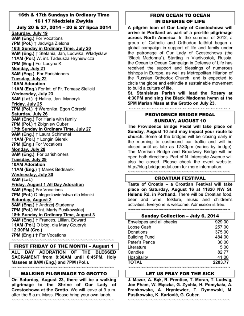16th & 17th Sundays in Ordinary Time 16 i 17 Niedziela Zwykła July 20 & 27, 2014 – 20 & 27 lipca 2014 Saturday, July 19 8AM (Eng.) For Vocations 7PM (Pol.) † Jadwiga Zielona 16th Sunday in Ordinary Time, July 20 9AM (Eng.) † Stefania, Jan, Ludwika, Władysław 11AM (Pol.) W. int. Tadeusza Hryniewicza 7PM (Eng.) For Lucyna K. Monday, July 21 8AM (Eng.) For Parishioners Tuesday, July 22 10AM Adoration 11AM (Eng.) For int. of Fr. Tomasz Sielicki Wednesday, July 23 8AM (Lat.) † Halina, Jan Manoryk Friday, July 25 7PM (Pol.) † Weronika, Egon Górecki Saturday, July 26 8AM (Eng.) For Hania with family 7PM (Pol.) † Zbigniew Cuber 17th Sunday in Ordinary Time, July 27 9AM (Eng.) † Laura Schimmel 11AM (Pol.) † Longin Gierek 7PM (Eng.) For Vocations Monday, July 28 8AM (Eng.) For parishioners Tuesday, July 29 10AM Adoration 11AM (Eng.) † Marek Bednarski Wednesday, July 30 8AM (Lat.) Friday, August 1 All Day Adoration 8AM (Eng.) For Vocations 7PM (Pol.) O błogosławieństwo dla Moniki Saturday, August 2 8AM (Eng.) † Andrzej Studenny 7PM (Pol.) W int. Marty Pustkowskiej 18th Sunday in Ordinary Time, August 3 9AM (Eng.) † Frances, Lillian, Edward 11AM (Pol.) O błog. dla Mary Czupryk 12:30PM (Cro.) 7PM (Eng.) † For Vocations ~~~~~~~~~~~~~~~~~~~~~~~~~~~~~~~~~~~~~~~~ FIRST FRIDAY OF THE MONTH – August 1 ALL DAY ADORATION OF THE BLESSED SACRAMENT from 8:30AM until 6:45PM. Holy Masses at 8AM (Eng.) and 7PM (Pol.). ~~~~~~~~~~~~~~~~~~~~~~~~~~~~~~~~~~~~~~~~ WALKING PILGRIMAGE TO GROTTO On Saturday, August 23, there will be a walking pilgrimage to the Shrine of Our Lady of Czestochowa at the Grotto. We will leave at 9 a.m. after the 8 a.m. Mass. Please bring your own lunch. ~~~~~~~~~~~~~~~~~~~~~~~~~~~~~~~~~~~~~~~~ FROM OCEAN TO OCEAN IN DEFENSE OF LIFE A pilgrim icon of Our Lady of Czestochowa will arrive in Portland as part of a pro-life pilgrimage across North America. In the summer of 2012, a group of Catholic and Orthodox faithful began a global campaign in support of life and family under the patronage of Our Lady of Czestochowa (the “Black Madonna”). Starting in Vladivostok, Russia, the Ocean to Ocean Campaign in Defense of Life has received the support and blessings of numerous bishops in Europe, as well as Metropolitan Hilarion of the Russian Orthodox Church, and is expected to circle the globe and enkindle a sustainable movement to build a culture of life. St. Stanislaus Parish will lead the Rosary at 4:30PM and sing the Black Madonna hymn at the 5PM Marian Mass at the Grotto on July 23. ~~~~~~~~~~~~~~~~~~~~~~~~~~~~~~~~~~~~~~~~ PROVIDENCE BRIDGE PEDAL SUNDAY, AUGUST 10 The Providence Bridge Pedal will take place on Sunday, August 10 and may impact your route to church. Some of the bridges will be closing early in the morning to eastbound car traffic and will be closed until as late as 12:30pm (varies by bridge). The Morrison Bridge and Broadway Bridge will be open both directions. Part of N. Interstate Avenue will also be closed. Please check the event website, http://blog.bridgepedal.com for more information. ~~~~~~~~~~~~~~~~~~~~~~~~~~~~~~~~~~~~~~~~ CROATIAN FESTIVAL Taste of Croatia – a Croatian Festival will take place on Saturday, August 16 at 11820 NW St. Helens Rd. in Portland. There will be Croatian food, beer and wine, folklore, music and children’s activities. Everyone is welcome. Admission is free. ~~~~~~~~~~~~~~~~~~~~~~~~~~~~~~~~~~~~~~~~ Sunday Collection – July 6, 2014 Envelopes and all checks 929.00 Loose Cash 257.00 Donations 375.00 Building Fund 484.00 Peter’s Pence 30.00 Literature 5.00 Candles 82.77 Hospitality 41.00 TOTAL 2203.77 ~~~~~~~~~~~~~~~~~~~~~~~~~~~~~~~~~~~~~~~~ LET US PRAY FOR THE SICK J. Mazur, A. Bąk, R. Prentice, T. Moran, T. Ludwig, Joe Pham, W. Mączka, G. Zychla, H. Pomykała, A. Frankowska, A. Hryniewicz, T. Dymowski, M. Pustkowska, K. Karlović, G. Cuber. ~~~~~~~~~~~~~~~~~~~~~~~~~~~~~~~~~~~~~~~~ Papież Franciszek przeciw legalizacji miękkich narkotyków – „Wobec zła nie może być kompromisów ani ustępst” Papież Franciszek zdecydowanie sprzeciwił się legalizacji tak zwanych miękkich narkotyków. Nie ma tu miejsca na ustępstwa i kompromisy – powiedział Papież międzynarodowym ekspertom w tej dziedzinie. Spotkał się bowiem z uczestnikami dorocznego posiedzenia Międzynarodowej Konferencji Antynarkotykowej, która zakończyła się wczoraj w Rzymie. Skupia ona instytucje, które w poszczególnych krajach są odpowiedzialne za zwalczenie przestępstw narkotykowych. „Chcę to powiedzieć bardzo jasno: narkotyków nie zwalcza się narkotykami! Narkotyk jest złem, a ze złem nie można sobie pozwolić na ustępstwa czy kompromisy! Legalizacja, nawet ograniczona, tak zwanych <miękkich narkotyków>, nie tylko jest problematyczna pod względem legislacyjnym, ale także nie przynosi pożądanych efektów. Stosowanie narkotyków zastępczych nie umożliwia skutecznej terapii, lecz jest zakomuflowaną formą kapitulacji. Chcę tu powtórzyć to, co powiedziałem przy inych okazjach: <nie> dla jakichkolwiek narkotyków. Po prostu: <nie> dla narkotyków, jakichkolwiek”. ~~~~~~~~~~~~~~~~~~~~~~~~~~~~~~~~~~~~~~~~ „Od Oceanu do Oceanu” w obronie życia Pielgrzymujący obraz Matki Bożej Częstochowskiej przybędzie do Portland we wtorek 22 lipca. W środę, 23 lipca w Grotto jako parafia Św. Stanisława poprowadzimy różaniec o godz. 16:30, a potem weźmiemy udział we Mszy św. o godz. 17:00, podczas której zaśpiewamy pieśń „Czarna Madonna”. ~~~~~~~~~~~~~~~~~~~~~~~~~~~~~~~~~~~~~~~ CAŁODNIOWA ADORACJA – 1 sierpnia W Pierwszy Piątek Miesiąca – CAŁODNIOWA ADORACJA - od 8:30 do 18:50. Msze św. o godz. 8:00 (ang.), 19:00 (pol.). Wpisujemy się na listę. ~~~~~~~~~~~~~~~~~~~~~~~~~~~~~~~~~~~~~~~~ „Providence Bridge Pedal” – Niedziela, 10 sierpnia Doroczny rajd rowerzystów w Portland będzie w niedzielę 10 sierpnia. Z tego powodu niektóre mosty będą zamknięte co może skomplikować przyja