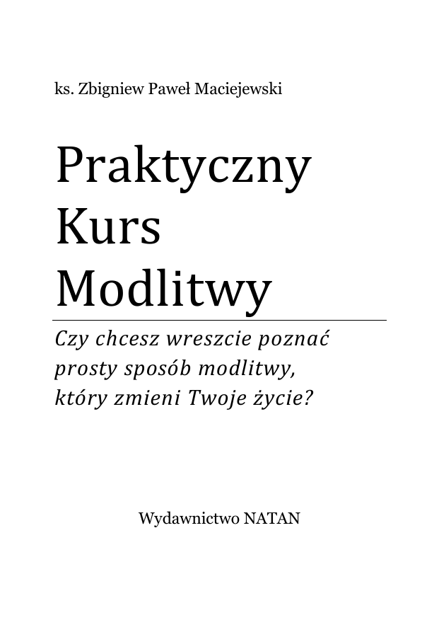 ks. Zbigniew Paweł Maciejewski Praktyczny Kurs Modlitwy Czy chcesz wreszcie poznać prosty sposób modlitwy, który zmieni Twoje życie? Wydawnictwo NATAN © Copyright by Wydawnictwo NATAN © Copyright by ks. Zbigniew Paweł Maciejewski Redakcja Ewa Leszczyńska Ilustracje i zdjęcie z okładki ks. Jarosław Bukowski Projekt okładki Jerzy Piasecki ISBN 978-83-932010-1-3 Za zgodą Kurii Metropolitalnej w Lublinie Nr 615/Gł/2011, Lublin, dnia 14.07.2011 r. bp dr Ryszard Karpiński, wikariusz generalny ks. dr Wojciech Pęcherzewski, kanclerz Wydawnictwo NATAN ul. Skautów 11B m 29, 20-055 Lublin tel. 81 533 17 25 [email protected] http://natan.pl 2 Wstęp Książeczka, którą masz w ręce, jest drukowaną wersją Internetowego Kursu Modlitwy 2.0, który znajdziesz (i polecaj innym) pod adresem: InternetowyKursModlitwy.pl Nauczysz się z tej książki metody modlitwy zwanej "lectio divina" (wymawiamy "lekcjo diwina"). To co poznasz jest bardzo uproszczoną wersją tej metody, choć zachowującą wszystkie jej istotne elementy. Wybacz, jeśli wiele spraw będzie dla Ciebie oczywistych, ten tekst adresuję przede wszystkim do tych, którzy są bardzo początkujący na drodze modlitwy. Nie czytaj tej książki od razu całej. Raczej koncentruj się na zadaniach a do kolejnych rozdziałów wracaj co kilka dni. ks. Zbigniew Paweł Maciejewski http://zpm.natan.pl 3 Kilka uwag wstępnych Na początek parę słów o "czasie i miejscu akcji" w formie odpowiedzi na kilka pytań. Gdzie mam się modlić? Idealne miejsce to kościół czy kaplica z wystawionym Najświętszym Sakramentem. Nie zawsze jednak będzie nas stać na taki luksus. W praktyce może to być każde miejsce, w którym znajdziesz choć odrobinę wyciszenia. Najczęściej będzie to twoje mieszkanie. Ile czasu mi to zabierze? Dlaczego zaraz zabierze? Traktuj to, proszę, raczej jako inwestycję, dzięki której resztę czynności w ciągu dnia wykonasz szybciej i lepiej (nie ma to jak duchowy fundament). Sama metoda, musi potrwać kilka chwil przynajmniej kwadrans. Dobrze, jeśli potrwa 4 to dłużej. Nie jest istotna pora dnia, ważne jest tylko, byśmy byli przytomni i w czasie modlitwy nie zasnęli. Dla jednych ten czas to wczesny ranek, dla innych środek nocy - tu nie ma reguły. Czy muszę klęczeć? Nie musisz. "Złota reguła" określająca jaka to ma być pozycja mówi: godna i wygodna. Można zatem w czasie tej modlitwy klęczeć, można siedzieć na małej ławeczce, można też zwyczajnie usiąść na wygodnym krześle. Czy będzie mi potrzebny modlitewnik? I tak, i nie. Nie będzie potrzeby używania klasycznej książeczki do nabożeństwa, ale potrzebny będzie tekst Pisma Świętego - on będzie naszym "modlitewnikiem". 5 + ZADANIE + Weź swoją Biblię. Gdy nie masz możesz ją zdobyć tutaj: http://tinyurl.com/biblie Znajdź fragment Mt 7,24-27 i przeczytaj go. Jest to fragment Ewangelii Mateusza (pierwsza księga w Nowym Testamencie), siódmy rozdział (przed przecinkiem to zawsze rozdział), wersety od 24 do 27 (po przecinku to zawsze wersety). 6 Istota metody Mam nadzieję, że nie przeszedł ci jeszcze apetyt na modlitwę metodą "lectio divina"? Przejdźmy od razu do tego co chciałbym Ci powiedzieć. Istotą tej metody jest jej podział na: 1. czytanie (lectio), 2. medytację (meditatio), 3. modlitwę (oratio). Całość poprzedź chwilą wyciszenia, skupienia, prośbą skierowaną do Ducha Świętego o dobre owoce. Na zakończenie podziękuj Bogu oraz dokonaj refleksji nad swoją modlitwą jak się czułeś, co było dobre w tej modlitwie, a co należałoby w niej poprawić w przyszłości. Teraz kilka słów na temat każdego z istotnych punktów modlitwy. 7 Czytaj - Lectio (wym. lekcjo) Na czytanie (lectio) wybierz dłuższy fragment tekstu - przynajmniej jeden rozdział. Nie zakładaj, że przeczytasz go w całości. Może się zdarzyć, że już pierwszy werset będzie tym fragmentem, nad którym powinieneś zatrzymać się dłużej. Może też być tak, że czytać będziesz dobrych kilka minut. W czytaniu chodzi bowiem o znalezienie takiego fragmentu (zwykle będzie to jeden werset), który cię poruszy. To poruszenie może mieć bardzo różny charakter. Może to być ciekawość, niezrozumienie, pociecha, piękno, niepokój. Poruszenie jest sygnałem, że ten werset dla ciebie osobiście jest ważny. Znalezienie takiego tekstu jest znakiem, że kończy się etap "lectio". 8 Powtarzaj - Meditatio (wym. meditacjo) Pierwotne, łacińskie znaczenie tego słowa to "powtarzanie". W tej części skoncentruj się tylko na znalezionym urywku. Czytaj go wielokrotnie - raz, drugi, trzeci, czwarty, piąty... powoli, jakby smakując - całość wersetu lub jego fragmenty. Czytając możesz akcentować różne części i wyrazy wersetu. Wielokrotne czytanie sprawi zapewne, że nauczysz się wersetu na pamięć. I bardzo dobrze. Możesz wtedy powtarzać go z pamięci raz, drugi, trzeci, czwarty, piąty... Przy tej medytacji angażuj nie tylko swój rozum (intelektualne zrozumienie), ale także i twoje serce. 9 Mów, módl się - Oratio (wym. oracjo) Na pewnym etapie medytacji zamienia się ona w modlitwę. Będzie miała spontaniczny charakter. Czasami będzie to bardziej twoja aktywność, ale możesz też być "porwany" przez Boże natchnienie. Wtedy modlitwa stanie się bardziej działaniem Boga w tobie niż twoim działaniem. Trudno przewidzieć, co przyniesie modlitwa, jaki dokładnie charakter i kierunek przybierze. Może to być zarówno przebłaganie, prośba jak też dziękczynienie i uwielbienie. Najprostsza definicja modlitwy to "rozmowa z Bogiem". Zatem, na tym etapie, po prostu z Nim rozmawiaj. 10 + ZADANIE + Przeczytaj opis metody raz jeszcze i... po prostu pomódl się w ten sposób. Rób to przez kilka dni. Pamiętaj: 1. czytaj tak długo aż cię coś poruszy (LECTIO), 2. nad tym, co cię porusza zatrzymaj się i powtarzaj tak długo aż ci zapadnie w myśl i serce (MEDITATIO), 3. zacznij się mod