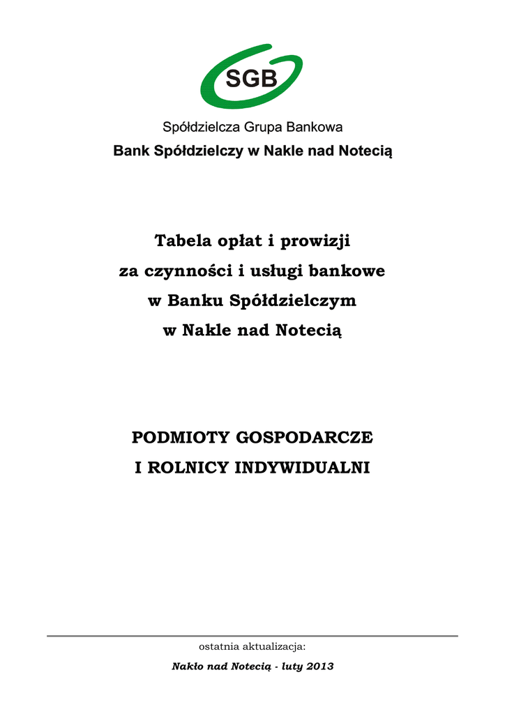 Tabela opłat i prowizji za czynności i usługi bankowe w Banku Spółdzielczym w Nakle nad Notecią PODMIOTY GOSPODARCZE I ROLNICY INDYWIDUALNI ostatnia aktualizacja: Nakło nad Notecią - luty 2013 Uwagi wstępne 1. Użyte w taryfie prowizji i opłat określenia: Bank, Oddział, Filia, Punkt Kasowy oznaczają jednostki organizacyjne Banku Spółdzielczego w Nakle nad Notecią wykonujące obsługę klienta. 2. Prowizje od wpłat na rachunki bankowe pobiera się od wpłacającego, chyba że umowa z posiadaczem rachunku stanowi inaczej. 3. Zarząd Banku dopuszcza możliwość negocjowania z klientem indywidualnych stawek prowizji i opłat. 4. Prowizje i opłaty od dokonywanych transakcji gotówkowych i bezgotówkowych pobierane są w momencie wykonania transakcji. 5. Prowizja za prowadzenie rachunków pobierana jest za dany miesiąc do ostatniego dnia miesiąca bankową notą memoriałową z rachunku klienta. 6. Prowizję i opłaty za wynajem skrytek, przechowywanie depozytów, wynajem portfeli i kluczy do wrzutni pobiera się do 10 za dany miesiąc. 7. Wysokość prowizji i opłat od operacji gotówkowych jak i bezgotówkowych pobrana jest z rachunku bankową notą memoriałową. Prowizja i opłaty od operacji gotówkowych mogą być pobierane gotówką w czasie dokonywania wpłaty z jednoczesnym odnotowaniem wysokości na dokumencie. 8. Pozostałe prowizje i opłaty w zależności od rodzaju pobierane są gotówkowo względnie bezgotówkowo. 2 Rozdział I. Czynności i usługi bankowe dotyczące rachunków i przeprowadzania rozliczeń – waluta krajowa Stawka obowiązująca (opłata w zł lub % kwoty) Rodzaj czynności bankowej tradycyjnie (w kasie Banku) za pomocą w ramach karty Internet własnej 1 Bankingu 20,00 zł w ramach Home Bankingu 1. Otwarcie rachunku bieżącego 2. Otwarcie rachunku pomocniczego 3. Prowadzenie rachunku bieżącego 16,00 zł --- 12,00 zł 15,00 zł 4. Prowadzenie rachunku pomocniczego 10,00 zł --- 8,00 zł 10,00 zł 5. Prowadzenie rachunku bieżącego instytucji niekomercyjnych działających na rzecz gospodarstw domowych – bez względu na rodzaj kanału dostępu do rachunku Dyspozycje bezgotówkowe (przelewy) na rachunki bankowe (opłata od każdej dyspozycji): 6. prowadzone w Banku Spółdzielczym • prowadzone w innych bankach • • 7. 8. 9. 10. 11. przelewy realizowane w systemie SORBNET: a) powyżej 999.999,99 zł b) poniżej 1.000.000,00 zł ( nie pobiera się opłaty standardowej za przelew) Dokonanie automatycznych przelewów z rachunków bankowych w terminie wskazanym przez Klienta – zlecenia stałe (opłata od każdej dyspozycji): Dyspozycje bezgotówkowe (przelewy) na rachunki bankowe realizowane z wpływów bieżących (opłata od każdej dyspozycji, pobierana niezależna od opłat wymienionych w pkt.6): Modyfikacja kwoty/terminu zlecenia stałego Odwołanie zlecenia stałego Wpłaty gotówkowe • na rachunki w Banku Spółdzielczym • na rachunki w innych bankach • na rachunek SGB 24 • na rzecz Urzędów Skarbowych • • na działalność pożytku publicznego wpłaty czynszów do wspólnot mieszkaniowych oraz prywatnych właścicieli kamienic posiadających rachunki w Banku Spółdzielczym 12. Wypłaty gotówkowe 13. Wypłaty gotówkowe z bieżących wpływów (opłata pobierana niezależnie od opłaty wymienionej w pkt. 12) 14. Prowadzenie rachunków lokat terminowych 15,00 zł 10,00 zł bez opłat bez opłat bez opłat bez opłat 3,50 zł 1,00 zł 1,00 zł 2,00 zł 10,00 zł 30,00 zł --- 10,00 zł 30,00 zł 10,00 zł 30,00 zł 2,00 zł --- 1,00 zł --- bez opłat bez opłat bez opłat ----- 1,00 zł 2,00 zł ----- bez opłat --- --- --- --- --- --- --- --- --- --- --- --- --- --- --- --- --- 0,1% --- --- bez opłat --- --- --- bez opłat --- 0,1% (nie mniej niż 2,00 zł, nie więcej niż 80,00 zł) 2,00 zł 2,00 zł 0,10 % (nie mniej niż 1,50 zł, nie więcej niż 100,00 zł) 0,5% nie mniej niż 3,50 zł nie więcej niż 150,00 zł bez opłat zg. z zawartymi umowami (w przypadku braku umów – 0,5%, nie mniej niż 3,50 zł, nie więcej niż 150,00 zł) bez opłat 1,50 zł 0,4% (nie mniej niż 3,50 zł, nie więcej niż 150,00 zł) 0,1% (nie mniej niż 2,00 zł, nie więcej niż 80,00 zł) bez opłat 1 usługa dostępna w całodobowej strefie samoobsługowej : Nakło nad Notecią, ul. Sądowa 10,Nakło nad Notecią, ul. Rynek 11,Sadki, ul. Powstańców Wlkp. 1,Bydgoszcz, ul. Abrahama 8,Bydgoszcz, ul. Śniadeckich 18, Potulice, ul. Bydgoska 13/41 . 3 15. Wpłaty i wypłaty z rachunków lokat terminowych bez opłat --- 16. Udostępnienie usługi Home Banking (miesięcznie) 17. Ustanowienie/zmiana pełnomocnictwa do dysponowania rachunkiem bankowym – opłata od każdego pełnomocnika --- --- 100,00 zł 10,00 zł 18. Polecenie zapłaty: • złożenie zlecenia wykonania polecenia zapłaty przez wierzyciela 2,00 zł • realizacja polecenia zapłaty z rachunku dłużnika 2,00 zł odwołanie polecenia zapłaty (za złożenie jednego odwołania) lub aktualizacja upoważnienia polecenia zapłaty • odmowa wykonania polecenia zapłaty z tytułu braku środków na rachunku dłużnika 19. Potwierdzenie czeku gotówkowego i rozrachunkowego 15,00 zł 20. Wydanie książeczki czekowej 10,00 zł • 2,00 zł 5,00 zł 21. Zgłoszenie oraz odwołanie zastrzeżenia o utracie czeków i blankietów czekowych 22. Sporządzenie odpisu obrotów na jednym rachunku z bieżącego roku kalendarzowego na wniosek Klienta – za każdy poprzedni rok stawka o 50% wyższa 23. Wydanie na wniosek Klienta zaświadczenia stwierdzającego posiadanie rachunku oraz wysokości salda 24. Wydanie opinii o Kliencie na jego wniosek 25. Sporządzenie i przekazanie pocztą wyciągu bankowego 26. Sporządzenie odpisu (opłata za każdy odpis): • wyciągu bankowego (bez załączników) • każdego załącznika do wyciągu • dokumentu pozostającego w archiwum Banku w przypadku, gdy Klient określi datę dokonania operacji • dokumentu pozostającego w archiwum B