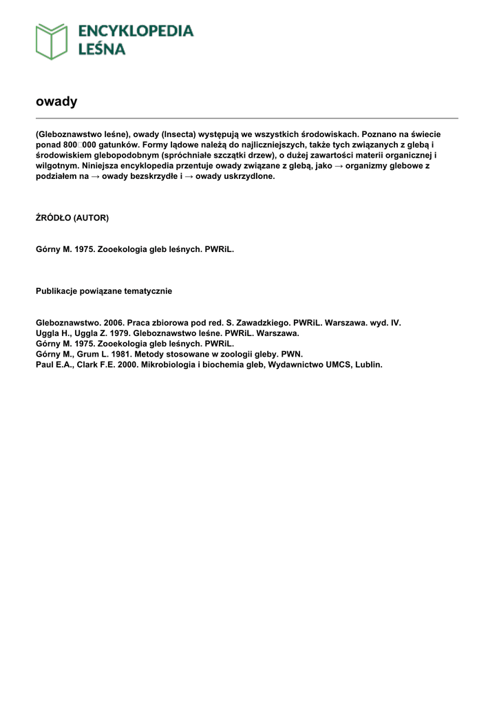 owady (Gleboznawstwo leśne), owady (Insecta) występują we wszystkich środowiskach. Poznano na świecie ponad 800 000 gatunków. Formy lądowe należą do najliczniejszych, także tych związanych z glebą i środowiskiem glebopodobnym (spróchniałe szczątki drzew), o dużej zawartości materii organicznej i wilgotnym. Niniejsza encyklopedia przentuje owady związane z glebą, jako → organizmy glebowe z podziałem na → owady bezskrzydłe i → owady uskrzydlone. ŹRÓDŁO (AUTOR) Górny M. 1975. Zooekologia gleb leśnych. PWRiL. Publikacje powiązane tematycznie Gleboznawstwo. 2006. Praca zbiorowa pod red. S. Zawadzkiego. PWRiL. Warszawa. wyd. IV. Uggla H., Uggla Z. 1979. Gleboznawstwo leśne. PWRiL. Warszawa. Górny M. 1975. Zooekologia gleb leśnych. PWRiL. Górny M., Grum L. 1981. Metody stosowane w zoologii gleby. PWN. Paul E.A., Clark F.E. 2000. Mikrobiologia i biochemia gleb, Wydawnictwo UMCS, Lublin.