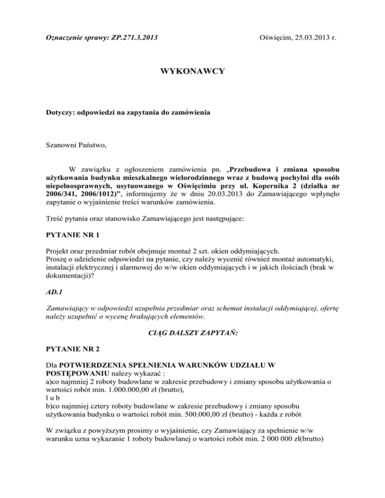 Oznaczenie sprawy: ZP.271.3.2013 Oświęcim, 25.03.2013 r. WYKONAWCY Dotyczy: odpowiedzi na zapytania do zamówienia Szanowni Państwo, W zawiązku z ogłoszeniem zamówienia pn. „Przebudowa i zmiana sposobu użytkowania budynku mieszkalnego wielorodzinnego wraz z budową pochylni dla osób niepełnosprawnych, usytuowanego w Oświęcimiu przy ul. Kopernika 2 (działka nr 2006/341, 2006/1012)”, informujemy że w dniu 20.03.2013 do Zamawiającego wpłynęło zapytanie o wyjaśnienie treści warunków zamówienia. Treść pytania oraz stanowisko Zamawiającego jest następujące: PYTANIE NR 1 Projekt oraz przedmiar robót obejmuje montaż 2 szt. okien oddymiających. Proszę o udzielenie odpowiedzi na pytanie, czy należy wycenić również montaż automatyki, instalacji elektrycznej i alarmowej do w/w okien oddymiających i w jakich ilościach (brak w dokumentacji)? AD.1 Zamawiający w odpowiedzi uzupełnia przedmiar oraz schemat instalacji oddymiającej, ofertę należy uzupełnić o wycenę brakujących elementów. CIĄG DALSZY ZAPYTAŃ: PYTANIE NR 2 Dla POTWIERDZENIA SPEŁNIENIA WARUNKÓW UDZIAŁU W POSTĘPOWANIU nalezy wykazać : a)co najmniej 2 roboty budowlane w zakresie przebudowy i zmiany sposobu użytkowania o wartości robót min. 1.000.000,00 zł (brutto), lub b)co najmniej cztery roboty budowlane w zakresie przebudowy i zmiany sposobu użytkowania budynku o wartości robót min. 500.000,00 zł (brutto) - każda z robót W związku z powyższym prosimy o wyjaśnienie, czy Zamawiający za spełnienie w/w warunku uzna wykazanie 1 roboty budowlanej o wartości robót min. 2 000 000 zł(brutto) AD.2 Zamawiający nie uzna w takim przypadku spełnienia warunku. PYTANIE NR 3 Przedmiar robót branży budowlanej w pozycjach 7.12-7.16 obejmuje montaż skrzydeł drzwiowych - zgodnie z podaną podstawą wyceny KNR-W 2-02 tabl.1022 uwzględniono tylko zawieszenie i regulację skrzydeł drzwiowych. Proszę o wyjaśnienie: 1/ czy należy doliczyć montaż ościeżnic drzwiowych i jakiego typu stalowe czy drewniane ( dotyczy skrzydeł drzwiowych ujętych w pozycjach 7.12-7.14)? 2/ jakie wymogi mają spełniać drzwi wewnątrzlokalowe wejściowe do mieszkań (płytowe płaskie czy tłoczone, okleinowane, ilość zamków, wizjer, z progiem)? 3/ w poz. 7.15-7.16 dot. skrzydeł drzwiowych stalowych w tym p.poż. czy należy zmienić podstawę wyceny zmieniając montaż skrzydeł na montaż drzwi (gdyż tego typu drzwi są w komplecie z ościeżnicą)? AD.3 1. W opisie robót powołano się na SST a nie pozycje KNR. Zgodnie z SST należy uwzględnić dostawę i montaż ościeżnic i skrzydeł. 2. Drzwi do mieszkań uzupełniam, że opisane w opisie projektu wykonawczego drzwi wejściowe płytowe, płaskie, wzmocnione należy wyposażyć w jeden zamek, wizjer i będą one posiadały próg; płytowe, wzmocnione drzwi do pomieszczeń wewnątrzlokalowe laminowane, do pomieszczeń bez okien z wentylacją dolną. Drzwi do komórek lokatorskich ażurowe z listew drewnianych. Projektowane drzwi wejściowe zewnętrzne aluminiowe z przekładką termiczną. 3. Drzwi do piwnicy i do zsypów o odporności ogniowej EI30 z samozamykaczami. Dodatkowo informujemy, że w górnej ościeżnicy wszystkich okien należy zamontować wentylacje nawiewną /nawiewniki/. Parapety wewnętrzne we wszystkich oknach nowe, laminowane o szer.30cm. PYTANIE NR 4 1.Czy wodomierze f-my "FRANCO", wykazane w przedmiarze robót mają być przeznaczone do zdalnego odczytu? Jeśli tak, to brak w przedmiarze i opisie robót zaworów zwrotnych do nich, wymagane do montażu tych wodomierzy przez producenta. 2.Grzejniki "COSMO" mają być dolnozasilane wg opisu, to wówczas do nich są potrzebne zawory odcinające, których brak w przedmiarze robót. Czy w kosztorysie ofertowym przyjmować je, czy zrobić wycenę tak jak brzmi przedmiar robót? AD.4 1. W projekcie nie przyjęto wodomierzy ze zdalnym odczytem. 2. Każdy grzejnik będzie podłączony za pomocą armatury przyłączeniowej. Proszę o uzupełnienie przedmiaru o 56 szt. i o armaturę przyłączeniową. PYTANIE NR 5 Prosimy o sprawdzenie zgodności projektu wentylacji z „Rozporządzeniem Ministra Infrastruktury z dnia 12 kwietnia 2002 r. w sprawie warunków technicznych jakim powinny odpowiadać budynki i ich usytuowanie (Dz. U. Nr 75 poz. 690)” 1. Wentylacja górnej oraz dolnej komory zsypu - §130.3, §148.2 2. Wentylacja piwnic oraz pomieszczeń gospodarczych - §148.2, §150.3, §150.5 (Jest połączona wentylacja mechaniczna z grawitacyjną, połączone ze sobą toalety i kuchnie z pomieszczeniami gospodarczymi, piwnicami lokatorskimi i dolną komorą zsypu). Pytanie 3 W projekcie jest połączona wentylacja mechaniczna z grawitacyjną, połączone ze sobą toalety i kuchnie z pomieszczeniami gospodarczymi, piwnicami lokatorskimi i dolną komorą zsypu Prosimy o określenie w jaki sposób mają działać poszczególne układy wentylacyjne (np. praca ciągła, załączanie czasowe). AD.5 AD 5.1 Wentylacja dolnej komory zsypu została zaprojektowana zgodnie z §130.3. Natomiast nazwane w projekcie pomieszczenie „górna komora zsypu” nie pełni takiej roli, jest to pomieszczenie magazynowe, pod stropem którego kończy się rura zsypowa i zsyp. Przez ww pomieszczenie przeprowadzony jest tylko kanał wentylacyjny rury zsypowej zakończony wentylatorem dachowym wywiewnym nad dachem. Pomieszczenie nazwane „górną komorą zsypu” nie ma żadnego kontaktu z zsypem. Ad.5.2 Aby sposób wentylowania projektowanych pomieszczeń w budynku był zgodny z wymaganiami Rozporządzenia Ministra Infrastruktury z dnia 12 kwietnia 2002 r. w sprawie warunków technicznych jakim powinny odpowiadać budynki i ich usytuowanie (Dz. U. Nr 75 poz. 690) - §148.2, §150.3, §150.5 skorygowano projekt wentylacji poprzez przystosowanie szybów instalacyjnych do funkcji wyrzutni powietrza wentylacyjnego. Natomiast pomieszczenia wentylowane w sposób naturalny wyposażono w kanały wentylacyjne z 