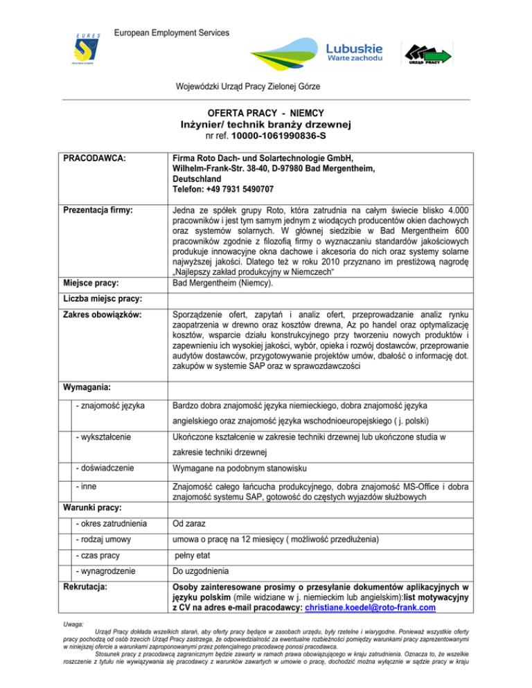 European Employment Services Wojewódzki Urząd Pracy Zielonej Górze OFERTA PRACY - NIEMCY InŜynier/ technik branŜy drzewnej nr ref. 10000-1061990836-S PRACODAWCA: Firma Roto Dach- und Solartechnologie GmbH, Wilhelm-Frank-Str. 38-40, D-97980 Bad Mergentheim, Deutschland Telefon: +49 7931 5490707 Prezentacja firmy: Jedna ze spółek grupy Roto, która zatrudnia na całym świecie blisko 4.000 pracowników i jest tym samym jednym z wiodących producentów okien dachowych oraz systemów solarnych. W głównej siedzibie w Bad Mergentheim 600 pracowników zgodnie z filozofią firmy o wyznaczaniu standardów jakościowych produkuje innowacyjne okna dachowe i akcesoria do nich oraz systemy solarne najwyŜszej jakości. Dlatego teŜ w roku 2010 przyznano im prestiŜową nagrodę „Najlepszy zakład produkcyjny w Niemczech“ Bad Mergentheim (Niemcy). Miejsce pracy: Liczba miejsc pracy: Zakres obowiązków: Sporządzenie ofert, zapytań i analiz ofert, przeprowadzanie analiz rynku zaopatrzenia w drewno oraz kosztów drewna, Az po handel oraz optymalizację kosztów, wsparcie działu konstrukcyjnego przy tworzeniu nowych produktów i zapewnieniu ich wysokiej jakości, wybór, opieka i rozwój dostawców, przeprowanie audytów dostawców, przygotowywanie projektów umów, dbałość o informację dot. zakupów w systemie SAP oraz w sprawozdawczości Wymagania: - znajomość języka Bardzo dobra znajomość języka niemieckiego, dobra znajomość języka angielskiego oraz znajomość języka wschodnioeuropejskiego ( j. polski) - wykształcenie Ukończone kształcenie w zakresie techniki drzewnej lub ukończone studia w zakresie techniki drzewnej - doświadczenie Wymagane na podobnym stanowisku - inne Znajomość całego łańcucha produkcyjnego, dobra znajomość MS-Office i dobra znajomość systemu SAP, gotowość do częstych wyjazdów słuŜbowych Warunki pracy: - okres zatrudnienia Od zaraz - rodzaj umowy umowa o pracę na 12 miesięcy ( moŜliwość przedłuŜenia) - czas pracy pełny etat - wynagrodzenie Do uzgodnienia Rekrutacja: Osoby zainteresowane prosimy o przesyłanie dokumentów aplikacyjnych w języku polskim (mile widziane w j. niemieckim lub angielskim):list motywacyjny z CV na adres e-mail pracodawcy: [email protected] Uwaga: Urząd Pracy dokłada wszelkich starań, aby oferty pracy będące w zasobach urzędu, były rzetelne i wiarygodne. PoniewaŜ wszystkie oferty pracy pochodzą od osób trzecich Urząd Pracy zastrzega, Ŝe odpowiedzialność za ewentualne rozbieŜności pomiędzy warunkami pracy zaprezentowanymi w niniejszej ofercie a warunkami zaproponowanymi przez potencjalnego pracodawcę ponosi pracodawca. Stosunek pracy z pracodawcą zagranicznym będzie zawarty w ramach prawa obowiązującego w kraju zatrudnienia. Oznacza to, Ŝe wszelkie roszczenie z tytułu nie wywiązywania się pracodawcy z warunków zawartych w umowie o pracę, dochodzić moŜna wyłącznie w sądzie pracy w kraju zatrudnienia. W sytuacjach losowych pomoc polskich placówek konsularnych ogranicza się do ewentualnego udzielenia doraźnej pomocy (n. kredytu na zakup biletu powrotnego do Polski ). Na podstawie ustawy o ochronie danych osobowych z dnia 29 sierpnia 1997 r. (Dz. U. z 2002 r. Nr 101, poz. 926 ze zm.) informujemy, Ŝe administratorem danych osobowych wskazanych w dokumentach przekazanych w odpowiedzi na ofertę pracy jest pracodawca niemiecki oraz Wojewódzki Urząd Pracy w Zielonej Górze, ul. Wyspiańskiego 15, 65-036 Zielona Góra. Dane osobowe wskazane dobrowolnie w ww. dokumentach będą przetwarzane i udostępniane publicznym słuŜbom zatrudnienia, pracodawcom lub podmiotom reprezentującym pracodawców do celów związanych z pośrednictwem pracy w ramach sieci EURES, na podstawie ustawy z dnia 20 kwietnia 2004 r. o promocji zatrudnienia i instytucjach rynku pracy (Dz. U. z 2008 r. Nr 69, poz. 415 ze zm.) przez okres konieczny do osiągnięcia celu określonego w przedmiotowej ustawie. Osobie, której dane osobowe dotyczą przysługuje prawo dostępu do ich treści i prawo ich poprawiania. OFERTA WAśNA DO ODWOŁANIA Więcej ofert pracy za granicą: www.eures.europa.eu www.wup.zgora.pl