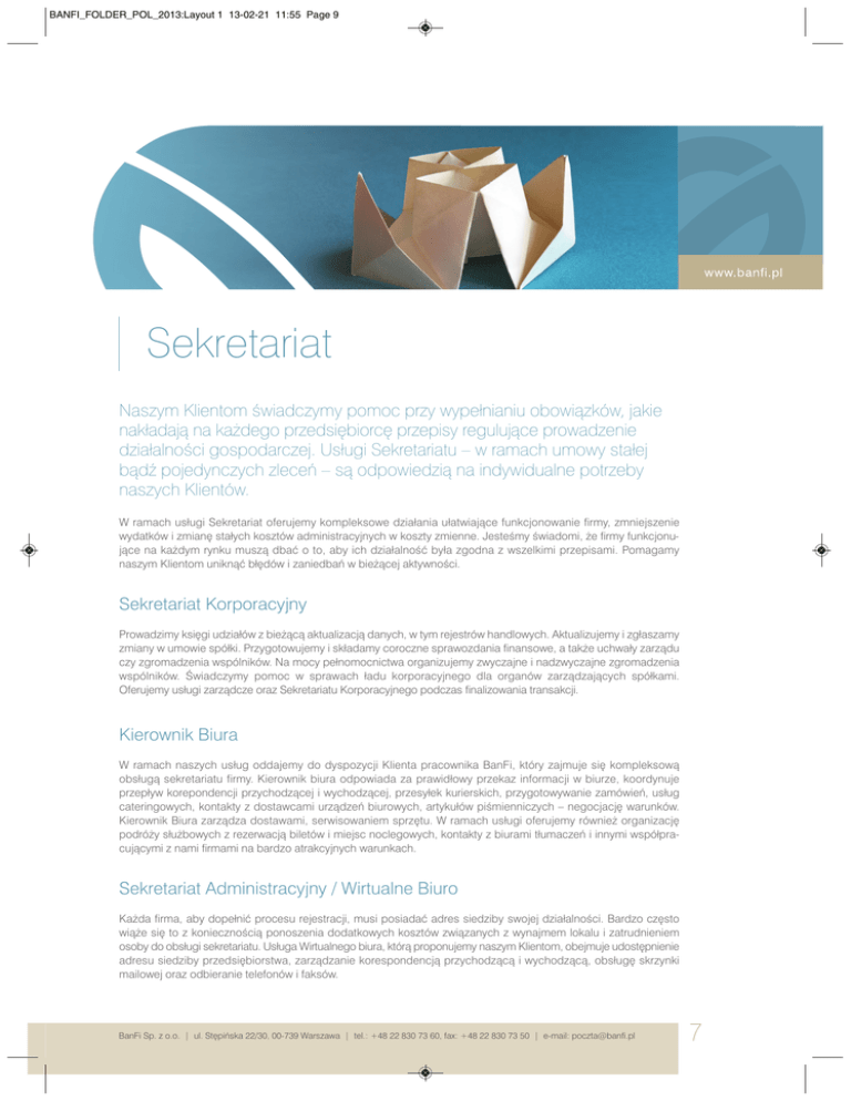 BANFI_FOLDER_POL_2013:Layout 1 13-02-21 11:55 Page 9 Sekretariat Naszym Klientom Êwiadczymy pomoc przy wypełnianiu obowiàzków, jakie nakładajà na ka˝dego przedsi´biorc´ przepisy regulujàce prowadzenie działalnoÊci gospodarczej. Usługi Sekretariatu – w ramach umowy stałej bàdê pojedynczych zleceƒ – sà odpowiedzià na indywidualne potrzeby naszych Klientów. W ramach usługi Sekretariat oferujemy kompleksowe działania ułatwiajàce funkcjonowanie firmy, zmniejszenie wydatków i zmian´ stałych kosztów administracyjnych w koszty zmienne. JesteÊmy Êwiadomi, ˝e firmy funkcjonujàce na ka˝dym rynku muszà dbaç o to, aby ich działalnoÊç była zgodna z wszelkimi przepisami. Pomagamy naszym Klientom uniknàç bł´dów i zaniedbaƒ w bie˝àcej aktywnoÊci. Sekretariat Korporacyjny Prowadzimy ksi´gi udziałów z bie˝àcà aktualizacjà danych, w tym rejestrów handlowych. Aktualizujemy i zgłaszamy zmiany w umowie spółki. Przygotowujemy i składamy coroczne sprawozdania finansowe, a tak˝e uchwały zarzàdu czy zgromadzenia wspólników. Na mocy pełnomocnictwa organizujemy zwyczajne i nadzwyczajne zgromadzenia wspólników. Âwiadczymy pomoc w sprawach ładu korporacyjnego dla organów zarzàdzajàcych spółkami. Oferujemy usługi zarzàdcze oraz Sekretariatu Korporacyjnego podczas finalizowania transakcji. Kierownik Biura W ramach naszych usług oddajemy do dyspozycji Klienta pracownika BanFi, który zajmuje si´ kompleksowà obsługà sekretariatu firmy. Kierownik biura odpowiada za prawidłowy przekaz informacji w biurze, koordynuje przepływ korepondencji przychodzàcej i wychodzàcej, przesyłek kurierskich, przygotowywanie zamówieƒ, usług cateringowych, kontakty z dostawcami urzàdzeƒ biurowych, artykułów piÊmienniczych – negocjacj´ warunków. Kierownik Biura zarzàdza dostawami, serwisowaniem sprz´tu. W ramach usługi oferujemy równie˝ organizacj´ podró˝y słu˝bowych z rezerwacjà biletów i miejsc noclegowych, kontakty z biurami tłumaczeƒ i innymi współpracujàcymi z nami firmami na bardzo atrakcyjnych warunkach. Sekretariat Administracyjny / Wirtualne Biuro Ka˝da firma, aby dopełniç procesu rejestracji, musi posiadaç adres siedziby swojej działalnoÊci. Bardzo cz´sto wià˝e si´ to z koniecznoÊcià ponoszenia dodatkowych kosztów zwiàzanych z wynajmem lokalu i zatrudnieniem osoby do obsługi sekretariatu. Usługa Wirtualnego biura, którà proponujemy naszym Klientom, obejmuje udost´pnienie adresu siedziby przedsi´biorstwa, zarzàdzanie korespondencjà przychodzàcà i wychodzàcà, obsług´ skrzynki mailowej oraz odbieranie telefonów i faksów. BanFi Sp. z o.o. | ul. St´piƒska 22/30, 00-739 Warszawa | tel.: +48 22 830 73 60, fax: +48 22 830 73 50 | e-mail: [email protected] 7