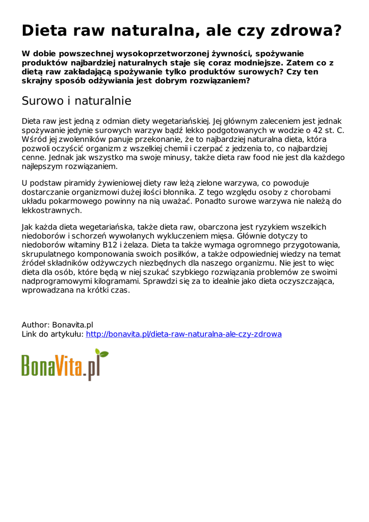 Dieta raw naturalna, ale czy zdrowa? W dobie powszechnej wysokoprzetworzonej żywności, spożywanie produktów najbardziej naturalnych staje się coraz modniejsze. Zatem co z dietą raw zakładającą spożywanie tylko produktów surowych? Czy ten skrajny sposób odżywiania jest dobrym rozwiązaniem? Surowo i naturalnie Dieta raw jest jedną z odmian diety wegetariańskiej. Jej głównym zaleceniem jest jednak spożywanie jedynie surowych warzyw bądź lekko podgotowanych w wodzie o 42 st. C. Wśród jej zwolenników panuje przekonanie, że to najbardziej naturalna dieta, która pozwoli oczyścić organizm z wszelkiej chemii i czerpać z jedzenia to, co najbardziej cenne. Jednak jak wszystko ma swoje minusy, także dieta raw food nie jest dla każdego najlepszym rozwiązaniem. U podstaw piramidy żywieniowej diety raw leżą zielone warzywa, co powoduje dostarczanie organizmowi dużej ilości błonnika. Z tego względu osoby z chorobami układu pokarmowego powinny na nią uważać. Ponadto surowe warzywa nie należą do lekkostrawnych. Jak każda dieta wegetariańska, także dieta raw, obarczona jest ryzykiem wszelkich niedoborów i schorzeń wywołanych wykluczeniem mięsa. Głównie dotyczy to niedoborów witaminy B12 i żelaza. Dieta ta także wymaga ogromnego przygotowania, skrupulatnego komponowania swoich posiłków, a także odpowiedniej wiedzy na temat źródeł składników odżywczych niezbędnych dla naszego organizmu. Nie jest to więc dieta dla osób, które będą w niej szukać szybkiego rozwiązania problemów ze swoimi nadprogramowymi kilogramami. Sprawdzi się za to idealnie jako dieta oczyszczająca, wprowadzana na krótki czas. Author: Bonavita.pl Link do artykułu: http://bonavita.pl/dieta-raw-naturalna-ale-czy-zdrowa