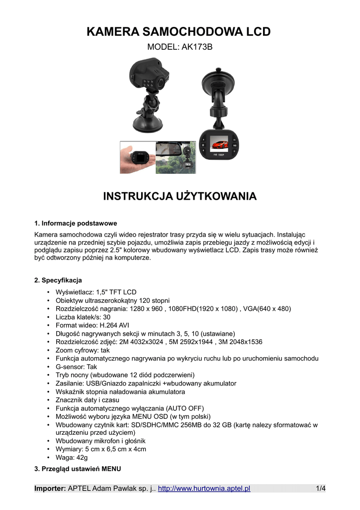 KAMERA SAMOCHODOWA LCD MODEL: AK173B INSTRUKCJA UŻYTKOWANIA 1. Informacje podstawowe Kamera samochodowa czyli wideo rejestrator trasy przyda się w wielu sytuacjach. Instalując urządzenie na przedniej szybie pojazdu, umożliwia zapis przebiegu jazdy z możliwością edycji i podglądu zapisu poprzez 2.5" kolorowy wbudowany wyświetlacz LCD. Zapis trasy może również być odtworzony później na komputerze. 2. Specyfikacja Wyświetlacz: 1,5" TFT LCD Obiektyw ultraszerokokątny 120 stopni Rozdzielczość nagrania: 1280 x 960 , 1080FHD(1920 x 1080) , VGA(640 x 480) Liczba klatek/s: 30 Format wideo: H.264 AVI Długość nagrywanych sekcji w minutach 3, 5, 10 (ustawiane) Rozdzielczość zdjęć: 2M 4032x3024 , 5M 2592x1944 , 3M 2048x1536 Zoom cyfrowy: tak Funkcja automatycznego nagrywania po wykryciu ruchu lub po uruchomieniu samochodu G-sensor: Tak Tryb nocny (wbudowane 12 diód podczerwieni) Zasilanie: USB/Gniazdo zapalniczki +wbudowany akumulator Wskaźnik stopnia naładowania akumulatora Znacznik daty i czasu Funkcja automatycznego wyłączania (AUTO OFF) Możliwość wyboru języka MENU OSD (w tym polski) Wbudowany czytnik kart: SD/SDHC/MMC 256MB do 32 GB (kartę nalezy sformatować w urządzeniu przed użyciem) • Wbudowany mikrofon i głośnik • Wymiary: 5 cm x 6,5 cm x 4cm • Waga: 42g • • • • • • • • • • • • • • • • • 3. Przegląd ustawień MENU Importer: APTEL Adam Pawlak sp. j.. http://www.hurtownia.aptel.pl 1/4 Aby wejść do MENU należy włączyć urządzenie, wybrać odpowiedni tryb pracy urządzenia przyciskiem MODE, a następnie nacisnąć przycisk MENU. Wybór odpowiednich opcji odbywa się poprzez naciskanie przycisków Up/Down, a zatwierdzanie przez naciśnięcie przycisku ok W każdym trybie mamy dostęp do następujących funkcji: Setup • Data/godzina: wprowadzanie aktualnej daty i czasu • Auto Off – czas po którym kamerka automatycznie się wyłączy (nie dotyczy gdy kamerka nagrywa film) • Dźwięk przycisków • Language – język MENU • TV Output – wybór systemu TV (PAL/NTFS) • Light Freq. - częstotliwość odświeżania • Ustawienie lampy IR (tryb nocny) • Obracanie obrazu • Jasność LCD • Czułość G-sensora • Nr tablicy rej samochodu • Format – formatowanie karty pamięci (wszystkie zapisane dane zostaną bezpowrotnie utracone) • Default – przywrócenie wartości domyślnych • Wersja oprogramowania W trybie kamerki mamy dostęp do następujących funkcji: Video Output • Rozdzielczość nagrywania • Video time – długość pojedyńczego filmu • EV – korekta ekspozycji • Motion detect – jeśli włączone to kamerka automatycznie będzie rozpoczynać nagrywanie po wykryciu jakiegokolwiek ruchu przed obiektywem • Nagrywanie dźwięku • Time Stamp – Wybór czy w nagranych filmach ma być widoczna data i czas ich nakręcenia W trybie aparatu mamy dostęp do następujących funkcji: Capture • Timer – czas samowyzwalacza • Size – rozdzielczość zdjęć (im wyższa tym lepsza jakość) • Quality – jakość zdjęć (Fine – najlepsza; Standard – zwykła; Economy – słaba). Im wyższa jakość tym pliki ze zdjęciami będą więcej zajmować miejsca na karcie pamięci • Sekwencja– tryb seryjny robienia zdjęć • Ostrość • White balance: balans bieli (auto/słonecznie/pochmurno/światło zwykłej żarówki/światło świetlówki) • Kolor – wybór kolorów zdjęcia • ISO – czułość ISO • EV – korekta ekspozycji • Stabilizacja antywstrząsowa • Czas szybkiego podglądu po wykaniu zdjęcia • Time Stamp – dołączenie do zdjęcia daty i godziny W trybie przeglądarki mamy dostęp do następujących funkcji: Play • Delete – kasowanie zdjęć/filmów (pojedyńcze/wszystkie/wybrane) • Protect – zabezpieczanie zdjęć/filmów przed przypadkowych skasowaniem Importer: APTEL Adam Pawlak sp. j.. http://www.hurtownia.aptel.pl 2/4 • • Thumbnail – wyświetlanie miniaturek Volume – ustawianie poziomu głośności podczas odtwarzania filmów 4. Zasilanie urządzenia Urządzenie jest zasilane za pomocą dołączonego adaptera z instalacji samochodowej (gniazdo zapalniczki). Wbudowany akumulator służy jedynie do podtrzymania napięcia na czas potrzebny do zapisania pliku wideo po zaniku napięcia w gnieździe zapalniczki. 5. Nagrywanie wideo Podłączyć kamerkę do zasilaniaa, rejestrator automatycznie przejdzie w tryb nagrywania (wyświetli się czerwony timer na ekranie LCD). Aby zatrzymać nagrywane należy wcisnąć przycisk OK Wyłączenie nagrywania sygnalizowane zniknięciem czerwonego timera i ciągłym świeceniem niebieskiej diody LED. Ponowne wciśnięcie przycisku OK spowoduje rozpoczęcie nagrywania. Nagranie będzie automatycznie dzielone na części x-minutowe(patrz ustawienia MENU) i zapisywane na karcie pamięci. Po zapełnieniu całej karty rejestrator automatycznie będzie nadpisywał najstarsze nagrania. Nagrywanie będzie się automatycznie kończyło po odcięciu kamerki od zasilania, Aby uruchamiać nagrywanie automatycznie po wykryciu ruchu należy włączyć funkcję Motion Detect (patrz ustawienia MENU). Nagranie będzie automatycznie kończone po dłuższym nie wykryciu ruchu przed obiektywem kamery. Podczas nagrywania możliwe jest korzystanie z cyfrowego zoomu. Aby przybliżyć obraz należy nacisnąć przycisk DOWN, aby oddalić przycisk UP. 6. Robienie zdjęć Za pomocą przycisku ON/OFF włączyć urządzenie. Rejestrator automatycznie przejdzie w tryb nagrywania (wyświetli się czerwony timer na ekranie LCD). Aby zatrzymać nagrywane należy wcisnąć przycisk OK. Wyłączenie nagrywania sygnalizowane zniknięciem czerwonego timera i ciągłym świeceniem niebieskiej diody LED. Nacisnąć przycisk MODE aby wejść do trybu aparatu. Aby zrobić zdjęcie należy nacisnąć przycisk OK – zdjęcie automatycznie zostanie zapisane na karcie pamięci urządzenia. W trakcie kadrowania można korz