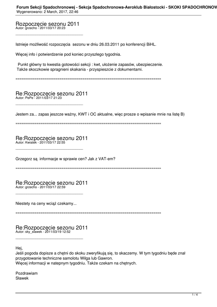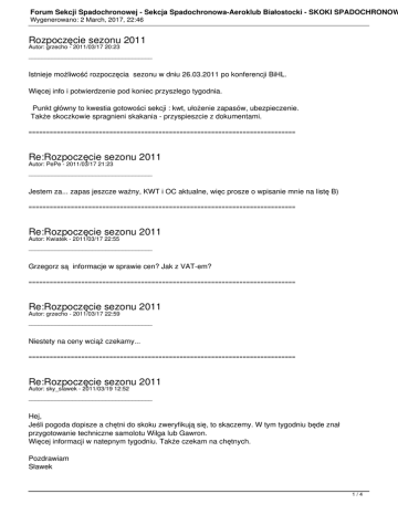 Forum Sekcji Spadochronowej - Sekcja Spadochronowa-Aeroklub Białostocki - SKOKI SPADOCHRONOW Wygenerowano: 2 March, 2017, 22:46 Rozpoczęcie sezonu 2011 Autor: grzecho - 2011/03/17 20:23 _____________________________________ Istnieje możliwość rozpoczęcia sezonu w dniu 26.03.2011 po konferencji BiHL. Więcej info i potwierdzenie pod koniec przyszłego tygodnia. Punkt główny to kwestia gotowości sekcji : kwt, ułożenie zapasów, ubezpieczenie. Także skoczkowie spragnieni skakania - przyspieszcie z dokumentami. ============================================================================ Re:Rozpoczęcie sezonu 2011 Autor: PePe - 2011/03/17 21:23 _____________________________________ Jestem za... zapas jeszcze ważny, KWT i OC aktualne, więc prosze o wpisanie mnie na listę B) ============================================================================ Re:Rozpoczęcie sezonu 2011 Autor: Kwiatek - 2011/03/17 22:55 _____________________________________ Grzegorz są informacje w sprawie cen? Jak z VAT-em? ============================================================================ Re:Rozpoczęcie sezonu 2011 Autor: grzecho - 2011/03/17 22:59 _____________________________________ Niestety na ceny wciąż czekamy... ============================================================================ Re:Rozpoczęcie sezonu 2011 Autor: sky_slawek - 2011/03/19 12:52 _____________________________________ Hej, Jeśli pogoda dopisze a chętni do skoku zweryfikują się, to skaczemy. W tym tygodniu będe znał przygotowanie techniczne samolotu Wilga lub Gawron. Więcej informacji w natepnym tygodniu. Także czekam na chętnych. Pozdrawiam Sławek 1/4 Forum Sekcji Spadochronowej - Sekcja Spadochronowa-Aeroklub Białostocki - SKOKI SPADOCHRONOW Wygenerowano: 2 March, 2017, 22:46 ============================================================================ Re:Rozpoczęcie sezonu 2011 Autor: czarek - 2011/03/21 18:47 _____________________________________ Ja w sobotę pracuję do 14, ale po pracy, jak się nie załapię na BiHL, to chętnie skoczę raz lub dwa :-) ============================================================================ Re:Rozpoczęcie sezonu 2011 Autor: sky_slawek - 2011/03/23 21:10 _____________________________________ Cześć, Informuję, że planowane skoki na tą sobotę NIE ODBĘDĄ SIĘ , ponieważ aeroklub przechodzi do piątku audyt techniczny. Najbliższe planowane skoki w następny weekend tj. 2-3 kwietnia. Także, jeśli są chętni proszę o kontakt oraz uzupełnianie dokumentacji. Pozdrawiam Sławek ============================================================================ Re:Rozpoczęcie sezonu 2011 Autor: PePe - 2011/03/31 21:44 _____________________________________ Hej! I jak działamy coś (próbujemy) w ten weekend? ============================================================================ Re:Rozpoczęcie sezonu 2011 Autor: Kwiatek - 2011/04/04 12:58 _____________________________________ Sławek będziesz gotowy na rozpoczęcie sezonu 15-16 kwietnia? ============================================================================ Re:Rozpoczęcie sezonu 2011 Autor: PePe - 2011/04/12 22:50 _____________________________________ 2/4 Forum Sekcji Spadochronowej - Sekcja Spadochronowa-Aeroklub Białostocki - SKOKI SPADOCHRONOW Wygenerowano: 2 March, 2017, 22:46 j.w. Czy jest szansa w ten weekend na skoki w AB? Dzięki za info, pozdr. ============================================================================ Re:Rozpoczęcie sezonu 2011 Autor: CezarSky - 2011/04/13 07:52 _____________________________________ Ja i kilku innych z Białegostoku już zaczęliśmy :P więcej relacji niedługo na (patrz na moją stopkę pod spodem) lub http://pl-pl.facebook.com/#!/home.php?sk=group_172409456140023&ap=1 ha ... ============================================================================ Re:Rozpoczęcie sezonu 2011 Autor: grzecho - 2011/04/13 23:02 _____________________________________ ... ============================================================================ Re:Rozpoczęcie sezonu 2011 Autor: PePe - 2011/04/14 21:33 _____________________________________ Nieźle... niektórzy już latają i to nad francuską ziemią, a człowiek jest na tyle zdesperowany, że już nawet track-a ćwiczy w basenie ;) Cieszę się Waszym szczęściem... poważnie! :angry: Pozdrawiam! ============================================================================ Re:Rozpoczęcie sezonu 2011 Autor: CezarSky - 2011/04/15 08:12 _____________________________________ Dzięki stary. Szkoda, że nie mogłeś pojechać :/ było extra a wino Chateu Maylande też :) (niedostępne w Auchan). Lecz nie przejmuj się ... W końcu sezonu (grudzień 2011) planujemy wstępnie wyskoczyć tam w kameralnej ekipie na tunel (będzie już po testach) i na skoki (o ile nie zasypie tam ich śnieg :) ) Planuj więc czas i wolne. Jest chata z basenem na "morsowanie" jest lotnisko (nawet 160 km do Ampuria Brava), jest na miejscu tunel, są plaże, Góry Pireneje (narty) i pomniejsze są zamki i wiele 3/4 Forum Sekcji Spadochronowej - Sekcja Spadochronowa-Aeroklub Białostocki - SKOKI SPADOCHRONOW Wygenerowano: 2 March, 2017, 22:46 innych atrakcji. A na wypadek niepogody zawsze możemy zorganizować się w małą wyprawę krzyżową ... A to kolorowe muszelki na dowód tego :) ============================================================================ Re:Rozpoczęcie sezonu 2011 Autor: CezarSky - 2011/04/15 09:26 _____________________________________ No w tej chwili nie mogę zmniejszyć formatu fotki z muszelkami ale są do obejrzenia tu http://www.facebook.com/album.php?id=1683105049&aid=65153#!/photo.php?fbid=1587731068186&se t=a.1586215710303.65153.1683105049&type=1&theater ============================================================================ Re:Rozpoczęcie sezonu 2011 Autor: PePe - 2011/04/18 20:27 _____________________________________ Ok, ja też mam już pierwsze wietrzenie kupra za sobą B) Skromnie i spokojnie,