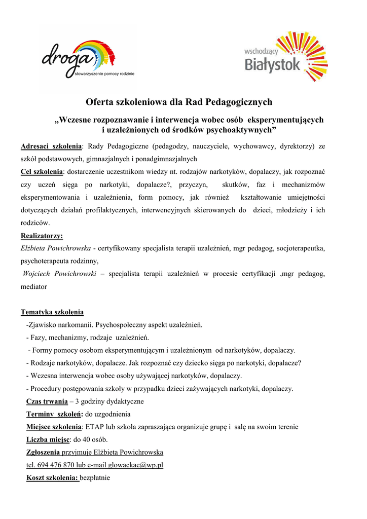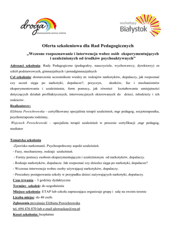 Oferta szkoleniowa dla Rad Pedagogicznych „Wczesne rozpoznawanie i interwencja wobec osób eksperymentujących i uzależnionych od środków psychoaktywnych” Adresaci szkolenia: Rady Pedagogiczne (pedagodzy, nauczyciele, wychowawcy, dyrektorzy) ze szkół podstawowych, gimnazjalnych i ponadgimnazjalnych Cel szkolenia: dostarczenie uczestnikom wiedzy nt. rodzajów narkotyków, dopalaczy, jak rozpoznać czy uczeń sięga po narkotyki, dopalacze?, przyczyn, skutków, faz i mechanizmów eksperymentowania i uzależnienia, form pomocy, jak również kształtowanie umiejętności dotyczących działań profilaktycznych, interwencyjnych skierowanych do dzieci, młodzieży i ich rodziców. Realizatorzy: Elżbieta Powichrowska - certyfikowany specjalista terapii uzależnień, mgr pedagog, socjoterapeutka, psychoterapeuta rodzinny, Wojciech Powichrowski – specjalista terapii uzależnień w procesie certyfikacji ,mgr pedagog, mediator Tematyka szkolenia -Zjawisko narkomanii. Psychospołeczny aspekt uzależnień. - Fazy, mechanizmy, rodzaje uzależnień. - Formy pomocy osobom eksperymentującym i uzależnionym od narkotyków, dopalaczy. - Rodzaje narkotyków, dopalacze. Jak rozpoznać czy dziecko sięga po narkotyki, dopalacze? - Wczesna interwencja wobec osoby używającej narkotyków, dopalaczy. - Procedury postępowania szkoły w przypadku dzieci zażywających narkotyki, dopalaczy. Czas trwania – 3 godziny dydaktyczne Terminy szkoleń: do uzgodnienia Miejsce szkolenia: ETAP lub szkoła zapraszająca organizuje grupę i salę na swoim terenie Liczba miejsc: do 40 osób. Zgłoszenia przyjmuje Elżbieta Powichrowska tel. 694 476 870 lub e-mail [email protected] Koszt szkolenia: bezpłatnie Oferta szkoleniowa dla Rad Pedagogicznych „Profilaktyka zachowań ryzykownych w szkole” Adresaci szkolenia: Rady Pedagogiczne (pedagodzy, nauczyciele, wychowawcy, dyrektorzy) ze szkół podstawowych, gimnazjalnych i ponadgimnazjalnych Cel szkolenia: dostarczenie uczestnikom wiedzy nt. przyczyn zachowań ryzykownych, podziału profilaktyki, strategii i standardów działań profilaktycznych, skutecznych programów profilaktycznych oraz umiejętności tworzenia programów profilaktycznych w szkole Realizatorzy: Elżbieta Powichrowska - certyfikowany specjalista terapii uzależnień, pedagog, socjoterapeutka, psychoterapeuta rodzinny, dyrektor ETAP-u Ośrodka Profilaktyki i Terapii dla Młodzieży i Dorosłych Tematyka szkolenia - Przyczyny zachowań ryzykownych dzieci i młodzieży. - Profilaktyka uniwersalna, selektywna, wskazująca. - Strategie profilaktyczne. - Tworzenie programu profilaktycznego. - Standardy działań profilaktycznych. Czas trwania – do uzgodnienia Forma pracy - wykładowo- warsztatowa Terminy szkoleń: do uzgodnienia Miejsce szkolenia: ETAP lub szkoła z terenu miasta Białystok Liczba miejsc: do 40 osób. Zgłoszenia przyjmuje Elżbieta Powichrowska tel. 694 476 870 lub e-mail [email protected] Koszt szkolenia: bezpłatnie Oferta szkoleniowa dla Rad Pedagogicznych „Podstawy komunikacji empatycznej w pracy z uczniem/wychowankiem” Adresaci szkolenia: Rady Pedagogiczne (pedagodzy, nauczyciele, wychowawcy, dyrektorzy) ze szkół podstawowych, gimnazjalnych i ponadgimnazjalnych Cel szkolenia: zapoznanie uczestników szkolenia z metodą Porozumienia bez przemocy wg Marshalla Rosenberga i kształtowanie umiejętności komunikacji empatycznej oraz zastosowanie nabytych umiejętności w praktyce w pracy z uczniem Prowadzący: Andrzej Karolczyk – certyfikowany specjalista terapii uzależnień ,mgr pedagog, mediator Nvc Metody pracy: mini wykład, metody aktywne Czas trwania – 2 godziny dydaktyczne Miejsce szkolenia: szkoła zapraszająca organizuje grupę i salę na swoim terenie Zgłoszenia przyjmuje Andrzej Karolczyk pod nr tel. 85 744 52 24 Koszt szkolenia: bezpłatnie Uczestnicy otrzymują zaświadczenie o ukończeniu szkolenia. Osoby, które ukończyły powyższe szkolenie i chcą pogłębić umiejętności Porozumienia bez przemocy serdecznie zapraszamy do uczestnictwa w warsztacie komunikacji empatycznej prowadzonym w ETAP-ie Ośrodku Profilaktyki i Terapii dla Młodzieży i Dorosłych w Białymstoku, ul. Włókiennicza 7, nr tel. 85 744-52-24. więcej o metodzie można przeczytać na stronie internetowej: http://fpbp.most.org.pl Oferta szkoleniowa dla Rad Pedagogicznych „Jak pracować z trudną grupą?” Adresaci szkolenia: Rady Pedagogiczne (pedagodzy, nauczyciele, wychowawcy, dyrektorzy) ze szkół podstawowych, gimnazjalnych i ponadgimnazjalnych Cel szkolenia: • otrzymanie podstaw wiedzy na temat zjawisk złości i agresji oraz mechanizmów ich powstawania, • opanowanie sposobów, umiejętności, które pomogą odnaleźć się w sytuacji problemowej w życiu szkolnym, rodzinnym, • rozwinięcie własnych kompetencji w kierowaniu grupą i korygowaniu trudnych zachowań uczestników, • nauka motywowania młodzieży do działań, • doświadczenie pracy warsztatowej. Skrócony scenariusz zajęć: • wyjaśnienie pojęć: przemoc, agresja, • pokazanie form przemocy, • zwrócenie uwagi na postawy, w jakich się znajdujemy: ofiara – agresor, • przedstawienie technik modyfikowania zachowań, • pokazanie sposobów motywowania młodzieży do działania Prowadzący: Ewa Repsz-Korotkich – mgr pedagog, oligofrenopedagog, trener Treningu Zastępowania Agresji Metody pracy: mini wykład, praca w małych grupach, dyskusja Czas trwania – 2 godziny dydaktyczne Miejsce szkolenia: na terenie ETAP-u lub szkoły Zgłoszenia przyjmuje Monika Juchniewicz pod nr tel. 85 744 52 24 Koszt szkolenia: bezpłatnie
