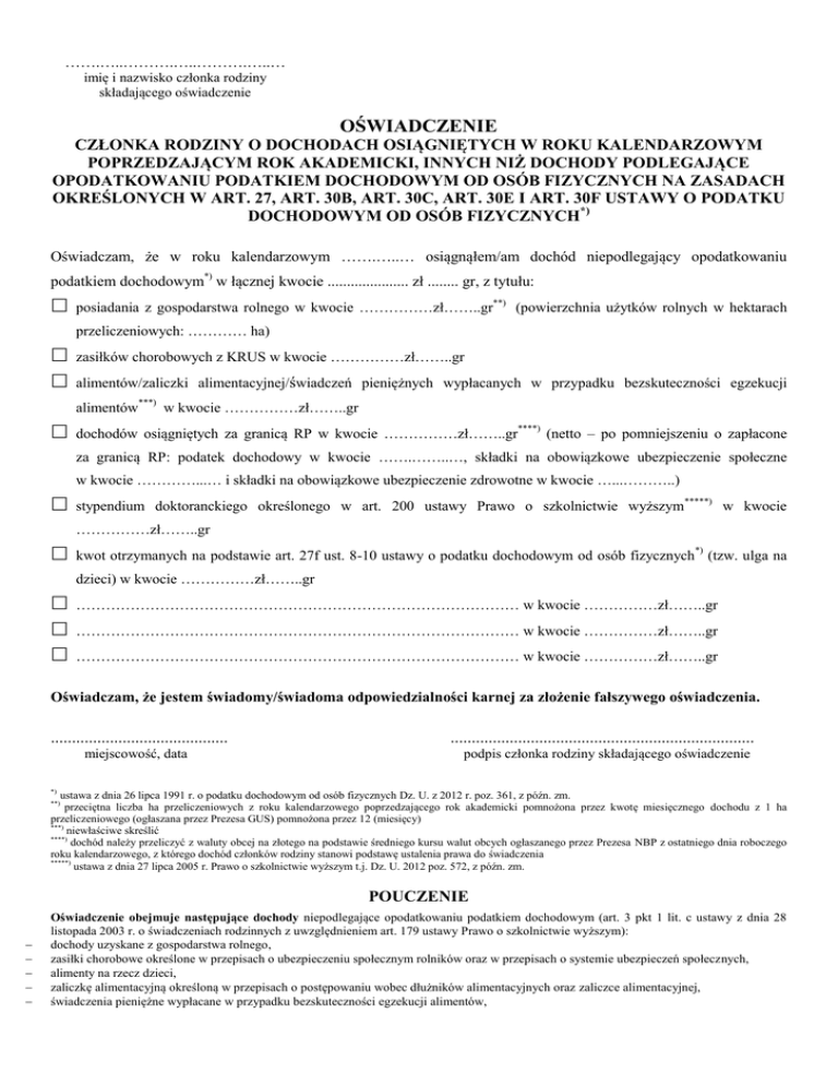 …….…..……….…..……….…..… imię i nazwisko członka rodziny składającego oświadczenie OŚWIADCZENIE CZŁONKA RODZINY O DOCHODACH OSIĄGNIĘTYCH W ROKU KALENDARZOWYM POPRZEDZAJĄCYM ROK AKADEMICKI, INNYCH NIŻ DOCHODY PODLEGAJĄCE OPODATKOWANIU PODATKIEM DOCHODOWYM OD OSÓB FIZYCZNYCH NA ZASADACH OKREŚLONYCH W ART. 27, ART. 30B, ART. 30C, ART. 30E I ART. 30F USTAWY O PODATKU DOCHODOWYM OD OSÓB FIZYCZNYCH*) Oświadczam, że w roku kalendarzowym …….…..… osiągnąłem/am dochód niepodlegający opodatkowaniu podatkiem dochodowym*) w łącznej kwocie ..................... zł ........ gr, z tytułu: posiadania z gospodarstwa rolnego w kwocie ……………zł……..gr**) (powierzchnia użytków rolnych w hektarach przeliczeniowych: ………… ha) zasiłków chorobowych z KRUS w kwocie ……………zł……..gr alimentów/zaliczki alimentacyjnej/świadczeń pieniężnych wypłacanych w przypadku bezskuteczności egzekucji alimentów***) w kwocie ……………zł……..gr dochodów osiągniętych za granicą RP w kwocie ……………zł……..gr****) (netto – po pomniejszeniu o zapłacone za granicą RP: podatek dochodowy w kwocie …….……..…, składki na obowiązkowe ubezpieczenie społeczne w kwocie …………...… i składki na obowiązkowe ubezpieczenie zdrowotne w kwocie …...………..) stypendium doktoranckiego określonego w art. 200 ustawy Prawo o szkolnictwie wyższym*****) w kwocie ……………zł……..gr kwot otrzymanych na podstawie art. 27f ust. 8-10 ustawy o podatku dochodowym od osób fizycznych*) (tzw. ulga na dzieci) w kwocie ……………zł……..gr ……………………………………………………………………………… w kwocie ……………zł……..gr ……………………………………………………………………………… w kwocie ……………zł……..gr ……………………………………………………………………………… w kwocie ……………zł……..gr Oświadczam, że jestem świadomy/świadoma odpowiedzialności karnej za złożenie fałszywego oświadczenia. .......................................... miejscowość, data ........................................................................ podpis członka rodziny składającego oświadczenie ustawa z dnia 26 lipca 1991 r. o podatku dochodowym od osób fizycznych Dz. U. z 2012 r. poz. 361, z późn. zm. przeciętna liczba ha przeliczeniowych z roku kalendarzowego poprzedzającego rok akademicki pomnożona przez kwotę miesięcznego dochodu z 1 ha przeliczeniowego (ogłaszana przez Prezesa GUS) pomnożona przez 12 (miesięcy) ***) niewłaściwe skreślić ****) dochód należy przeliczyć z waluty obcej na złotego na podstawie średniego kursu walut obcych ogłaszanego przez Prezesa NBP z ostatniego dnia roboczego roku kalendarzowego, z którego dochód członków rodziny stanowi podstawę ustalenia prawa do świadczenia *****) ustawa z dnia 27 lipca 2005 r. Prawo o szkolnictwie wyższym t.j. Dz. U. 2012 poz. 572, z późn. zm. *) **) POUCZENIE Oświadczenie obejmuje następujące dochody niepodlegające opodatkowaniu podatkiem dochodowym (art. 3 pkt 1 lit. c ustawy z dnia 28 listopada 2003 r. o świadczeniach rodzinnych z uwzględnieniem art. 179 ustawy Prawo o szkolnictwie wyższym): dochody uzyskane z gospodarstwa rolnego, zasiłki chorobowe określone w przepisach o ubezpieczeniu społecznym rolników oraz w przepisach o systemie ubezpieczeń społecznych, alimenty na rzecz dzieci, zaliczkę alimentacyjną określoną w przepisach o postępowaniu wobec dłużników alimentacyjnych oraz zaliczce alimentacyjnej, świadczenia pieniężne wypłacane w przypadku bezskuteczności egzekucji alimentów, dochody uzyskiwane za granicą Rzeczypospolitej Polskiej, pomniejszone odpowiednio o zapłacone za granicą Rzeczypospolitej Polskiej: podatek dochodowy oraz składki na obowiązkowe ubezpieczenie społeczne i obowiązkowe ubezpieczenie zdrowotne, kwoty otrzymane na podstawie art. 27f ust. 8-10 ustawy z dnia 26 lipca 1991 r. o podatku dochodowym od osób fizycznych (tzw. ulga na dzieci), świadczenie rodzicielskie, zasiłek macierzyński, o którym mowa w przepisach o ubezpieczeniu społecznym rolników; stypendia doktoranckie i habilitacyjne przyznane na podstawie ustawy z dnia 14 marca 2003 r. o stopniach naukowych i tytule naukowym oraz o stopniach i tytule w zakresie sztuki (Dz. U. z 2014 r. poz. 1852), stypendia doktoranckie określone w art. 200 ustawy z dnia 27 lipca 2005 r. Prawo o szkolnictwie wyższym, stypendia sportowe przyznane na podstawie ustawy z dnia 25 czerwca 2010 r. o sporcie (Dz. U. z 2014 r. poz. 715) oraz inne stypendia o charakterze socjalnym przyznane uczniom lub studentom, z zastrzeżeniem, że do dochodu nie wlicza się: świadczeń pomocy materialnej dla studentów i doktorantów, otrzymywanych na podstawie przepisów ustawy Prawo o szkolnictwie wyższym, stypendiów przyznawanych uczniom, studentom i doktorantom w ramach: a) funduszy strukturalnych Unii Europejskiej, b) niepodlegających zwrotowi środków pochodzących z pomocy udzielanej przez państwa członkowskie Europejskiego Porozumienia o Wolnym Handlu (EFTA), c) umów międzynarodowych lub programów wykonawczych, sporządzanych do tych umów albo międzynarodowych programów stypendialnych, świadczeń pomocy materialnej dla uczniów otrzymywanych na podstawie ustawy z dnia 7 września 1991 r. o systemie oświaty, świadczeń, o których mowa w art. 173a i 199a ustawy Prawo o szkolnictwie wyższym, stypendiów o charakterze socjalnym przyznawanych przez inne podmioty, o których mowa w art. 21 ust. 1 pkt 40b ustawy z dnia 26 lipca 1991 r. o podatku dochodowym od osób fizycznych (Dz. U. z 2012 r. poz. 361, z późn. zm.); do dochodu nie wlicza się zwiększenia stypendium doktoranckiego z dotacji projakościowej, o którym mowa a art. 200a ustawy z dnia 27 lipca 2005 r. - Prawo o szkolnictwie w