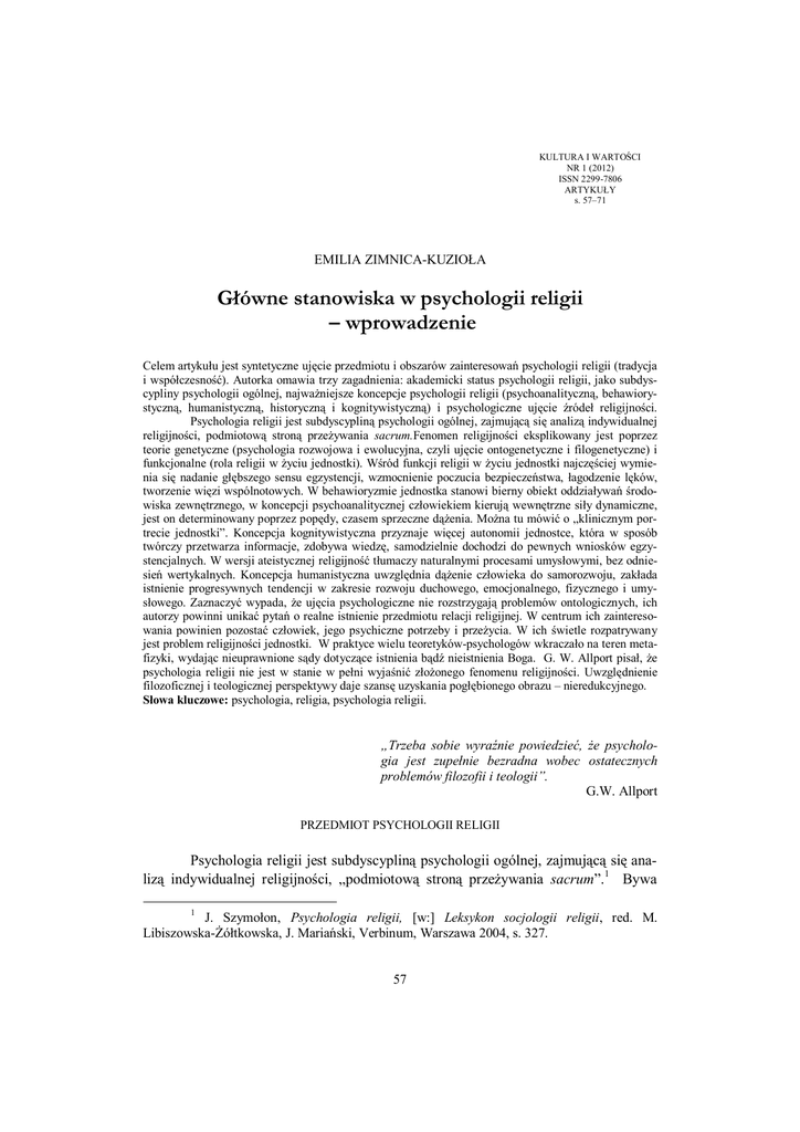 KULTURA I WARTOŚCI NR 1 (2012) ISSN 2299-7806 ARTYKUŁY s. 57–71 EMILIA ZIMNICA-KUZIOŁA Główne stanowiska w psychologii religii – wprowadzenie Celem artykułu jest syntetyczne ujęcie przedmiotu i obszarów zainteresowań psychologii religii (tradycja i współczesność). Autorka omawia trzy zagadnienia: akademicki status psychologii religii, jako subdyscypliny psychologii ogólnej, najważniejsze koncepcje psychologii religii (psychoanalityczną, behawiorystyczną, humanistyczną, historyczną i kognitywistyczną) i psychologiczne ujęcie źródeł religijności. Psychologia religii jest subdyscypliną psychologii ogólnej, zajmującą się analizą indywidualnej religijności, podmiotową stroną przeżywania sacrum.Fenomen religijności eksplikowany jest poprzez teorie genetyczne (psychologia rozwojowa i ewolucyjna, czyli ujęcie ontogenetyczne i filogenetyczne) i funkcjonalne (rola religii w życiu jednostki). Wśród funkcji religii w życiu jednostki najczęściej wymienia się nadanie głębszego sensu egzystencji, wzmocnienie poczucia bezpieczeństwa, łagodzenie lęków, tworzenie więzi wspólnotowych. W behawioryzmie jednostka stanowi bierny obiekt oddziaływań środowiska zewnętrznego, w koncepcji psychoanalitycznej człowiekiem kierują wewnętrzne siły dynamiczne, jest on determinowany poprzez popędy, czasem sprzeczne dążenia. Można tu mówić o „klinicznym portrecie jednostki”. Koncepcja kognitywistyczna przyznaje więcej autonomii jednostce, która w sposób twórczy przetwarza informacje, zdobywa wiedzę, samodzielnie dochodzi do pewnych wniosków egzystencjalnych. W wersji ateistycznej religijność tłumaczy naturalnymi procesami umysłowymi, bez odniesień wertykalnych. Koncepcja humanistyczna uwzględnia dążenie człowieka do samorozwoju, zakłada istnienie progresywnych tendencji w zakresie rozwoju duchowego, emocjonalnego, fizycznego i umysłowego. Zaznaczyć wypada, że ujęcia psychologiczne nie rozstrzygają problemów ontologicznych, ich autorzy powinni unikać pytań o realne istnienie przedmiotu relacji religijnej. W centrum ich zainteresowania powinien pozostać człowiek, jego psychiczne potrzeby i przeżycia. W ich świetle rozpatrywany jest problem religijności jednostki. W praktyce wielu teoretyków-psychologów wkraczało na teren metafizyki, wydając nieuprawnione sądy dotyczące istnienia bądź nieistnienia Boga. G. W. Allport pisał, że psychologia religii nie jest w stanie w pełni wyjaśnić złożonego fenomenu religijności. Uwzględnienie filozoficznej i teologicznej perspektywy daje szansę uzyskania pogłębionego obrazu – nieredukcyjnego. Słowa kluczowe: psychologia, religia, psychologia religii. „Trzeba sobie wyraźnie powiedzieć, że psychologia jest zupełnie bezradna wobec ostatecznych problemów filozofii i teologii”. G.W. Allport PRZEDMIOT PSYCHOLOGII RELIGII Psychologia religii jest subdyscypliną psychologii ogólnej, zajmującą się analizą indywidualnej religijności, „podmiotową stroną przeżywania sacrum”.1 Bywa 1 J. Szymołon, Psychologia religii, [w:] Leksykon socjologii religii, red. M. Libiszowska-Żółtkowska, J. Mariański, Verbinum, Warszawa 2004, s. 327. 57 traktowana jako dział psychologii stosowanej, bądź religioznawstwa. „W pierwszym przypadku – stwierdza J. Szymołon – przedmiotem badań są osobowościowe uwarunkowania religijności, procesy odchodzenia od religii i religijnego nawrócenia oraz wpływ doktryny, kultu i organizacji religijnej na sposób poznawczego, emocjonalnego i działaniowego funkcjonowania człowieka. Obszar zainteresowań religioznawcy koncentruje się na funkcji religii, motywacji religijnej, związkach religijności ze zdrowiem psychicznym oraz procesach psychofizjologicznych, towarzyszących takim stanom świadomości, jak ekstaza, trans czy przeżycie mistyczne. Obejmuje także wyjaśnianie genezy religijności, które przedstawia się w ramach teorii antyredukcjonistycznych i redukcjonistycznych. Podejście antyredukcjonistyczne uznaje religijność za zjawisko autonomiczne, niewyprowadzalne z bardziej pierwotnych źródeł podmiotowych i będące konsekwencją praobjawienia, czy stanowiące wręcz pierwotną intencjonalność. W teoriach redukcjonistycznych religijność jest traktowana jako zjawisko wtórne, będące wytworem życia społecznego, szeroko rozumianej potrzeby zachowania gatunku, czy stanowiące konkretyzację niereligijnych procesów indywidualnych albo grupowych”2. Fenomen religijności eksplikowany jest przez teorie genetyczne (psychologia rozwojowa i ewolucyjna, czyli ujęcie ontogenetyczne i filogenetyczne) i funkcjonalne (rola religii w życiu jednostki). Wśród funkcji religii w życiu jednostki najczęściej wymienia się nadanie głębszego sensu egzystencji, wzmocnienie poczucia bezpieczeństwa, łagodzenie lęków, tworzenie więzi wspólnotowych. Nie jest moim zamiarem systematyczne przedstawienie teoretycznych i empirycznych dokonań psychologii religii (w aspekcie historycznym). Zrobił to gruntownie i ciekawie Jan Szmyd w książce Religijność i transcendencja. Wprowadzenie do psychologii religii i duchowości3. Autor prezentuje najważniejsze postaci światowej i polskiej psychologii religii, omawia zagadnienia teoretyczne i metodologiczne, główne kierunki i orientacje badawcze. Z perspektywy psychologicznej analizuje wybrane zagadnienia z pogranicza dyscypliny i innych nauk społecznych (m.in. problem sekt, psychologię cudu, religijne sanktuaria). Precyzuje także wybrane kategorie psychologii religii, takie jak religijność, doświadczenie religijne, postawy wobec religii, konwersje, etc. Ważną pozycją z tej dziedziny jest też książka H. GrzymałyMoszczyńskiej Religia a kultura. Wybrane zagadnienia z kulturowej psychologii religii4. Oprócz syntetycznej prezentacji dziejów światowej i polskiej psychologii religii, autorka zarysowuje akulturacyjne modele religii, główne koncepcje teoretyc