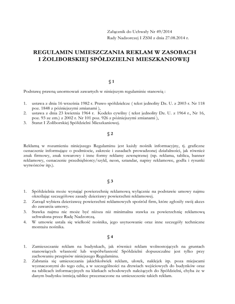 Załącznik do Uchwały Nr 49/2014 Rady Nadzorczej I ŻSM z dnia 27.08.2014 r. REGULAMIN UMIESZCZANIA REKLAM W ZASOBACH I ŻOLIBORSKIEJ SPÓŁDZIELNI MIESZKANIOWEJ §1 Podstawę prawną unormowań zawartych w niniejszym regulaminie stanowią : 1. 2. 3. ustawa z dnia 16 września 1982 r. Prawo spółdzielcze ( tekst jednolity Dz. U. z 2003 r. Nr 118 poz. 1848 z późniejszymi zmianami ), ustawa z dnia 23 kwietnia 1964 r. Kodeks cywilny ( tekst jednolity Dz. U. z 1964 r., Nr 16, poz. 93 ze zm.) z 2002 r. Nr 101 poz. 926 z późniejszymi zmianami ), Statut I Żoliborskiej Spółdzielni Mieszkaniowej. §2 Reklamą w rozumieniu niniejszego Regulaminu jest każdy nośnik informacyjny, tj. graficzne oznaczenie informujące o podmiocie, zakresie i zasadach prowadzonej działalności, jak również znak firmowy, znak towarowy i inne formy reklamy zewnętrznej (np. reklama, tablica, banner reklamowy, oznaczenie przedsiębiorcy/szyld, neon, sztandar, napisy reklamowe, godła i rysunki wytwórców itp.). §3 1. 2. 3. 4. Spółdzielnia może wynająć powierzchnię reklamową wyłącznie na podstawie umowy najmu określając szczegółowe zasady dzierżawy powierzchni reklamowej. Zarząd wybiera dzierżawcę powierzchni reklamowych spośród firm, które zgłosiły swój akces do zawarcia umowy. Stawka najmu nie może być niższa niż minimalna stawka za powierzchnię reklamową uchwalona przez Radę Nadzorczą. W umowie ustala się wielkość nośnika, jego usytuowanie oraz inne szczegóły techniczne montażu nośnika. §4 1. 2. Zamieszczanie reklam na budynkach, jak również reklam wolnostojących na gruntach stanowiących własność lub współwłasność Spółdzielni dopuszczalne jest tylko przy zachowaniu przepisów niniejszego Regulaminu. Zabrania się umieszczania jakichkolwiek reklam, ulotek, naklejek itp. poza miejscami wyznaczonymi do tego celu, a w szczególności na drzwiach wejściowych do budynków oraz na tablicach informacyjnych na klatkach schodowych należących do Spółdzielni, chyba że w danym budynku istnieją tablice przeznaczone na umieszczenie takich reklam. §5 1. 2. 2. 3. W celu zamieszczenia reklamy w zasobach I Żoliborskiej Spółdzielni Mieszkaniowej osoba zainteresowana zobowiązana jest złożyć wniosek do Zarządu o wyrażenie zgody na zamieszczenie tej reklamy i o zawarcie stosownej umowy. Wniosek, o którym mowa w ustępie poprzedzającym winien zawierać: a) imię i nazwisko lub nazwę oraz adres bądź siedzibę osoby występującej z wnioskiem, b) szczegółowy opis lokalizacji reklamy (np. mapa, rysunek, zdjęcie itp.), c) graficzny projekt lub wizualizację reklamy zawierające jej treść wraz z podaniem powierzchni reklamy, a w przypadku reklamy wolnostojącej powierzchnię zajętego gruntu, d) opis sposobu zamontowania, rodzaj konstrukcji oraz sposób demontażu reklamy po zakończeniu umowy, e) informacji o sposobie zasilania w energię elektryczną w przypadku reklamy świetlnej lub podświetlanej, f) projekt budowlany, jeśli wymagają tego odrębne przepisy. W razie potrzeby Zarząd, po wpłynięciu wniosku zawierającego dane określone w ustępie poprzedzającym, może zażądać dodatkowych informacji i wyjaśnień. Kształt, kolor i sposób wykonania reklam powinien być zharmonizowany z otoczeniem, nie oszpecać budynku i nie zagrażać bezpieczeństwu ludzi i mienia. Reklamy świetlne i podświetlane nie mogą powodować szkodliwych skutków dla otoczenia oraz zakłócać spokoju mieszkańców szczególnie w porze nocnej. Uzyskanie zgody Zarządu na umieszczenie reklamy nie uchybia obowiązkom wynikającym z przepisów prawa powszechnie obowiązującego, w szczególności obowiązkowi zgłoszenia w organach architektoniczno-budowlanych rozpoczęcia robót, jak również obowiązkowi uzyskania pozwolenia na budowę. W przypadku wydania decyzji odmownej lub złożenia sprzeciwu przez te organy zgoda Zarządu na zamieszczenie reklamy uznana zostaje za niebyłą. §6 1. Po spełnieniu warunków określonych w przepisach poprzedzających, Zarząd zawiera z osobą zainteresowaną (dalej zwaną „reklamodawcą”) umowę stanowiącą podstawę do zamieszczenia reklamy. 2. Z reklamodawcą zawiera się umowę najmu. Zawierania umowy najmu nie wymaga się oraz udostępnia powierzchnię na zasadzie bezpłatnego użyczenia w przypadku: a) zamieszczenia szyldów zawierających informacje dotyczące oznaczenia siedziby podmiotu oraz miejsca prowadzenia działalności gospodarczej, nazwę i adres przedsiębiorcy umieszczonych na zewnątrz wynajętego bądź wydzierżawionego przez tego przedsiębiorcę lokalu bądź gruntu w zasobach Spółdzielni, wykonane na płaskiej tablicy, nieprzekraczającej oznaczonej w umowie powierzchni, b) reklam wywieszanych w witrynie lub na drzwiach wejściowych wynajmowanego lub dzierżawionego od Spółdzielni lokalu użytkowego, c) informacji publicznej zamieszczanej przez organy władzy rządowej i samorządowej. 3. W umowie najmu zastrzega się, że treść reklamy nie może naruszać przepisów prawa powszechnie obowiązującego, w szczególności nie może godzić w dobra prawem chronione, a za wszelkie naruszenia tego zakazu odpowiada reklamodawcą. §7 1. 2. 3. 4. Reklamodawca montuje oraz demontuje reklamy na swój koszt i we własnym zakresie, zgodnie z obowiązującymi przepisami prawa budowlanego. W przypadku reklam świetlnych, z których energia elektryczna pobierana będzie z instalacji ogólnego użytku, najemca/dzierżawca zobowiązany jest do założenia licznika poboru energii elektrycznej na własny koszt. Reklamy winny być utrzymywane w należytym stanie technicznym i estetycznym na koszt najemcy/dzierżawcy. Niezachowanie tych wymogów upoważnia Spółdzielnię do wypowiedzenia umowy, na podstawie której zamieszczono reklamę, bez zachowania terminów wypowiedzenia. Za szkody wynikłe z umieszczenia reklamy, powstałe również w wypadku ich przewrócenia się, oderwania i innych zdarzeń odpowiada