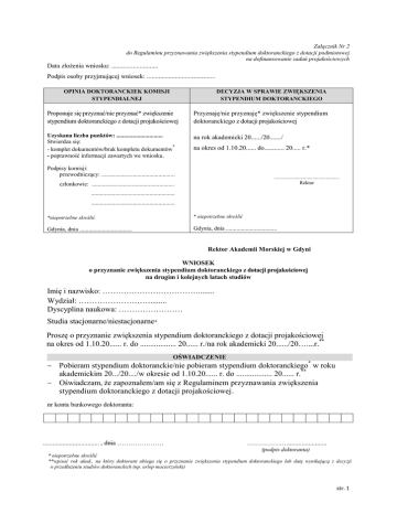 Załącznik Nr 2 do Regulaminu przyznawania zwiększenia stypendium doktoranckiego z dotacji podmiotowej na dofinansowanie zadań projakościowych Data złożenia wniosku: ............................ Podpis osoby przyjmującej wniosek: ......................................... DECYZJA W SPRAWIE ZWIĘKSZENIA STYPENDIUM DOKTORANCKIEGO OPINIA DOKTORANCKIEK KOMISJI STYPENDIALNEJ Proponuje się przyznać/nie przyznać* zwiększenie stypendium doktoranckiego z dotacji projakościowej Uzyskana liczba punktów: ............................... Stwierdza się: * - komplet dokumentów/brak kompletu dokumentów - poprawność informacji zawartych we wniosku. Przyznaję/nie przyznaję* zwiększenie stypendium doktoranckiego z dotacji projakościowej na rok akademicki 20....../20......./ na okres od 1.10.20...... do............ 20..... r.* Podpisy komisji: przewodniczący: ................................................. ................................................. Rektor członkowie: ....................................................... ........................................................ ........................................................ *niepotrzebne skreślić * niepotrzebne skreślić Gdynia, dnia ................................... Gdynia, dnia .................................. Rektor Akademii Morskiej w Gdyni WNIOSEK o przyznanie zwiększenia stypendium doktoranckiego z dotacji projakościowej na drugim i kolejnych latach studiów Imię i nazwisko: ………………………………........ Wydział: ………………………........ Dyscyplina naukowa: …………………… Studia stacjonarne/niestacjonarne* Proszę o przyznanie zwiększenia stypendium doktoranckiego z dotacji projakościowej na okres od 1.10.20...... r. do .................. 20...... r./na rok akademicki 20....../20…....r.** OŚWIADCZENIE Pobieram stypendium doktoranckie/nie pobieram stypendium doktoranckiego* w roku akademickim 20.../20..../w okresie od 1.10.20...... r. do .................. 20...... r.** Oświadczam, że zapoznałem/am się z Regulaminem przyznawania zwiększenia stypendium doktoranckiego z dotacji projakościowej. nr konta bankowego doktoranta: .................................. , dnia ………………… …………….…....................... (podpis doktoranta) * niepotrzebne skreślić **wpisać rok akad., na który doktorant ubiega się o przyznanie zwiększenia stypendium doktoranckiego lub datę wynikającą z decyzji o przedłużeniu studiów doktoranckich (np. urlop macierzyński) str. 1 DZIAŁALNOŚĆ NAUKOWO – BADAWCZA 1. Kategoria 1.1. Ocena pracy naukowej przez promotora/opiekuna naukowego* Skala punktowa Liczba punktów Podpis oceniającego 10-50 (opinia z propozycją liczby punktów – formularz A) 1.2. Otwarty przewód doktorski (decyzja wszczęcia przewodu doktorskiego) 1.3. Granty/projekty badawcze: a) kierowanie własnym grantem/projektem badawczym (dokument powołania na kierownika 30 15 projektu) b) badania związane bezpośrednio z tematyką doktoratu (zaświadczenie wystawione przez kierownika 10 grantu/projektu) c) badania związane z innymi grantami/projektami badawczymi i współpracą z przemysłem 5 (zaświadczenie) 1.4. Komercjalizacja badań a) patent (ksero zaświadczenia o uzyskaniu patentu) b) zgłoszenie patentowe (ksero zgłoszenia) 15 za patent 5 za zgłoszenie 1.5. Publikacje a) publikacje na liście A czasopism punktowanych MNiSzW (dotyczy poprzedniego roku akademickiego – formularz B - tabela dorobku katedry opiekuna naukowego/promotora) b) publikacje na liście B czasopism punktowanych MNiSzW (dotyczy poprzedniego roku akademickiego – formularz B - tabela dorobku katedry opiekuna naukowego/promotora) c) monografia (dotyczy poprzedniego roku akademickiego – formularz B - tabela dorobku katedry opiekuna naukowego/promotora) d) rozdział w monografii anglojęzycznej (dotyczy poprzedniego roku akademickiego – formularz B - tabela dorobku katedry opiekuna naukowego/promotora) e) rozdział w monografii polskojęzycznej (dotyczy poprzedniego roku akademickiego – formularz B - tabela dorobku katedry opiekuna naukowego/promotora) zgodnie z punktacją MNiSzW i uwzględnieniem udziałów współautorów zgodnie z punktacją MNiSzW i uwzględnieniem udziałów współautorów 20 z uwzględnieniem udziałów współautorów 5z uwzględnieniem udziałów współautorów 4z uwzględnieniem udziałów współautorów 1.6. Staż naukowy zagraniczny/krajowy (potwierdzenie odbycia stażu, dotyczy poprzedniego roku akademickiego) 2 1.7. Udział w konferencjach naukowych międzynarodowych 3 za referat (wymienić nazwę i miejsce konferencji, dotyczy 2 poprzedniego roku akademickiego– formularz C - tabela udziału w konferencjach opracowywana w katedrze opiekuna naukowego/promotora) 1.8. Udział w konferencjach naukowych krajowych (wymienić nazwę i miejsce konferencji, dotyczy poprzedniego roku akademickiego – formularz C tabela udziału w konferencjach opracowywana w katedrze opiekuna naukowego/promotora) 2 za referat 1.9. Referat na seminarium w jednostce (wymienić tytuł referatu oraz miejsce i datę seminarium, dotyczy poprzedniego roku akademickiego – formularz C - tabela udziału w konferencjach opracowywana w katedrze opiekuna naukowego/promotora) 1 za referat DZIAŁALNOŚĆ DYDAKTYCZNA 2. 2.1.Opinia prowadzącego przedmiot, w ramach, którego doktorant prowadził zajęcia 10 - 20 (formularz D) SUMA PUNKTÓW: 3