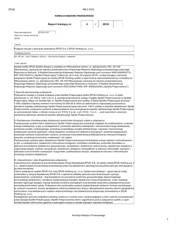 ZPUE RB 2 2016 KOMISJA NADZORU FINANSOWEGO Raport bieżący nr Data sporządzenia: 2 / 2016 2016-01-25 Skróc ona nazwa emitenta ZPUE Temat Podjęcie decyzji o zamiarze połączenia ZPUE S.A. z ZPUE Holding sp. z o.o. Podstawa prawna Art. 56 ust. 1 pkt 2 Ustawy o oferc ie - informac je bieżąc e i okresowe Treść raportu: Zarząd spółki ZPUE Spółka Akcyjna z siedzibą we Włoszczowie (adres: ul. Jędrzejowska 79C, 29-100 Włoszczowa), wpisanej do rejestru przedsiębiorców Krajowego Rejestru Sądowego prowadzonego przez Sąd Rejonowy w Kielcach, X Wydział Gospodarczy Krajowego Rejestru Sądowego pod numerem KRS 0000052770, NIP: 6561494014 („Spółka Przejmująca”) informuje, że w dniu 25 stycznia 2016 r. podjął decyzję o zamiarze połączenia Spółki Przejmującej ze spółką ZPUE Holding spółka z ograniczoną odpowiedzialnością z siedzibą we Włoszczowie (adres: ul. Jędrzejowska 79C, 29-100 Włoszczowa), wpisaną do rejestru przedsiębiorców Krajowego Rejestru Sądowego prowadzonego przez Sąd Rejonowy w Kielcach, X Wydział Gospodarczy Krajowego Rejestru Sądowego pod numerem KRS 0000274469, NIP: 6090024265 („Spółka Przejmowana”). I. Sposób planowanego połączenia: Połączenie nastąpi w drodze przejęcia przez Spółkę Przejmującą spółki ZPUE Holding sp. z o.o. w trybie określonym w art. 492 § 1 pkt 1) k.s.h. tj. poprzez przeniesienie całego majątku Spółki Przejmowanej na Spółkę Przejmującą. Mając na uwadze fakt, iż Spółka Przejmowana jest spółką, w której Spółka Przejmująca posiada 1.050 udziałów o łącznej wartości nominalnej 52.500,00 zł, które po zakończeniu rozpoczętej już procedury obniżenia kapitału zakładowego Spółki Przejmowanej będą stanowić 100% udziału w kapitale zakładowym Spółki Przejmowanej, połączenie zostanie przeprowadzone bez podwyższenia kapitału zakładowego Spółki Przejmującej w uproszczonym trybie, o którym mowa w art. 516 § 6 w zw. z art. 516 § 1 k.s.h. – pod warunkiem prawnym uprzedniej rejestracji obniżenia kapitału zakładowego Spółki Przejmowanej. II. Podstawowa charakterystyka działalności podmiotów biorących udział w połączeniu: Podstawowym przedmiotem działalności Spółki Przejmującej jest produkcja urządzeń do przetwarzania i przesyłu energii elektrycznej, w tym w szczególności: produkcja aparatury rozdzielczej i sterowniczej energii elektrycznej, produkcja sprzętu instalacyjnego, produkcja pozostałego sprzętu elektrycznego, naprawa i konserwacja metalowych wyrobów gotowych, roboty związane z budową linii telekomunikacyjnych i elektroenergetycznych, produkcja wyrobów budowlanych z betonu, produkcja masy betonowej prefabrykowanej, transport drogowy towarów, produkcja konstrukcji metalowych i ich części. Podstawowym przedmiotem działalności Spółki Przejmowanej jest świadczenie usług z zakresu rachunkowości, w tym w szczególności: działalność rachunkowo-księgowa, doradztwo podatkowe, pozostałe doradztwo w zakresie prowadzenia działalności gospodarczej i zarządzania, działalność ochroniarska, działalność związana z organizacją targów, wystaw i kongresów, działalność związana z doradztwem w zakresie informatyki, wynajem i dzierżawa samochodów osobowych i furgonetek, przetwarzanie danych, zarzadzanie stronami internetowymi (hosting)i podobna działalność. III. Uzasadnienie i cele długookresowe połączenia: Uzasadnieniem połączenia jest restrukturyzacja Grupy Kapitałowej ZPUE S.A., do której należy ZPUE Holding sp. z o.o., zapewniająca koncentrację prowadzonej przez nią działalności operacyjnej przy jednoczesnym zmniejszeniu jej sfery kosztowej. Celem połączenia spółek ZPUE S.A. oraz ZPUE Holding sp. z o.o. będzie konsolidacja i ograniczenie liczby podmiotów w Grupie Kapitałowej ZPUE S.A. i uzyskanie efektów ekonomiczno-finansowych synergii bezpośredniej i pośredniej - doprowadzenie do powstania podmiotu gospodarczego zapewniającego konsolidację działalności, obniżenie (optymalizacja) kosztów działalności Grupy Kapitałowej, w tym redukcja kosztów ogólnego zarządu, lepsza alokacja środków pieniężnych oraz bardziej racjonalne przepływy finansowe pomiędzy podmiotami grupy. Połączenie obu podmiotów pozwoli zoptymalizować zadania i funkcje centralizując je, pozwoli usprawnić proces zarządzania całością działalności Grupy i zdecydowanie poprawi jakość zarządzania personelem oraz efektywność nadzoru właścicielskiego nad działalnością dotychczas prowadzoną w ZPUE Holding sp. z o.o. Szczegółowe warunki połączenia zostaną ustalone w wyniku prac i analiz podjętych w toku rozmów prowadzonych przez Zarządy Spółki Przejmującej i Spółki Przejmowanej celem uzgodnienia planu połączenia spółek, o czym emitent będzie informować zgodnie z wymogami prawa w drodze dalszych raportów bieżących. Komisja Nadzoru Finansowego 1 ZPUE RB 2 2016 ZPUE S.A. (pełna nazwa emitenta) Elektromaszynowy (ele) ZPUE (skróc ona nazwa emitenta) 29-100 (sektor wg. klasyfikac ji GPW w W-wie) Włoszczowa (kod poc ztowy) (miejscowość) Jędrzejowska 79c (ulica) (numer) 041 3881000 041 3881001 (telefon) (fax) [email protected] zpue.pl (e-mail) (www) 656-14-94-014 290780734 (NIP) (REGON) PODPISY OSÓB REPREZENTUJĄCYCH SPÓŁKĘ Data Imię i Nazwisko Stanowisko/Funkc ja 2016-01-25 Andrzej Grzybek Prezes Zarządu 2016-01-25 Krzysztof Jamróz Członek Zarządu Podpis Komisja Nadzoru Finansowego 2