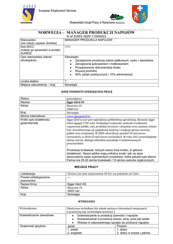European Employment Services Wojewódzki Urząd Pracy w Rzeszowie (Katowice) NORWEGIA – MANAGER PRODUKCJI NAPOJÓW Stanowisko: (nie należy używać skrótów) Kod ISCO: (należy go sprawdzić w portalu EURES) Opis stanowiska/ zakres obowiązków: Liczba etatów: Miejsce zatrudnienia – kraj: Nr ref. EURES: 06261110000023 MANAGER PRODUKCJI NAPOJÓW 1311 Obowiązki: Zarządzanie produkcją soków jabłkowych, cydru i destylatów Zarządzanie pakowaniem i metkowaniem Przygotowanie dokumentacji działu Rozwój produktu 90% zadań praktycznych i 10% administracji 1 Norwegia DANE PODMIOTU OFERUJĄCEGO PRACĘ Status: Nazwa: Adres: Kraj: Strona internetowa: Krótki opis działalności gospodarczej: pracodawca Egge Gård AS Banevien 16 3400 Lier Norwegia www.eggegaard.no Egge Gård w Lier jest największą spółdzielnią ogrodniczą. Korzenie Egge Gård sięgają 1702 roku. Produkuje truskawki, sadzonki truskawek, organiczne jabłka, soki, produkty mrożone i destylaty oraz nasiona. Gmina Lier charakteryzuje się wyjątkową historią i tradycją upraw owoców, jabłek oraz truskawek. W 2009 obrót firmy wyniósł 18 mln koron norweskich, w 2010 23 mln koron norweskich. W roku 2011 przewidujemy dalszy wzrost, dlatego aktualnie poszukuje 4 utalentowanych pracowników. Produkcja truskawek, których sezon trwa krótko, to główna działalność. Nasze jabłka mają unikalny smak i jak na razie stworzyliśmy wiele wyśmienitych produktów, które polubili nasi klienci. Farma ma 25-30 akrów truskawek i 10 akrów owoców organicznych. MIEJSCE PRACY Lokalizacja: Powód oddelegowania pracownika: Nazwa firmy: Adres: Kraj: Gmina Lier jest usytuowana 40 km na południe od Oslo. --Egge Gård AS Banevien 16 3400 Lier Norwegia WYMAGANIA Wykształcenie: Doświadczenie zawodowe: Znajomość języków: Ukończone technikum lub szkoła wyższa o kierunkach związanych z żywnością (np. technologia żywności ). Doświadczenie w produkcji żywności i napojów. Doświadczenie w produkcji soków, wina, piwa lub wódki. Wiedza nt odpowiedniego sprzętu do produkcji napojów. Język Poziom 1. polski 1. dobry 2. angielski 2. dobry w mowie i piśmie Uprawnienia/ dyplomy/ dokumenty (np. prawo jazdy): Inne istotne wymagania: Prawo jazdy kat. B poczucie porządku, efektywność, dokładność zwiększanie produktywności, gotowość do przyjęcia osobistej odpowiedzialności, obsługa komputera – znajomość środowiska Windows (World, Excel, Outlook). WYNAGRODZENIE I WARUNKI ZATRUDNIENIA Wysokość pensji brutto: Wysokość pensji netto: Waluta, w jakiej wypłacana jest pensja: Rodzaj stawki wynagrodzenia: (godzinowa/ tygodniowa/ miesięczna/ roczna/ inna) Premie: Dodatkowe świadczenia (zakwaterowanie, wyżywienie, koszty związane ze zmianą miejsca zamieszkania, koszty podróży itp.): Nazwa firmy, z którą zostanie podpisana umowa: Rodzaj umowy: Wymiar czasu pracy (praca na pełen etat/ część etatu): Czas trwania umowy: (nieokreślony/ określony) Od 22 000 miesięcznie brutto --NOK (korony norweskie) miesięczna --Elastyczny czas pracy, istnieje możliwość pracy przez okres 6 tygodni i 2 tygodni pobytu w domu – do uzgodnienia z pracodawcą. Pracodawca zapewnia zakwaterowanie na farmie. Pracodawca zapewnia zakwaterowanie na farmie, jego koszt w wysokości 3000 NOK będzie potrącany z pensji pracownika. Egge Gård AS umowa o pracę Pełen etat nieokreślony Data wygaśnięcia umowy (w przypadku umowy na czas określony): --- Liczba godzin tygodniowo: 40 Zmiany i praca w dni wolne: tak Data rozpoczęcia: Tak szybko jak to możliwe Inne informacje: Zatrudniony pracownik będzie uczestniczył w szkoleniu HSE (BHP) i KLS (zapewnienie jakości w rolnictwie). SPOSÓB SKŁADANIA WNIOSKU Wymagane dokumenty (list motywacyjny, CV itp.): Język, w którym muszą być sporządzone przedkładane dokumenty: Do kogo należy wysłać dokumenty: (do pracodawcy/ doradcy EURES) Gdzie należy wysłać dokumenty: (adres, adres e-mail, nr faksu z kodem kraju itp.) Dane teleadresowe doradcy EURES lub przedstawiciela pracodawcy: (nazwisko, adres, telefon, fax, e-mail itp.) CV i list motywacyjny. angielski doradca EURES w WUP w Katowicach Na adres e-mail: [email protected] wpisując w temacie wiadomości nazwę stanowiska oraz kraju. Aleksandra Kopczyk – doradca EURES, tel. 32 757 33 91 DODATKOWE INFORMACJE Dlaczego powinieneś wybrać Egg Gård AS? Firma przeżywa dynamiczny rozwój, dlatego czekają tutaj nowe wyzwania. Będziesz mieć możliwość zbudowania swojej pozycji. Nasza firma to pracodawca o dobrej reputacji i silnej pozycji ekonomicznej. W związku z tym możemy zaoferować konkurencyjne warunki, doświadczonych, oddanych i służących wiedzą kolegów. Jeśli już masz pracowników, których chciałbyś zabrać – to świetnie. Szukamy pracowników z inicjatywą, dokładnych, zdolnych radzić sobie z dużą ilością pracy. Data publikacji: Termin przedkładania podań o pracę / zakończenia ważności oferty: WAŻNOŚĆ 17.10.2011 30.10.2011 Uprzejmie informujemy, że skontaktujemy się wyłącznie z wybranymi kandydatami. UWAGA: 1. Umowa z zagranicznym pracodawcą zostanie zawarta zgodnie z prawem kraju zatrudnienia. Oznacza to, że wszystkie roszczenia odnośnie do warunków, które obejmuje umowa, można kierować wyłącznie do odpowiedniego sądu w kraju zatrudnienia. Publiczne służby zatrudnienia (EURES) nie mogą pośredniczyć ani reprezentować pracownika w sądzie kraju zatrudnienia w przypadku sporu z pracodawcą. 2. Publiczne służby zatrudnienia (EURES) dokładają wszelkich starań, aby zapewnić rzetelność i wiarygodność ofert pracy zgłoszonych w lokalnym urzędzie pracy. Należy wyjaśnić, że oferta pracy została zgłoszona przez stronę trzecią i EURES nie odpowiada za ewentualne rozbieżności między warunkami pracy określonymi w ofercie pracy i warunkami oferowanymi przez potencjalnego pracodawcę. 3. Na podstawie ustawy o ochronie danych osobowych z dnia 29 sierpnia 199