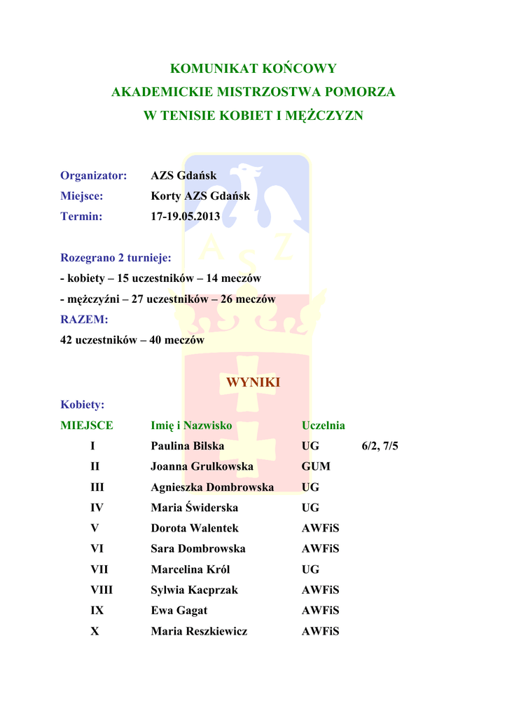 KOMUNIKAT KOŃCOWY AKADEMICKIE MISTRZOSTWA POMORZA W TENISIE KOBIET I MĘŻCZYZN Organizator: AZS Gdańsk Miejsce: Korty AZS Gdańsk Termin: 17-19.05.2013 Rozegrano 2 turnieje: - kobiety – 15 uczestników – 14 meczów - mężczyźni – 27 uczestników – 26 meczów RAZEM: 42 uczestników – 40 meczów WYNIKI Kobiety: MIEJSCE Imię i Nazwisko Uczelnia I Paulina Bilska UG II Joanna Grulkowska GUM III Agnieszka Dombrowska UG IV Maria Świderska UG V Dorota Walentek AWFiS VI Sara Dombrowska AWFiS VII Marcelina Król UG VIII Sylwia Kacprzak AWFiS IX Ewa Gagat AWFiS X Maria Reszkiewicz AWFiS 6/2, 7/5 XI Anna Goluba AWFiS XII Ewa Jeżewska AWFiS XIII Ilona Gradecka AWFiS XIV Anna Górska AWFiS XV Paulina Miszczuk AWFiS Imię i Nazwisko Uczelnia I Maciej Pałubicki UG II Paweł Wróbel PG III Marcin Matuszewski PG IV Piotr Sierzputowski UG V Maciej Dyżewski PG VI Marcin Skrzypek AWFiS VII Adam Detko PG VIII Robert Kozakiewicz PG IX Grzegorz Markiewicz GUM X Łukasz Skrzypek AWFiS XI Jakub Welz UG XII Artur Mularczyk UG XIII Maciej Kuchta AWFiS XIV Bartłomiej Strot UG XV Mateusz Baranowski PG XVI Wojciech Kowalewski UG XVII Marcin Polański UG XVIII Wojciech Kobus AWFiS XIX Mateusz Pagacz GUM XX Włodzimierz Kulpaka PG XXI Piotr Dembowski AWFiS Mężczyźni: MIEJSCE 7/5, 6/4 XXII Marek Abiński GUM XXIII Sergiusz Regent AWFiS XXIV Norbert Szram GUM XXV Carl Melner GUM XXVI Przemysław Ciastoń AWFiS XXVII Tomasz Światkowski AWFiS