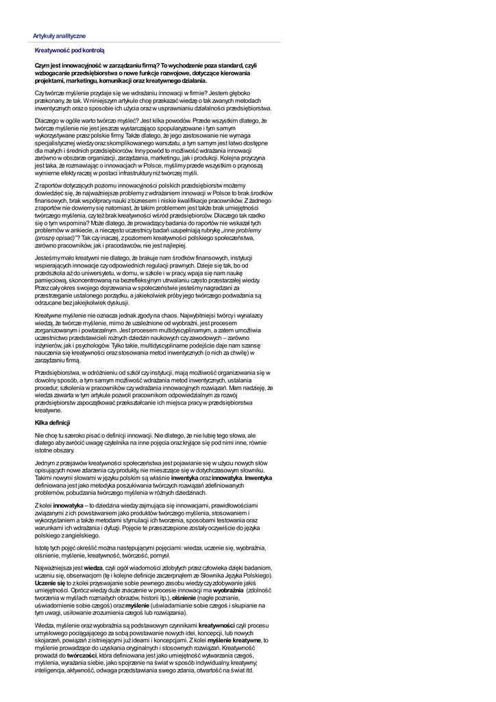 Artykuły analityczne Kreatywność pod kontrolą Czym jest innowacyjność w zarządzaniu firmą? To wychodzenie poza standard, czyli wzbogacanie przedsiębiorstwa o nowe funkcje rozwojowe, dotyczące kierowania projektami, marketingu, komunikacji oraz kreatywnego działania. Czy twórcze myślenie przydaje się we wdrażaniu innowacji w firmie? Jestem głęboko przekonany, że tak. W niniejszym artykule chcę przekazać wiedzę o tak zwanych metodach inwentycznych oraz o sposobie ich użycia oraz w usprawnianiu działalności przedsiębiorstwa. Dlaczego w ogóle warto twórczo myśleć? Jest kilka powodów. Przede wszystkim dlatego, że twórcze myślenie nie jest jeszcze wystarczająco spopularyzowane i tym samym wykorzystywane przez polskie firmy. Także dlatego, że jego zastosowanie nie wymaga specjalistycznej wiedzy oraz skomplikowanego warsztatu, a tym samym jest łatwo dostępne dla małych i średnich przedsiębiorców. Inny powód to możliwość wdrażania innowacji zarówno w obszarze organizacji, zarządzania, marketingu, jak i produkcji. Kolejna przyczyna jest taka, że rozmawiając o innowacjach w Polsce, myślimy przede wszystkim o przynoszą wymierne efekty raczej w postaci infrastruktury niż twórczej myśli. Z raportów dotyczących poziomu innowacyjności polskich przedsiębiorstw możemy dowiedzieć się, że najważniejsze problemy z wdrażaniem innowacji w Polsce to brak środków finansowych, brak współpracy nauki z biznesem i niskie kwalifikacje pracowników. Z żadnego z raportów nie dowiemy się natomiast, że takim problemem jest także brak umiejętności twórczego myślenia, czy też brak kreatywności wśród przedsiębiorców. Dlaczego tak rzadko się o tym wspomina? Może dlatego, że prowadzący badania do raportów nie wskazał tych problemów w ankiecie, a nieczęsto uczestnicy badań uzupełniają rubrykę „inne problemy (proszę opisać)”? Tak czy inaczej, z poziomem kreatywności polskiego społeczeństwa, zarówno pracowników, jak i pracodawców, nie jest najlepiej. Jesteśmy mało kreatywni nie dlatego, że brakuje nam środków finansowych, instytucji wspierających innowacje czy odpowiednich regulacji prawnych. Dzieje się tak, bo od przedszkola aż do uniwersytetu, w domu, w szkole i w pracy, wpaja się nam naukę pamięciową, skoncentrowaną na bezrefleksyjnym utrwalaniu często przestarzałej wiedzy. Przez cały okres swojego dojrzewania w społeczeństwie jesteśmy nagradzani za przestrzeganie ustalonego porządku, a jakiekolwiek próby jego twórczego podważania są odrzucane bez jakiejkolwiek dyskusji. Kreatywne myślenie nie oznacza jednak zgody na chaos. Najwybitniejsi twórcy i wynalazcy wiedzą, że twórcze myślenie, mimo że uzależnione od wyobraźni, jest procesem zorganizowanym i powtarzalnym. Jest procesem multidyscyplinarnym, a zatem umożliwia uczestnictwo przedstawicieli rożnych dziedzin naukowych czy zawodowych – zarówno inżynierów, jak i psychologów. Tylko takie, multidyscyplinarne podejście daje nam szansę nauczenia się kreatywności oraz stosowania metod inwentycznych (o nich za chwilę) w zarządzaniu firmą. Przedsiębiorstwa, w odróżnieniu od szkół czy instytucji, mają możliwość organizowania się w dowolny sposób, a tym samym możliwość wdrażania metod inwentycznych, ustalania procedur, szkolenia w pracowników czy wdrażania innowacyjnych rozwiązań. Mam nadzieję, że wiedza zawarta w tym artykule pozwoli pracownikom odpowiedzialnym za rozwój przedsiębiorstw zapoczątkować przekształcanie ich miejsca pracy w przedsiębiorstwa kreatywne. Kilka definicji Nie chcę tu szeroko pisać o definicji innowacji. Nie dlatego, że nie lubię tego słowa, ale dlatego aby zwrócić uwagę czytelnika na inne pojęcia oraz kryjące się pod nimi inne, równie istotne obszary. Jednym z przejawów kreatywności społeczeństwa jest pojawianie się w użyciu nowych słów opisujących nowe zdarzenia czy produkty, nie mieszczące się w dotychczasowym słowniku. Takimi nowymi słowami w języku polskim są właśnie inwentyka oraz innowatyka. Inwentyka definiowana jest jako metodyka poszukiwania twórczych rozwiązań zdefiniowanych problemów, pobudzania twórczego myślenia w różnych dziedzinach. Z kolei innowatyka – to dziedzina wiedzy zajmująca się innowacjami, prawidłowościami związanymi z ich powstawaniem jako produktów twórczego myślenia, stosowaniem i wykorzystaniem a także metodami stymulacji ich tworzenia, sposobami testowania oraz warunkami ich wdrażania i dyfuzji. Pojęcie te przeszczepione zostały oczywiście do języka polskiego z angielskiego. Istotę tych pojęć określić można następującymi pojęciami: wiedza, uczenie się, wyobraźnia, olśnienie, myślenie, kreatywność, twórczość, pomysł. Najważniejsza jest wiedza, czyli ogół wiadomości zdobytych przez człowieka dzięki badaniom, uczeniu się, obserwacjom (tę i kolejne definicje zaczerpnąłem ze Słownika Języka Polskiego). Uczenie się to z kolei przyswajanie sobie pewnego zasobu wiedzy czy zdobywanie jakiś umiejętności. Oprócz wiedzy duże znaczenie w procesie innowacji ma wyobraźnia (zdolność tworzenia w myślach rozmaitych obrazów, historii itp.), olśnienie (nagłe poznanie, uświadomienie sobie czegoś) oraz myślenie (uświadamianie sobie czegoś i skupianie na tym uwagi, usiłowanie zrozumienia czegoś lub rozwiązania). Wiedza, myślenie oraz wyobraźnia są podstawowym czynnikami kreatywności czyli procesu umysłowego pociągającego za sobą powstawanie nowych idei, koncepcji, lub nowych skojarzeń, powiązań z istniejącymi już ideami i koncepcjami. Z kolei myślenie kreatywne, to myślenie prowadzące do uzyskania oryginalnych i stosownych rozwiązań. Kreatywność prowadzi do twórczości, która definiowana jest jako umiejętność wytwarzania czegoś, myślenia, wyrażania siebie, jako spojrzenie na świat w sposób indywidualny, kreatywny; inteligencja, aktywność,