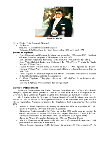 Diori HAMANI Né le 16 juin 1916 à Soudouré (Niamey) - Instituteur - Député à l’Assemblée Nationale Française - Président de la République du Niger de novembre 1960 au 15 avril 1974 Etudes et diplômes - Ecole Elémentaire et Régionale de Niamey, de septembre 1922 en mai 1929, Certificat d’Etudes Primaires Indigènes (CEPI) obtenu le 26 mai 1929 ; - Ecole primaire supérieure de Niamey (EPS) de 1929 à 1933, diplôme de l’EPS ; - Ecole Victor Ballot de Porto Novo (Dahomey) de 1933 à 1934 : 1ère année de l’Ecole Normale William Ponty ; - l’Ecole Normale William Ponty de Gorée de 1934 à 1936, diplôme de l’Ecole Normale William Ponty, section Enseignement, obtenu avec la mention Assez Bien en juin 1936 ; - 1941 : Stagiaire à Dakar alors capitale de l’Afrique Occidentale française dans le cadre de la méthode Hébert, méthode d’enseignement ; - Certificat d’Aptitude Pédagogique obtenu en 1952, diplôme de titularisation des instituteurs ; - Diplôme d’Aptitude Professionnelle de l’enseignement. Carrière professionnelle Instituteur Surnuméraire du Cadre Commun Secondaire de l’Afrique Occidentale Française, agrée par Arrêté général n° 1968 du 21 août 1936 et mis à la disposition du Gouverneur de la Colonie du Niger (il s’agit là d’une terminologie purement coloniale) ; Mis à la disposition du Directeur du Groupe Scolaire Central de Niamey par note de service du Chef de service de l’Enseignement en date du 14 septembre 1936 pour servir à l’Ecole Régionale de Niamey pour compter du 14 septembre 1936 et ce jusqu’au 30 décembre 1936 ; - Affecté à l’Ecole Supérieure de Niamey de décembre 1936 en septembre 1937 en qualité d’Adjoint au Directeur de l’Ecole Régionale ; - Détaché par Arrêté général n° 3657 du 4 novembre 1938 qui le place en position de congés hors-cadre et nommé Répétiteur des langues Haoussa et Zarma à l’Ecole Nationale de la France d’Outre Mer à Paris : de novembre 1938 à juin 1940 ; - Retour en Afrique Occidentale Française en 1940 pour Monsieur Diori ; - Mis à la disposition du Gouverneur du Niger par Arrêté général de septembre 1940 pour exercer les fonctions d’Instituteur à : - l’Ecole Primaire Supérieure (EPS) de Niamey de septembre 1940 en septembre 1944 ; - - l’Ecole Elémentaire de Filingué en qualité de Directeur de septembre 1944 en novembre 1946, date de son élection à l’Assemblée Nationale Française pour un mandat de 5 ans ; directeur de l’Ecole Primaire Elémentaire Nord de Niamey de 1951 en janvier 1956, date de son élection à l’Assemblée Nationale française. Carrière syndicale Militant et Secrétaire Général de l’Association des Enseignants du Niger (AEN) de 1937 à 1946 c’est-à-dire jusqu’à son élection en qualité de Député de la Colonie du Niger à l’Assemblée Nationale française Carrière politique Militant puis Secrétaire Général du Parti Progressiste Nigérien Section du Rassemblement Démocratique Africain (PPN RDA) jusqu’au coup d’Etat militaire du 15 avril 1974 ; Elu le 10 novembre 1946 Député du Niger à L’assemblée Nationale française sur liste du PPN. Les résultats des élections du 10 novembre 1946 sont les suivants : - Inscrits : 43 760 - Votants : 21 288 soit 48,64% - Suffrages exprimés : 20 735 - Diori Hamani, PPN RDA : 6 864 - Issoufou Saidou Djermakoye, sans étiquette : 4 911 - Roland Gougis, sans étiquette : 4 527 - Francis Borrey, Socialiste indépendant : 4 423 . Réélu le 2 janvier 1956 Député du Territoire du Niger à l’Assemblée Nationale française sur liste PPN RDA (l’autre Député du Niger est Monsieur Georges Condat de l’UNIS). Le Député Diori Hamani est élu un des Vice-présidents de l’Assemblée Nationale française (responsabilités assumées de juin 1957 jusqu’en décembre 1958, date de la proclamation de la République du Niger). Les résultats du scrutin du 2 janvier 1956 sont les suivants : - Inscrits : 697 488 - Votants : 311 361 soit 44,6% - Suffrages exprimés : 305 985 - Liste BNA : Georges M. Condat et Issoufou Saidou Djermakoye : 125 425 - Liste PPN RDA : Diori Hamani et Dan Dobi Mahamane : 82 108 - Liste UDN : Djibo Bakary et Mamani Abdoulaye : 74 107 - Liste UNIS : Zodi Ikhia et Francis Borrey : 24 345 ». - - Le Député Diori Hamani était aussi membre de l’Assemblée Parlementaire Européenne de mars en juillet 1959 ; Elu 10 novembre 1956 Conseiller Municipal de Niamey jusqu’à la dissolution du Conseil Municipal le 23 janvier 1959 ; Elu Conseiller Territorial de la Circonscription de Niamey à l’Assemblée Territoriale du Niger le 31 mars 1957. Après la victoire du OUI au référendum du 28 septembre 1958, Monsieur Diori Hamani démissionne le 9 no vembre 1958 de son poste de Conseiller Territorial (en même temps que 31 autres parlementaires) afin de rendre obligatoire la ténue d’élections législatives anticipées ; Mandat de Conseiller Territorial interrompu avec la dissolution de l’Assemblée Territoriale le 14 novembre 1958 ; - Candidat aux élections législatives anticipées du 14 Décembre 1958 dans la circonscription de Zinder (élections remportées par le parti Sawaba mais annulées par l’Assemblée Constituantes du Niger en avril 1959 ; Elu, le 18 décembre 1958, par l’Assemblée Territoriale du Niger, Président du Conseil de Gouvernement de la République du Niger qui venait d’être proclamée Par le parlement nigérien ; - 20 décembre 1958 : Elu par l’Assemblée Territoriale Premier Président du Conseil des Ministres de la République du Niger ; - Elu Député de la circonscription électorale de Zinder à l’occasion des législatives anticipées (suite à l’annulation du scrutin en avril 1959) ; - Elu, par l’Assemblée Nationale de notre pays, le 9 novembre 1960, Président de la République du Niger. Les résultats du scrutin sont les suivant : - « une seule candidature est déposée par le Bureau