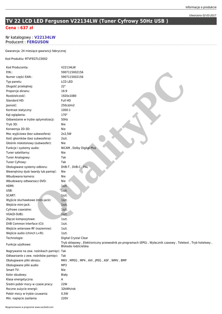 Informacje o produkcie Utworzono 02-03-2017 TV 22 LCD LED Ferguson V22134LW (Tuner Cyfrowy 50Hz USB ) Cena : 637 zł Nr katalogowy : V22134LW Producent : FERGUSON Gwarancja: 24 miesiące gwarancji fabrycznej P/N:: 5907115002156 Numer części EAN:: 5907115002156 Typ panelu: LCD LED Długość przekątnej: 22" Proporcje ekranu: 16:9 Rozdzielczość: 1920x1080 Standard HD: Full HD Jasność: 250cd/m2 Kontrast statyczny: 1000:1 Kąt oglądania: 170° Odświeżanie w trybie optymalizacji: 50Hz Tryb 3D: Nie Konwersja 2D-3D: Nie Moc wyjściowa (bez subwoofera): 2x2,5W Ilość głosników (bez subwoofera): 2szt. Głośnik niskotonowy (subwoofer): Nie Funkcje i systemy audio: NICAM , Dolby Digital Plus Tuner satelitarny: Nie Tuner Analogowy: Tuner Cyfrowy: Tak Tak Obsługiwane systemy odbioru: DVB-T , DVB-C , PAL Wewnętrzny dysk twardy lub pamięć: Nie Wbudowana kamera: Nie Wbudowany odtwarzacz DVD: Nie HDMI: 1szt. USB: yP V22134LW ua lit Kod Producenta: C Kod Produktu: RTVFEGTLC0002 1szt. SCART: 1szt. 1szt. Wejście mini-jack: 1szt. Q Wyjście słuchawkowe (mini-jack): Cyfrowe coaxialne: 1szt. VGA(D-SUB): 1szt. Złącze kompozytowe: 1szt. DVB Common Interface (CI): 1szt. Wejście antenowe RF (naziemne): 1szt. Wejście audio (chinch L+R): 1szt. Technologie: Digital Crystal Clear Funkcje użytkowe: Tryb sklepowy , Elektroniczny przewodnik po programach (EPG) , Wyłacznik czasowy , Teletext , Tryb hotelowy , Blokada rodzicielska Nagrywanie na zew. nośnikach pamięci: Tak Odtwarzanie z zew. nośników pamięci: Tak Obsługiwane pliki obrazu: MKV , MPEG , MP4 , AVI , JPEG , ASF , WMV , BMP Obsługiwane pliki audio: MP3 Smart TV: Nie Kolor obudowy: Biały Klasa energetyczna: A Średni pobór mocy w czasie pracy: 22W Roczne zużycie energii: 32kWh/rok Pobór mocy w trybie czuwania: 0,5W Min. napięcie zasilania: 220V Wygenerowano w programie www.oscGold.com 240V Waga bez podstawy: 3kg Wymiary z podstawą (Szer/Wys/Gł): 517x352x132mm Wymiary bez podstawy (Szer/Wys/Gł): 517x317x35mm Pilot: Tak Typ baterii: AAA Instrukcja obsługi: Tak Język instrukcji obsługi: polski Karta gwarancyjna: Tak Kraje objęte gwarancją: Polska Okres gwarancji: 24mies. Zgodność z normami: Odbiornik cyfrowy jest zgodny z wymaganiami określonymi w przepisach dotyczących wymagań technicznych i eksploatacyjnych dla urządzeń konsumenckich służących do odbioru cyfrowych naziemnych transmisji telewizyjnych w tym na terytorium RP. Strona www produktu: http://www.ferguson-digital.e... Q ua lit yP C Maks. napięcie zasilania: