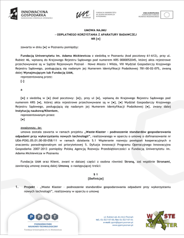 UMOWA NAJMU - ODPŁATNEGO KORZYSTANIA Z APARATURY BADAWCZEJ NR [●] zawarta w dniu [●] w Poznaniu pomiędzy: Fundacją Uniwersytetu im. Adama Mickiewicza z siedzibą w Poznaniu (kod pocztowy 61-612), przy ul. Rubież 46, wpisaną do Krajowego Rejestru Sądowego pod numerem KRS 0000052045, której akta rejestrowe przechowywane są w Sądzie Rejonowym Poznań – Nowe Miasto i Wilda, VIII Wydział Gospodarczy Krajowego Rejestru Sądowego, posługującą się nadanym jej Numerem Identyfikacji Podatkowej 781-00-02-075, zwaną dalej Wynajmującym lub Fundacją UAM, reprezentowaną przez: [-] a [●] z siedzibą w [●] (kod pocztowy: [●]), przy ul [●], wpisaną do Krajowego Rejestru Sądowego pod numerem KRS [●], której akta rejestrowe przechowywane są w [●], [●] Wydział Gospodarczy Krajowego Rejestru Sądowego, posługującą się nadanym jej Numerem Identyfikacji Podatkowej [●], zwany dalej Instytucją naukową/Klientem, reprezentowanym przez: [●] zważywszy, że: umowa została zawarta w ramach projektu „Waste-Klaster – podnoszenie standardów gospodarowania odpadami przy wykorzystaniu nowych technologii”, realizowanego w oparciu o umowę o dofinansowanie nr UDA-POIG.05.01.00-00-058/11 w ramach działania 5.1 Wspieranie rozwoju powiązań kooperacyjnych o znaczeniu ponadregionalnym osi priorytetowej 5. Dyfuzja innowacji Programu Operacyjnego Innowacyjna Gospodarka 2007-2013 pomiędzy Polską Agencją Rozwoju Przedsiębiorczości a Fundacją Uniwersytetu im. Adama Mickiewicza w Poznaniu Fundacja UAM oraz Klient, zwani w dalszej części z osobna również Stroną, zaś wspólnie Stronami, zawierają umowę zwaną dalej Umową o następującej treści: §1 [Definicje] 1. Projekt – „Waste Klaster – podnoszenie standardów gospodarowania odpadami przy wykorzystaniu nowych technologii”, realizowany w oparciu o umowę 2. 3. o dofinansowanie nr UDA-POIG .05.01.00-00-058/11 w ramach działania 5.1 Wspieranie rozwoju powiązań kooperacyjnych o znaczeniu ponadregionalnym osi priorytetowej 5. Dyfuzja innowacji Programu Operacyjnego Innowacyjna Gospodarka 2007 – 2013 pomiędzy Polską Agencją Rozwoju Przedsiębiorczości a Fundacją Uniwersytetu im. Adama Mickiewicza w Poznaniu. Korzystający – osoba fizyczna (przedstawiciel Klienta), upoważniona do używania Aparatury; Nadzorujący – pracownik Wynajmującego, upoważniony przez Wynajmującego do nadzorowania 4. sposobu używania Aparatury przez Korzystającego i Klienta; Laboratorium – pomieszczenia laboratoryjne utworzone i wyposażone w ramach projektu Waste-Klaster 5. zlokalizowane w budynku przy ul. Rubież 46 E w Poznaniu. Aparatura – sprzęt badawczy, pomocniczy oraz analityczno-pomiarowy zakupiony w ramach projektu Waste-Klaster i oddany przez Wynajmującego do używania w Laboratorium, a także oddany do używania poza Laboratorium – Aparatura przenośna. 6. Pomoc de minimis – pomoc świadczona na podstawie przepisów powszechnie obowiązujących, w tym w szczególności Rozporządzenia Komisji Europejskiej nr 1407/2013 z dnia 18 grudnia 2013 roku w sprawie stosowania art. 107 i 108 Traktatu o funkcjonowaniu Unii Europejskiej do pomocy de minimis, na podstawie Umowy o dofinansowanie, Regulaminie Waste Klaster oraz Zasadach przyznawania pomocy de minimis w ramach projektu „Waste Klaster – podnoszenie standardów gospodarowania odpadami przy wykorzystywaniu nowych technologii” (Poznań 2012); §2 [Oświadczenia] 1. 2. 3. 4. 5. Wynajmujący oświadcza, że Aparatura jest zdatna do użycia zgodnie z jej przeznaczeniem i celem, któremu ma służyć. Klient oświadcza, że jest członkiem powiązania kooperacyjnego Waste – Klaster koordynowanego przez Poznański Park Naukowo – Technologiczny Fundacji Uniwersytetu im. Adama Mickiewicza w Poznaniu; Klient oświadcza, że zapoznał się ze stanem technicznym Aparatury i nie zgłasza żadnych zastrzeżeń co do poprawności jej działania. Klient oświadcza, że Korzystający z Aparatury posiadają odpowiednie kwalifikacje zawodowe oraz doświadczenie konieczne do obsługi poszczególnych urządzeń stanowiących część Aparatury. Klient oświadcza, że zawiera niniejszą Umowę do celów działalności gospodarczej i w związku z tym świadczenie uzyskane na podstawie niniejszej umowy stanowić będzie dla Klienta pomoc publiczną, o której mowa w art. 107 ust. 1 Traktatu o funkcjonowaniu Unii Europejskiej (tekst skonsolidowany Dz. Urz. UE 2010 C 83, s. 1) (dawny art. 87 ust. 1 Traktatu ustanawiającego Wspólnotę Europejską (tekst skonsolidowany Dz. Urz. UE 2006 C 321 E, s. 37, z późń. zm.)). §3 [Przedmiot umowy] 1. 2. 3. 4. 5. 6. 7. Wynajmujący zobowiązuje się oddać do używania Klientowi zgodnie z przeznaczeniem oraz postanowieniami niniejszej Umowy Aparaturę znajdującą się w Laboratorium oraz Aparaturę przenośną do korzystania poza Laboratorium, natomiast Klient zobowiązuje się do zapłaty na rzecz Wynajmującego czynszu ustalonego i obliczonego zgodnie z zasadami i stawkami określonymi w załączniku nr 6 do niniejszej Umowy. W imieniu Klienta z Aparatury korzystać będą wyłącznie Korzystający określeni w Załączeniu nr 5 do Umowy. Wynajmujący nie dostarcza odczynników, próbek ani żadnych innych materiałów eksploatacyjnych niezbędnych do korzystania z Aparatury. Korzystający prowadzić będzie badania używając własnych próbek, odczynników oraz innych materiałów eksploatacyjnych służących do przeprowadzenia badań. W przypadku zaistnienia potrzeby wykorzystania przez Korzystającego z materiałów Wynajmującego, Korzystający będzie zobowiązany do pokrycia kosztów zużytych materiałów. Wynajmujący wyznaczy osobę Nadzorującego, który zobowiązany będzie do nadzorowania sposobu korzystania z Aparatury przez Korzystającego. Urządzenia, wchodzące w skład Aparatury objęte są gwarancją producenta lub dostawcę urządzeń. §4 [Sposób używania i korzystania z Aparatury] 1. 2. 