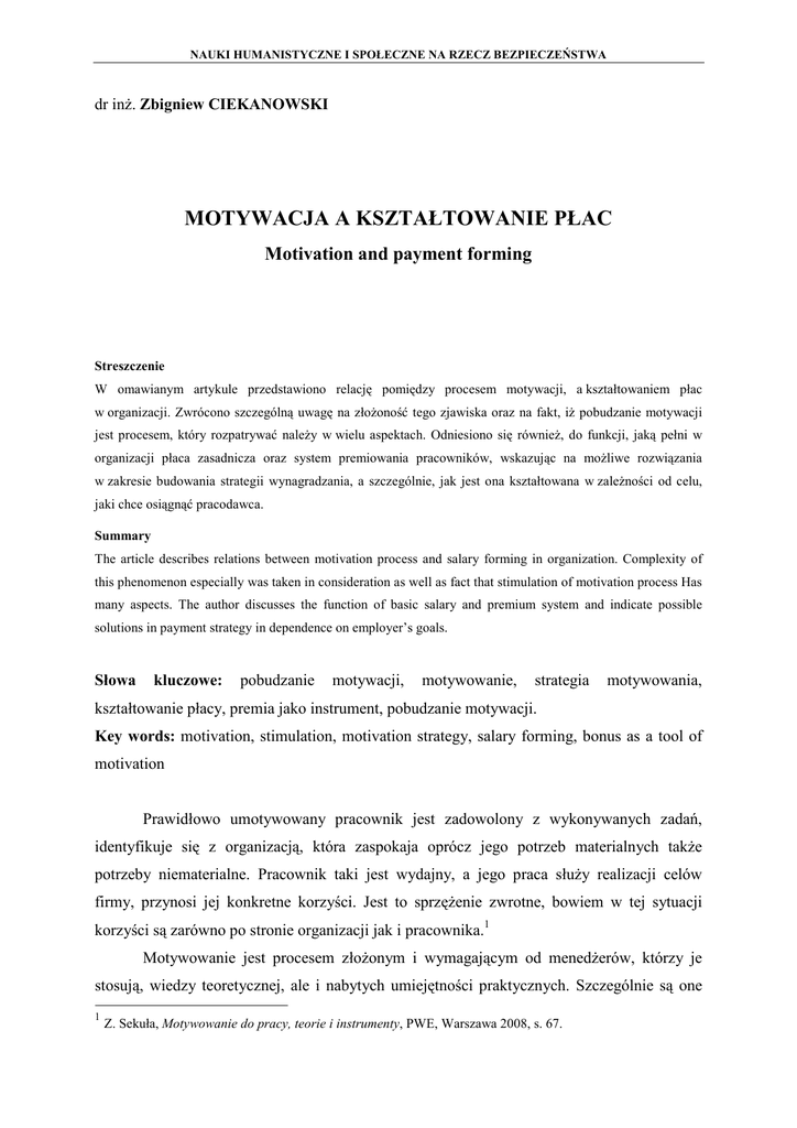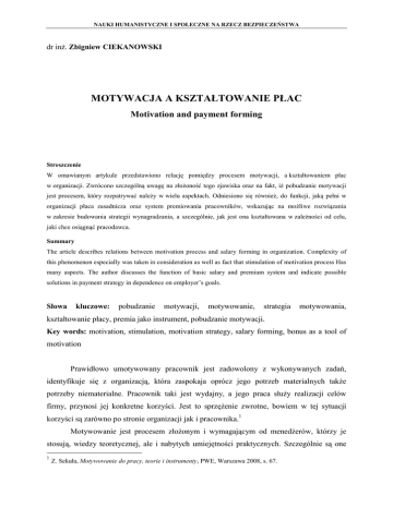 NAUKI HUMANISTYCZNE I SPOŁECZNE NA RZECZ BEZPIECZEŃSTWA dr inż. Zbigniew CIEKANOWSKI MOTYWACJA A KSZTAŁTOWANIE PŁAC Motivation and payment forming Streszczenie W omawianym artykule przedstawiono relację pomiędzy procesem motywacji, a kształtowaniem płac w organizacji. Zwrócono szczególną uwagę na złożoność tego zjawiska oraz na fakt, iż pobudzanie motywacji jest procesem, który rozpatrywać należy w wielu aspektach. Odniesiono się również, do funkcji, jaką pełni w organizacji płaca zasadnicza oraz system premiowania pracowników, wskazując na możliwe rozwiązania w zakresie budowania strategii wynagradzania, a szczególnie, jak jest ona kształtowana w zależności od celu, jaki chce osiągnąć pracodawca. Summary The article describes relations between motivation process and salary forming in organization. Complexity of this phenomenon especially was taken in consideration as well as fact that stimulation of motivation process Has many aspects. The author discusses the function of basic salary and premium system and indicate possible solutions in payment strategy in dependence on employer’s goals. Słowa kluczowe: pobudzanie motywacji, motywowanie, strategia motywowania, kształtowanie płacy, premia jako instrument, pobudzanie motywacji. Key words: motivation, stimulation, motivation strategy, salary forming, bonus as a tool of motivation Prawidłowo umotywowany pracownik jest zadowolony z wykonywanych zadań, identyfikuje się z organizacją, która zaspokaja oprócz jego potrzeb materialnych także potrzeby niematerialne. Pracownik taki jest wydajny, a jego praca służy realizacji celów firmy, przynosi jej konkretne korzyści. Jest to sprzężenie zwrotne, bowiem w tej sytuacji korzyści są zarówno po stronie organizacji jak i pracownika.1 Motywowanie jest procesem złożonym i wymagającym od menedżerów, którzy je stosują, wiedzy teoretycznej, ale i nabytych umiejętności praktycznych. Szczególnie są one 1 Z. Sekuła, Motywowanie do pracy, teorie i instrumenty, PWE, Warszawa 2008, s. 67. NAUKI HUMANISTYCZNE I SPOŁECZNE NA RZECZ BEZPIECZEŃSTWA ważne w nawiązywaniu kontaktów interpersonalnych z pracownikami, w sposobie postępowania z nimi, ale umiejętności praktyczne rozciągają się również na umiejętne kreowanie własnego wizerunku przez przełożonego. Musi on wiedzieć, jaki ten wizerunek powinien być, aby przystawał on do wybranej przez niego, w danym momencie, metody motywowania pracowników. Motywacja jest problemem złożonym, ale jednocześnie na tyle istotnym, iż pozostaje w zainteresowaniu wielu dziedzin nauki. Szczególnym zainteresowaniem cieszy się ona wśród psychologów, którzy położyli podwaliny pod wiele teorii z zakresu motywacji i motywowania. Wielość tych teorii ukazuje, że dokładne zdefiniowanie procesów zachodzących w człowieku i jego otoczeniu, we wzajemnych relacji miedzy pracownikiem i pracodawcą, a także poszczególnymi składnikami szeroko pojętego środowiska pracy, w kontekście motywacji, ciągle pozostaje sprawą otwartą. Pobudzanie motywacji w organizacji Pobudzanie motywacji jest procesem złożonym, który rozpatrywać należy w wielu aspektach. Jest to w głównej mierze spowodowane tym, iż każdy człowiek posiada swój własny autonomiczny system wartości, w którym mieszczą się zarówno wartości ogólnoludzkie – uniwersalne, jak i osobiste – jednostkowe. Wartości te są uzależnione od jego aspiracji życiowych, potrzeb, które odczuwa, czy wreszcie od jego indywidualności. Bogactwo i konstrukcja tego systemu wartości „wpływa na to, jak postrzega on otaczającą go rzeczywistość i jak ją ocenia, jakie podejmuje decyzje i jak działa, na co i w jakim rozmiarze przeznacza i gotów jest przeznaczyć swój czas, wysiłek i uczucie, jak traktuje swoje otoczenie: rodzinę, kolegów w pracy, przełożonych”.2 Wartości, o których jest mowa, często przekładają się na sposób pracy danego człowieka w organizacji i ściśle go z nią wiążą. Związek ten ma charakter sprzężenia zwrotnego, które polega na tym, iż wartości określają oczekiwania pracowników wobec organizacji, a sposób, w jaki ona funkcjonuje i osiągane przez nią wyniki, wpływają na stopień realizacji tych wartości. W celu pobudzenia motywacji, należy stworzyć warunki, w których będzie możliwe zaspokojenie zróżnicowanych potrzeb, a więc pozyskiwanie różnych wartości, czyli tego wszystkiego, co ma rzeczywistą, „namacalną” zdolność do ich zaspokojenia. Trzeba zatem umożliwić pracownikom zaspokojenie zarówno potrzeb wzrostu, w tym także potrzeby samorealizacji, jak również potrzeb deficytu (niedoboru). W tym kontekście proces 2 Z.Jacukiewicz, System wynagrodzeń, Wyd. Poltext, Warszawa 1999, s. 23. NAUKI HUMANISTYCZNE I SPOŁECZNE NA RZECZ BEZPIECZEŃSTWA motywowania należy traktować kompleksowo i szeroko, a w żadnym wypadku nie ograniczać go tylko i wyłącznie do polityki płacowej, nawet w wypadku właściwej jej kreowania i różnicowania. Proces ten, jeżeli ma być skuteczny, musi obejmować szeroki wachlarz oddziaływań, dostosowanych do systemu wartości i oczekiwań prezentowanych przez pracowników danej organizacji. W organizacji celowo tworzone są układy będące kompozycją różnych narzędzi pobudzania, które tworzą systemy motywacyjne. Składają się one z zespołu bodźców, warunków i środków, których celem jest zachęcenie pracowników do angażowania się w wykonywaną pracę i obowiązki służbowe, w taki sposób, aby było to jak najbardziej efektywne z punktu widzenia organizacji, a jednocześnie pracownikowi dawało osobiste poczucie satysfakcji z wykonywanej pracy. System ten powinien tak funkcjonować, aby potrafił tworzyć atrakcyjne sytuacje motywacyjne, a także rozbudzał i utrwalał motywację pozytywną, zachęcając przy tym, do podejmowania działań kreatywnych, samodzielnych i przedsiębiorczych. Jest to m